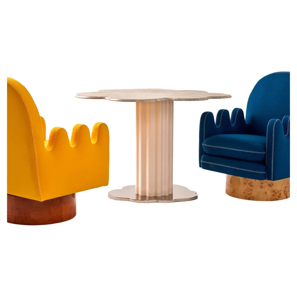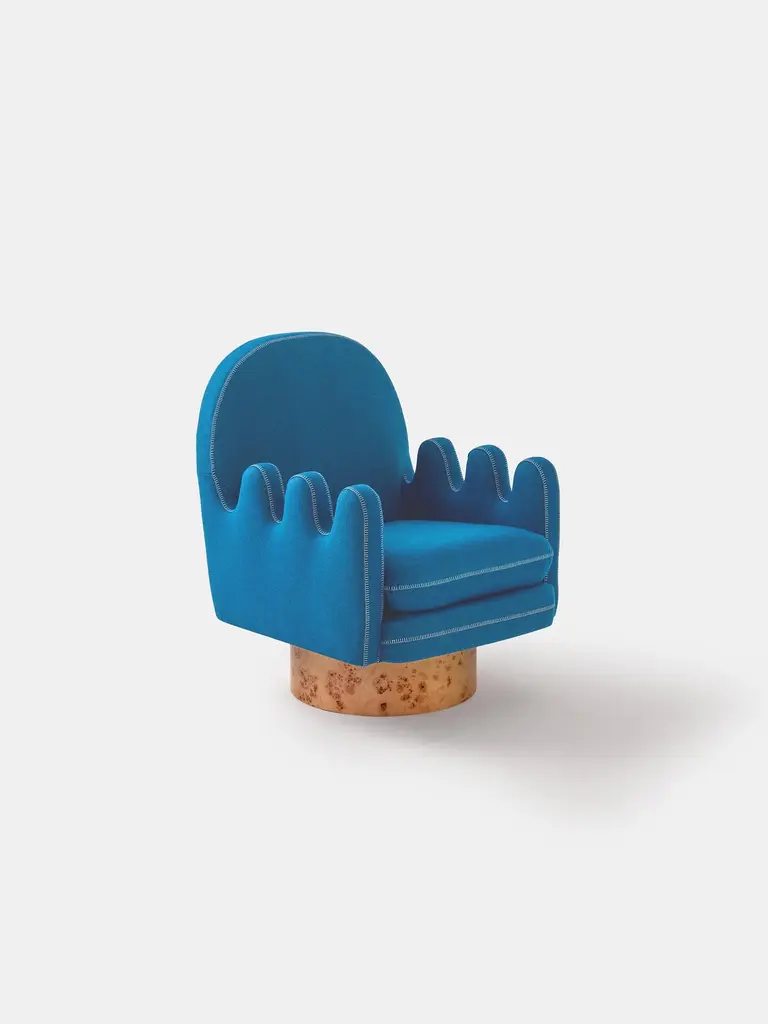 SEMO is the perfect armchair for the ultimate side sitters and for those who love to swivel. The thick finger arms are great to place your legs while you turn left and right. Semo resembles a soft baseball hand glove which offers great comfort and pleasure. It also has a feature stitch detail on the upholstered arms, seat and back. The round base part is made of polished burl wood veneer. Semo is available in different colors and wood finishes.