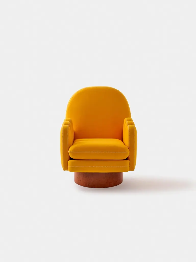 SEMO is the perfect armchair for the ultimate side sitters and for those who love to swivel. The thick finger arms are great to place your legs while you turn left and right. Semo resembles a soft baseball hand glove which offers great comfort and pleasure. It also has a feature stitch detail on the upholstered arms, seat and back. The round base part is made of polished burl wood veneer. Semo is available in different colors and wood finishes.