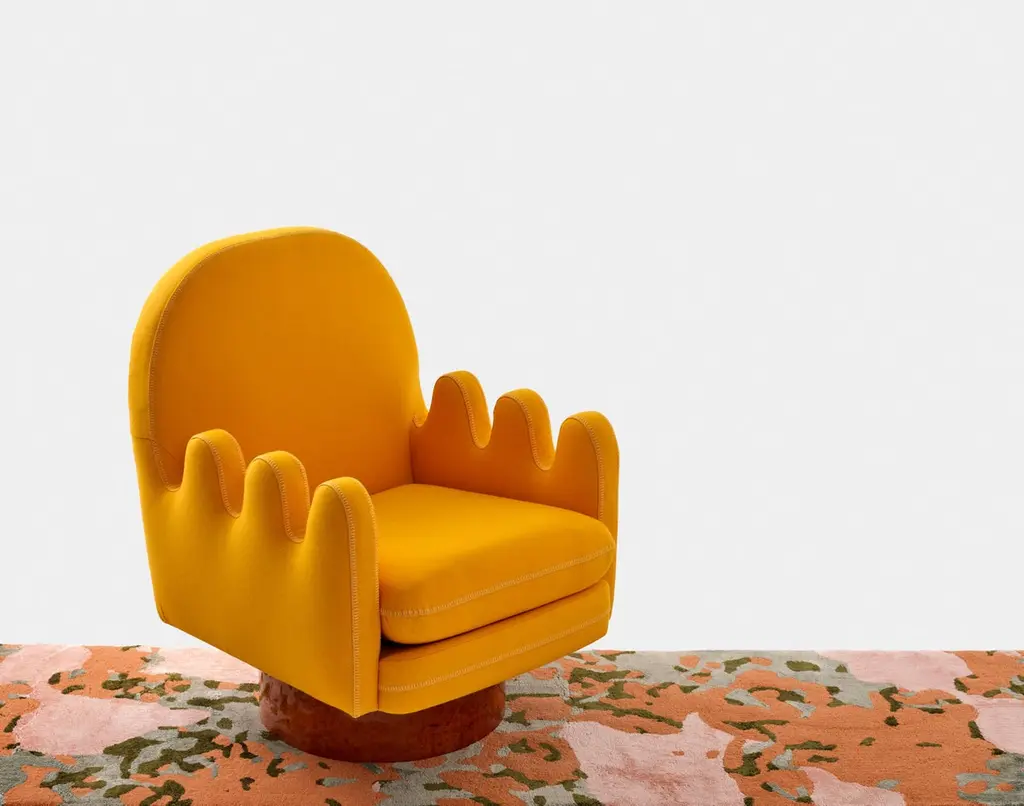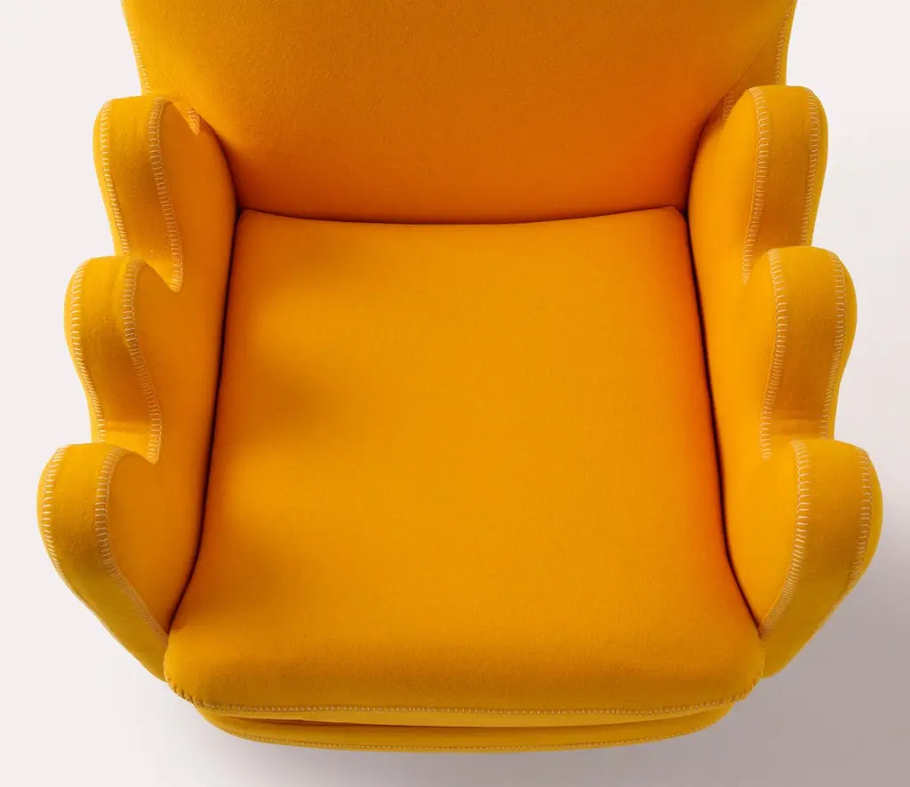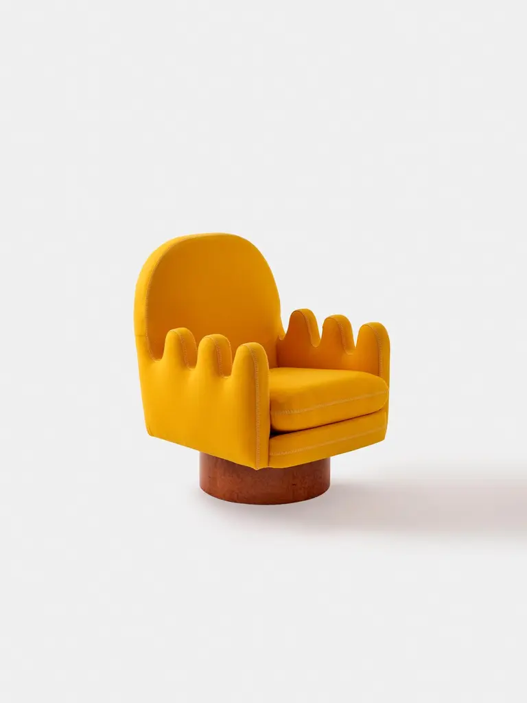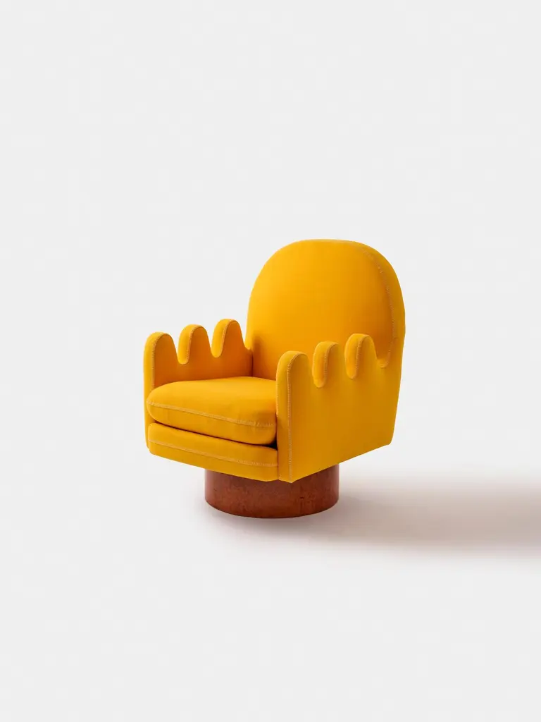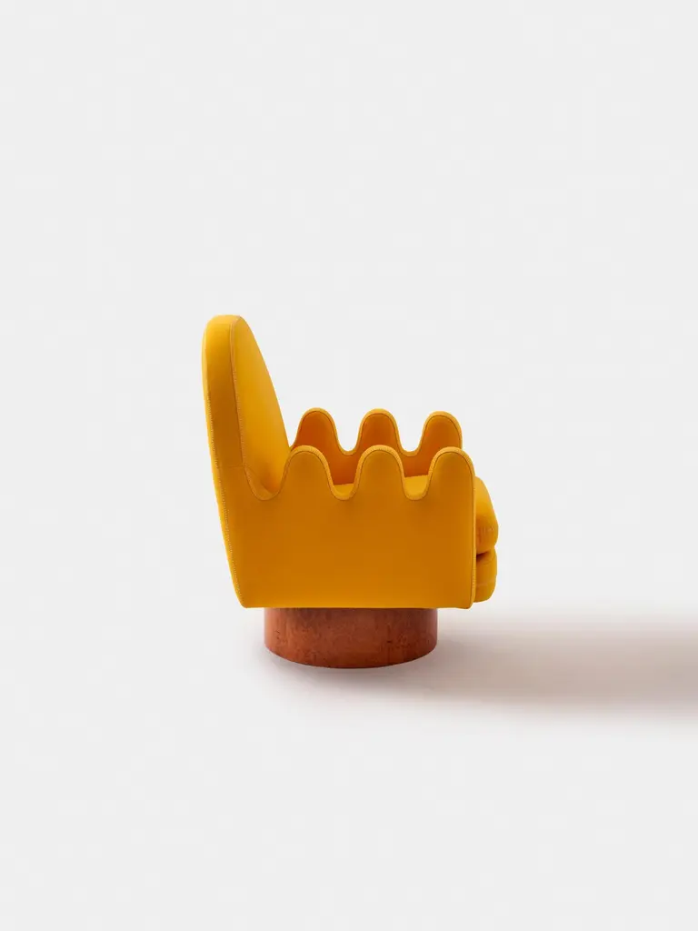 SEMO is the perfect armchair for the ultimate side sitters and for those who love to swivel. The thick finger arms are great to place your legs while you turn left and right. Semo resembles a soft baseball hand glove which offers great comfort and pleasure. It also has a feature stitch detail on the upholstered arms, seat and back. The round base part is made of polished burl wood veneer. Semo is available in different colors and wood finishes.