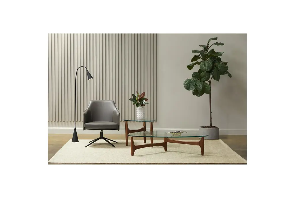 This modern Senna swivel chair features a soft leatherette upholstered seat and inner back, with a regenerated leather upholstered outer back, and a powder coated solid steel base. Assembly is required and it comes in a sleek dark gray color, perfect for any living room. This design is the perfect bedroom chair, reading chair, club chair or accent chair for living room.