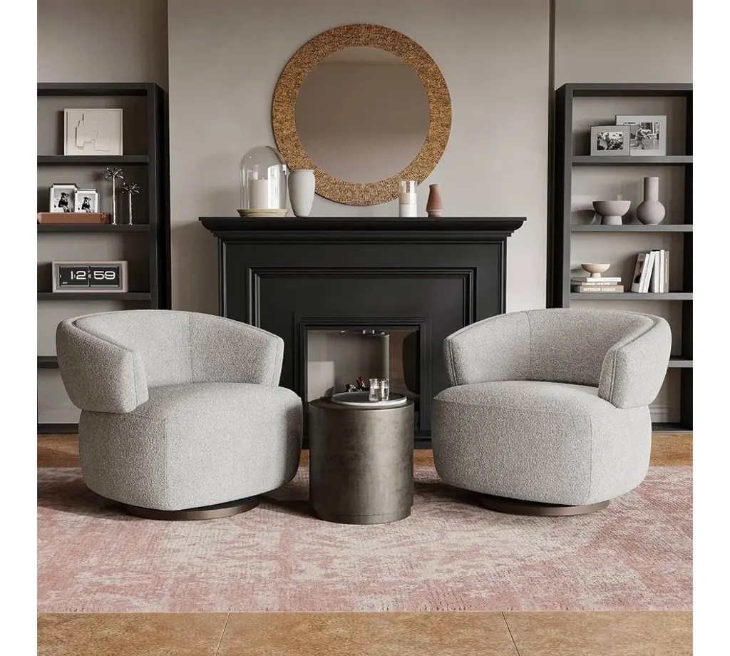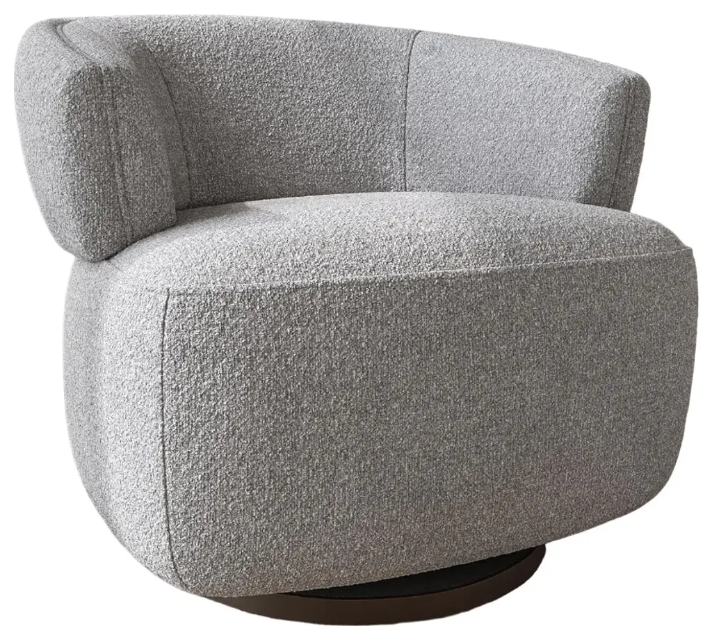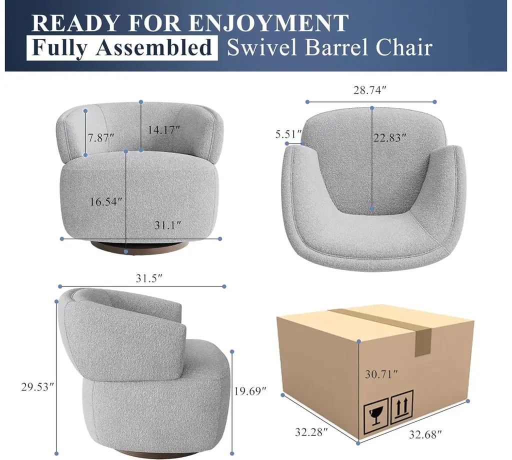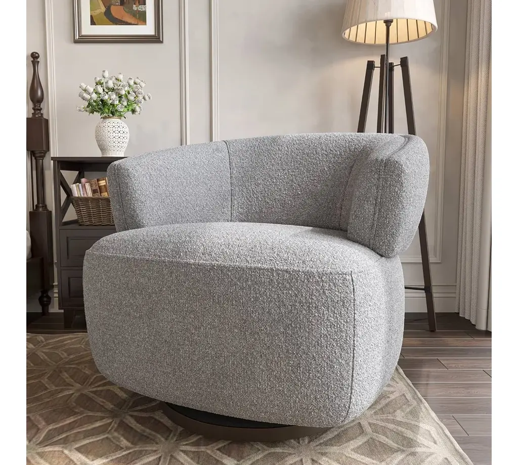Plop down into the swivel accent chair with deep seating, with your arms on the curved armrests.Sink in and let that high-density foam do its thing, it's cozy and firm, keeping its shape no matter how much you lounge.This swivel barrel chair's got a sleek and strong metal base that lets you swivel a full circle.Effortlessly shift your view, slide into chats, and be the superstar of seating flexibility. Now that's a smooth move.Constructed with a sturdy wood frame, supported by reinforced no-sag springs, and featuring a single-piece high-density foam, this lounge sofa chair is enveloped in durable fabric that remains resilient over time.