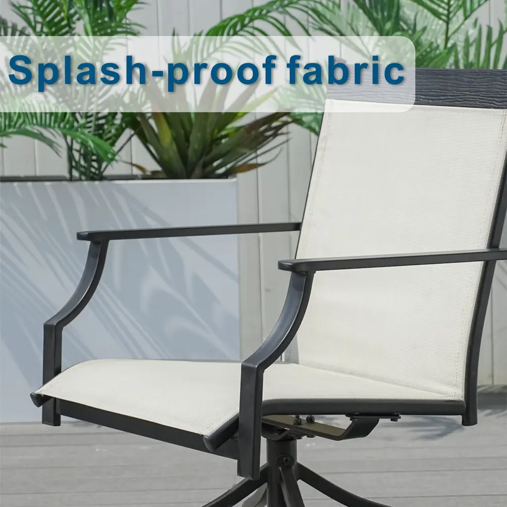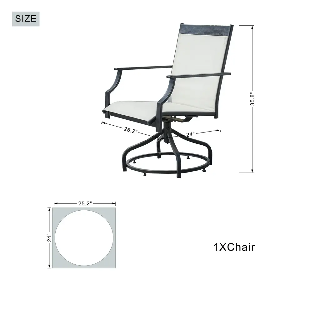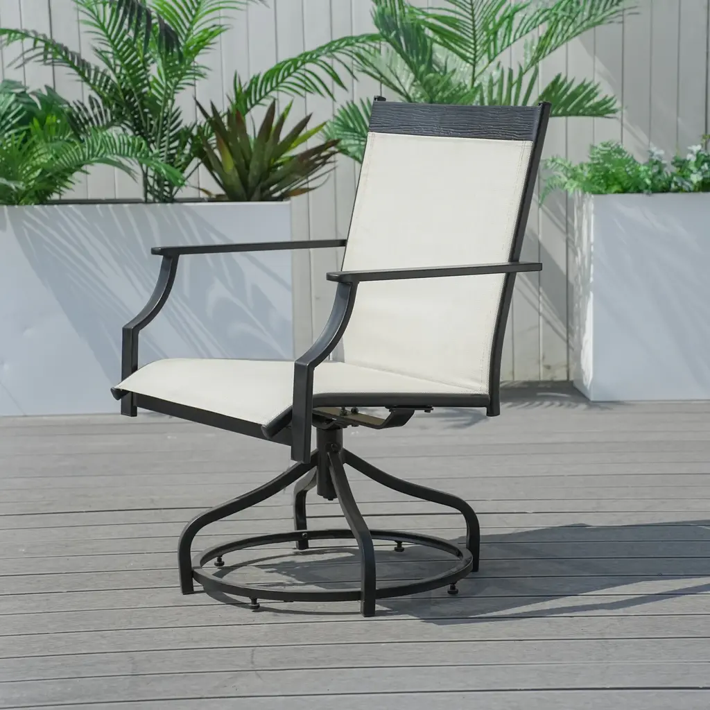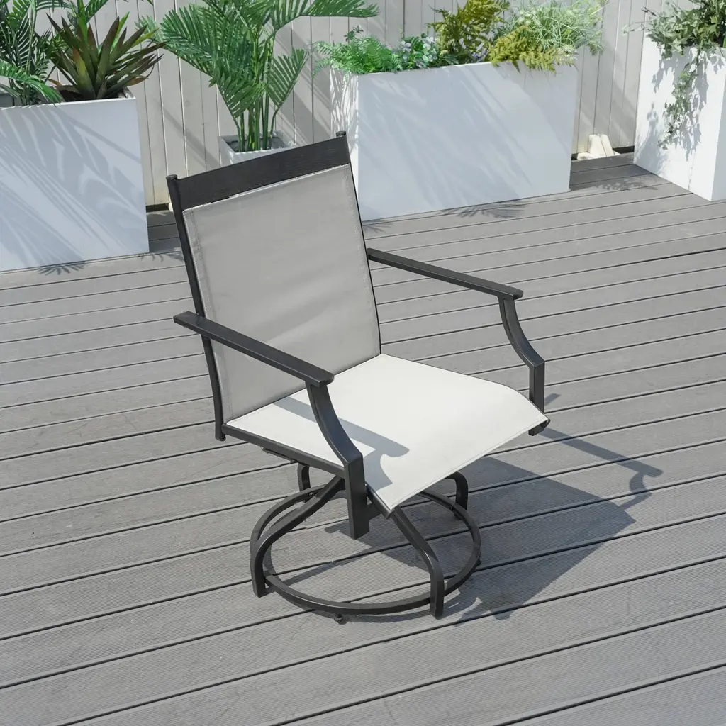 Enhance your outdoor seating experience with this set of two all-iron Textilene single swivel chairs. Designed to blend durability, comfort, and style, these chairs are a great addition to any outdoor space. The all-iron frame is not only sturdy but also lightweight, making it easy to move around as needed. This construction ensures that the chairs can withstand various weather conditions, whether it's a sunny day or a drizzle, without losing their structural integrity. The highlight of these chairs is their swivel mechanism. With a simple twist of your body, you can rotate the chair 360 degrees. This feature adds an element of convenience, allowing you to easily interact with others in your outdoor gathering. Whether you're facing the table during a meal or want to turn and enjoy the view of your garden, the smooth - gliding swivel function makes it effortless. Features:Specifications:
