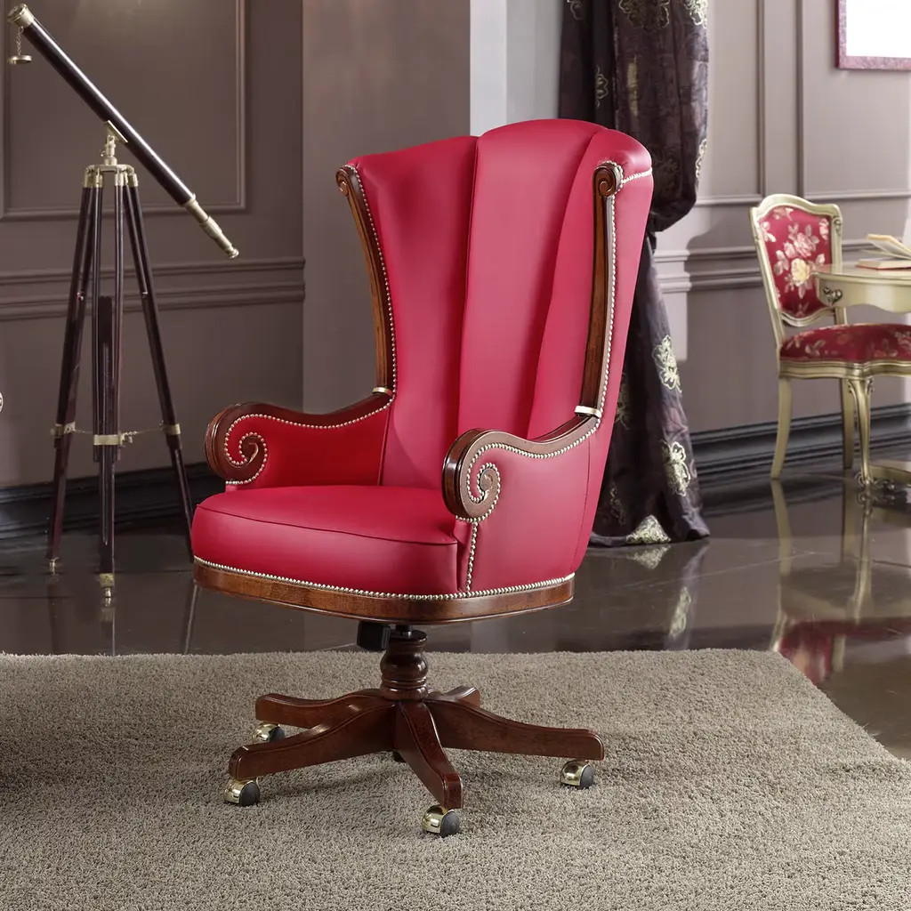 Set the tone for a productive work day with the Sidney Swivel Armchair. Inspired by traditional designs, the chair sits on an original swivel base, making it the ideal companion for a home office. The leather chair is crafted in walnut and accented with gold leaf detailing. The seat can be adjusted from 54 to 63 centimeters from the ground.