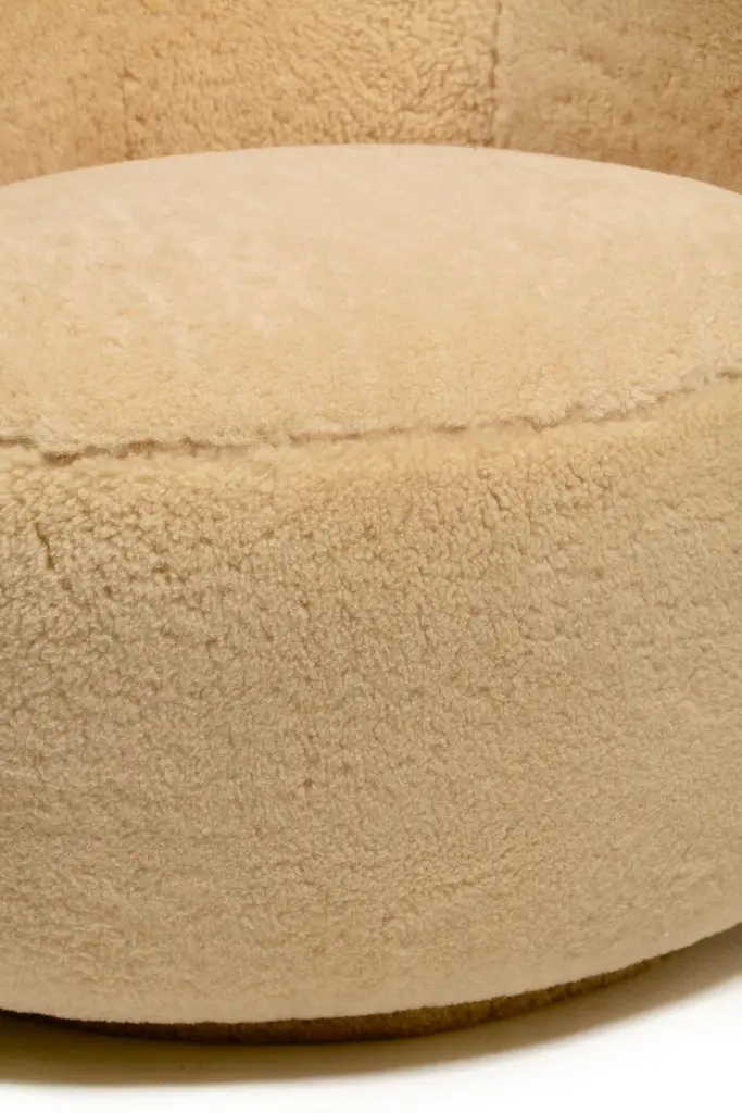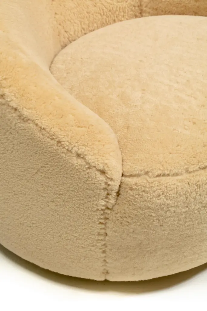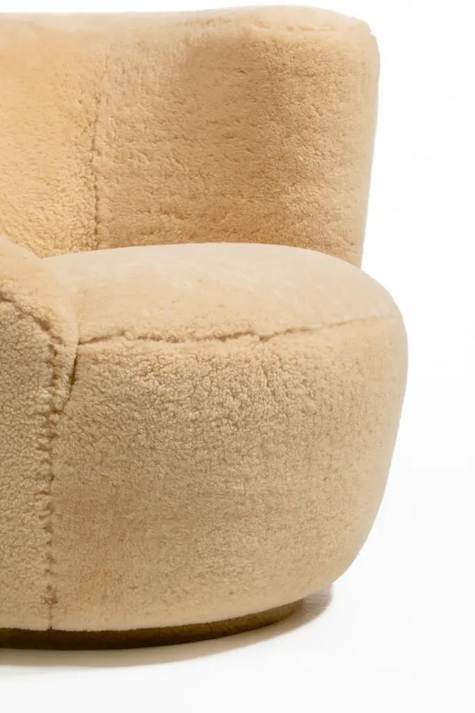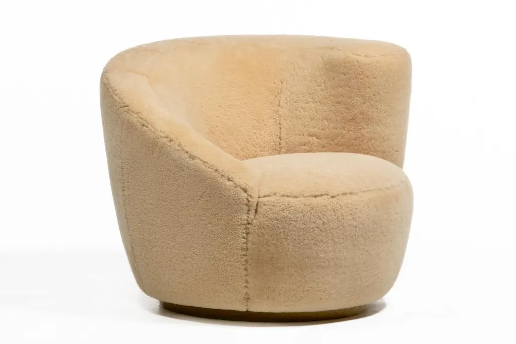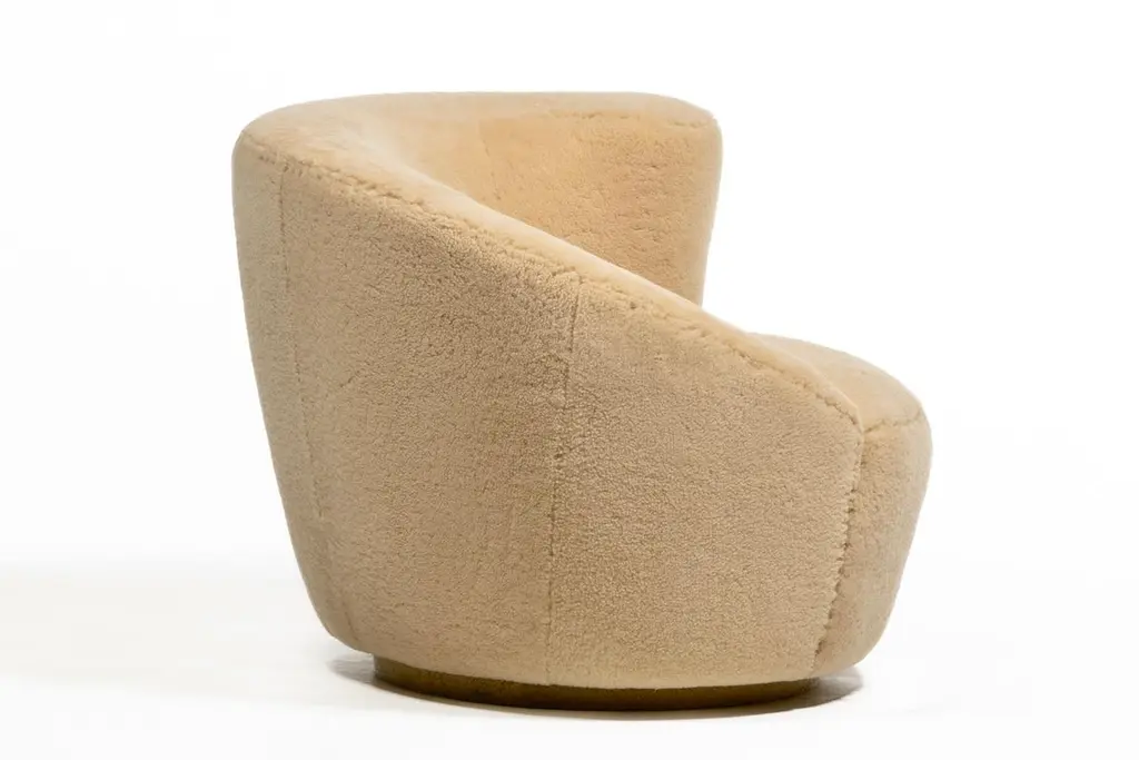 Amongst the most popular Vladimir Kagan designs, the Nautilus swivel lounge chair is iconic. Sculptural, comfortable and chic. Our shop freshly upholstered this Nautilus swivel chair in hand sewn butterscotch shearling hides that beckon. Baby soft. The new shearling upholstery is supple and luxurious, and warms up the chair's modern silhouette with a warm and inviting organic texture. Corkscrew shape with sloped back and scrolled arm. The Nautilus chair swivels making it a good choice for open floor plans - you may align your sight with any person or object in the room simply with a gentle swivel. Nautilus Swivel Chairs: 36” W x 33” D x 29” H (Seat Height 17”)Ottoman: 33” W x 21” D x 17” H