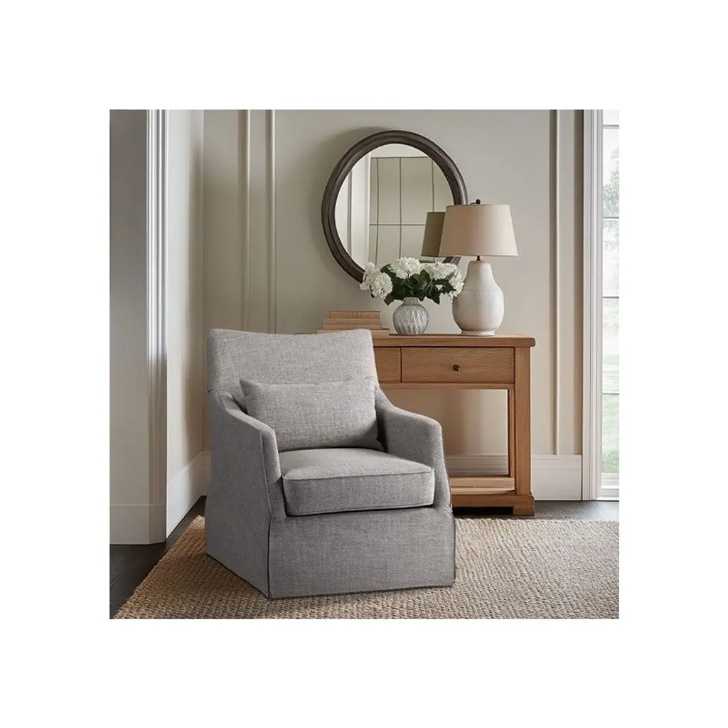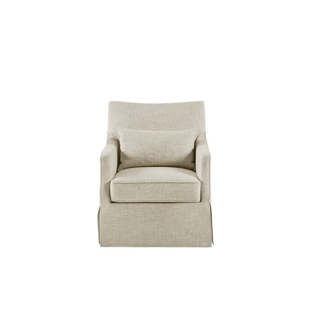 Martha Stewart Bedford Collection London Skirted Swivel chair has a Traditional aesthetic. Perfect addition to the Living Room, Entryway, or Bedroom Seat dimension 22W x 23D x 18.5H, cushion thickness 7 inches Loose seat cushion and 1pc back support pillow included High-density foam offers superior support and may feel initially firm. Over time, the foam will soften and provide optimal comfort No assembly required, fully assembled Swivels 360 degree