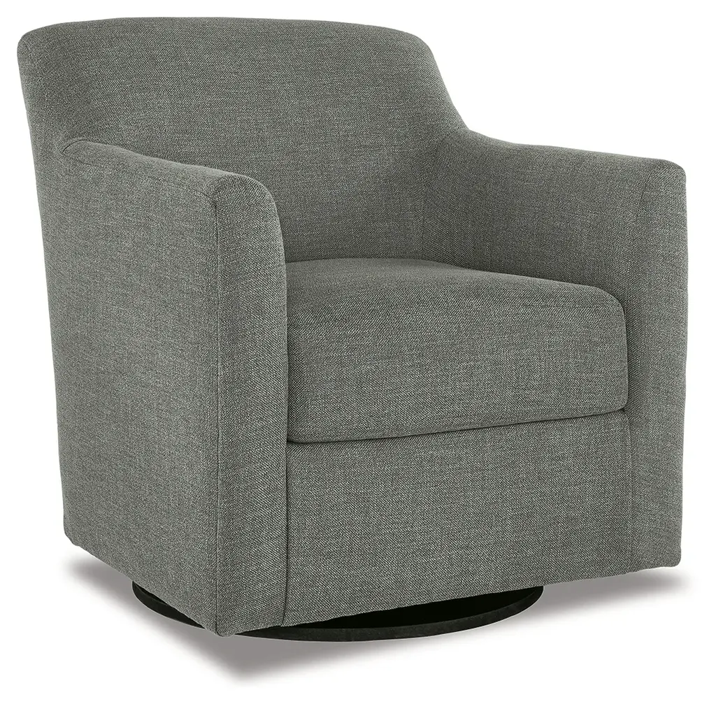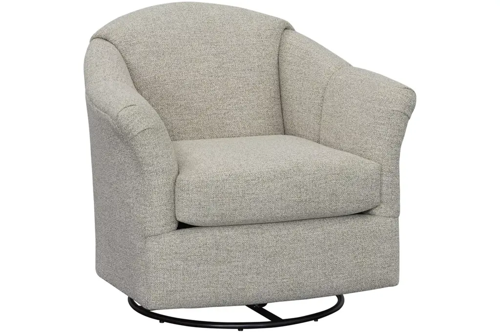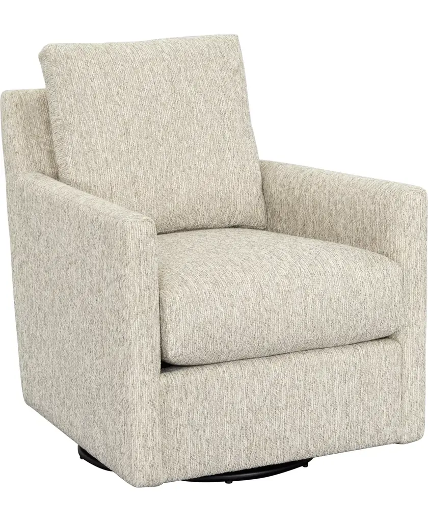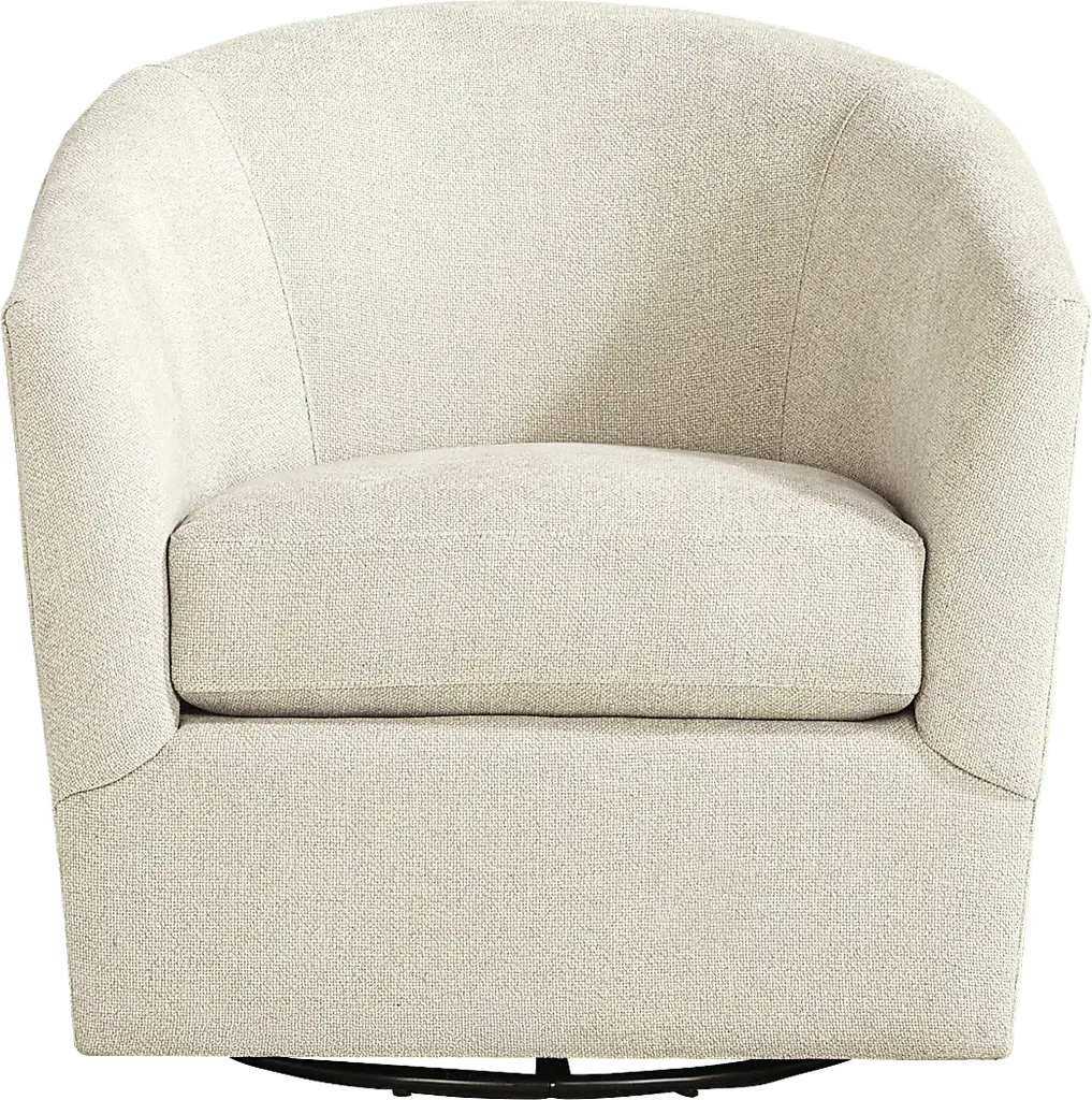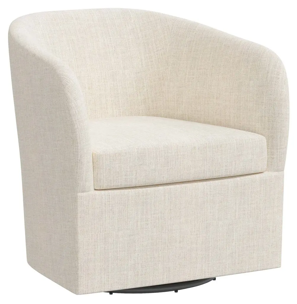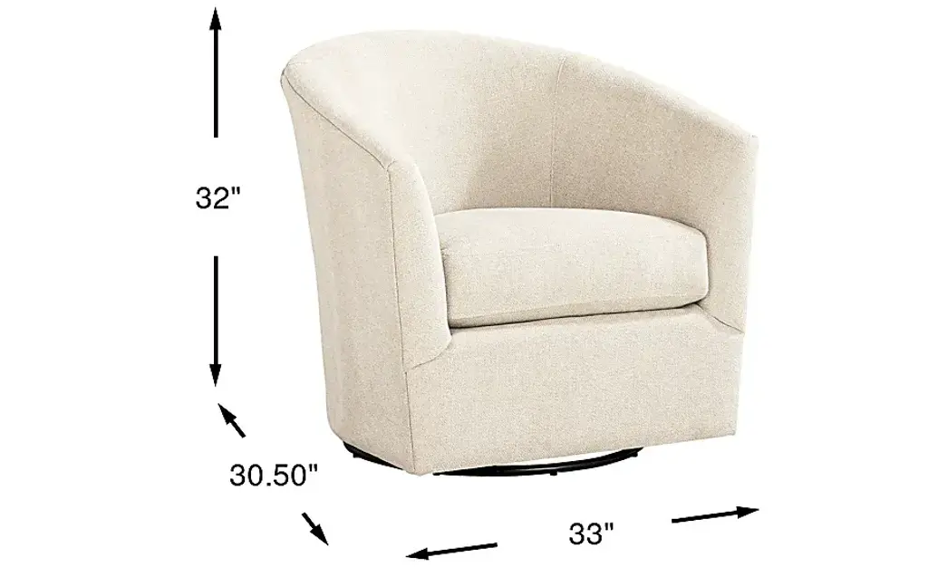Casual grace with a sly glint of fashion-forward style in the Soho Place swivel chair from Cindy Crawford Home are the keys to a trendy living room that adds an easy groove to an uptown zip. Upholstered in beige chenille, this piece features a chic barrel shape and a reversible seat cushion. Welted seams throughout give the impression of a frame, heightening the contemporary look. The 360-degree swivel base makes it easy to position and orient. Upholstery: 95% polyester, 5% linen.