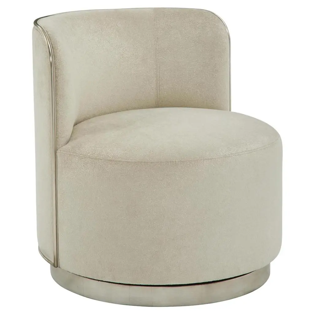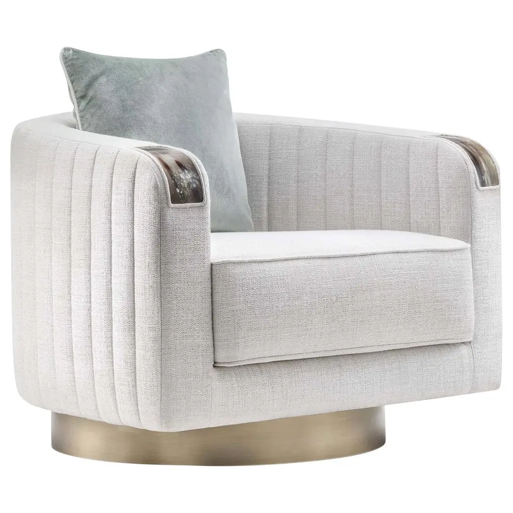 The Sonoma Swivel Chair is a gorgeous seating solution with a sleek silhouette that infuses a space with regal tones. Constructed from beech wood, the piece features exterior upholstery in a pleated Benchmark Agate 7008 fabric with nailhead trim in Nickel. The cushion and backrest are shown in Precious Metal Pewter 3056 with welt trim in Gimlet Platinum 1115. Subtle accents in a Valyrian Gold finish complete the look.