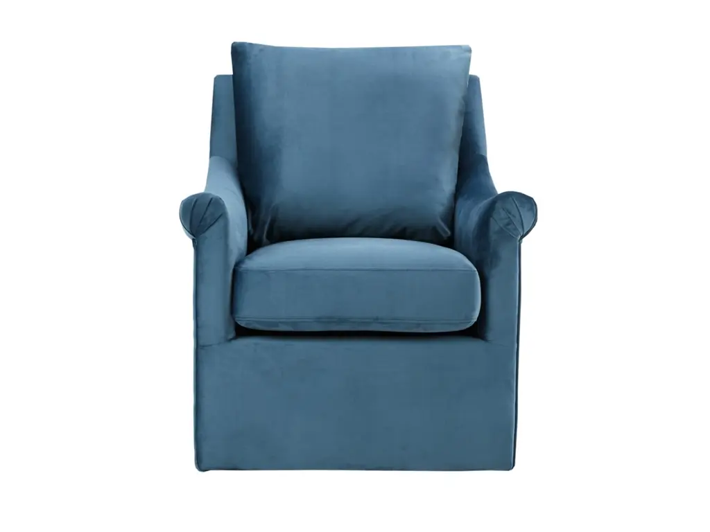 The curved arms and straight back of the Madison Park Deanna Swivel Chair adds a touch of glamour to any space. A high-density foam filling and solid wood frame provide exceptional comfort and support, while the swivel feature allows the lounge chair to rotate on its base. Upholstered in a blue velvet fabric, this swivel chair will make an eye-catching piece in your home. No assembly required.