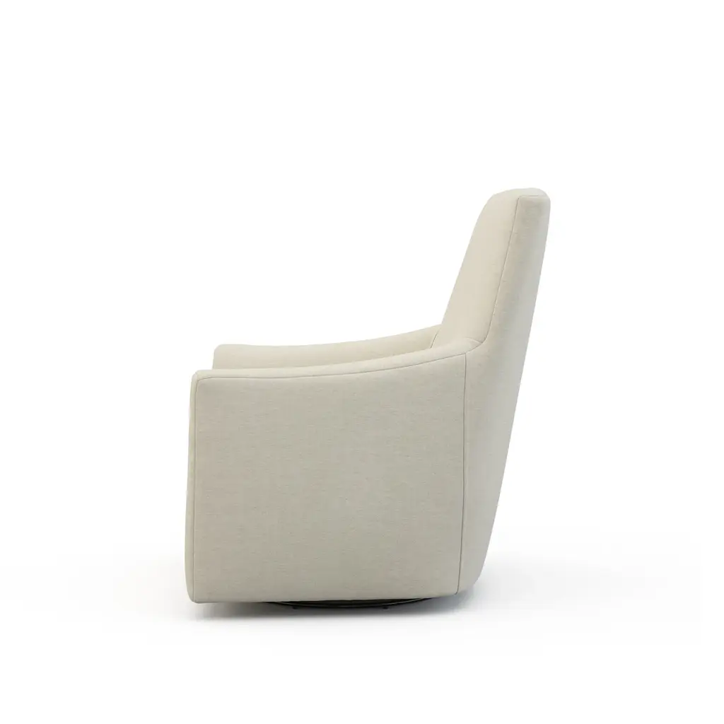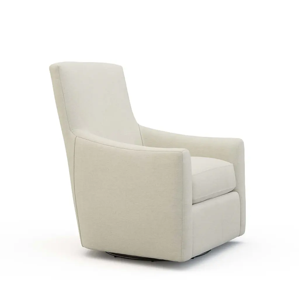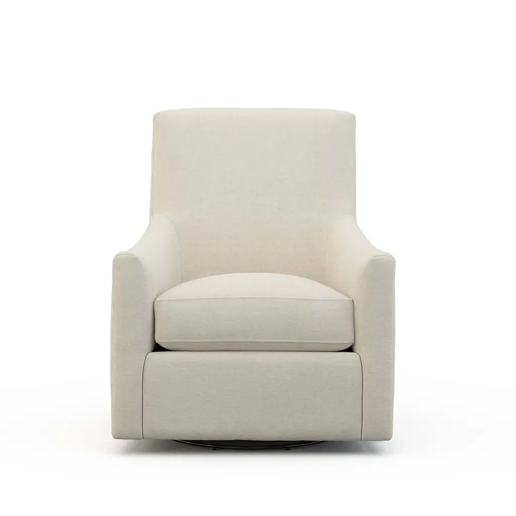 A high back pairs with a petite yet blocky frame to create the Spencer Swivel Chair, a transitional spin on a classic silhouette. The swivel base makes this chair ideal for entertaining spaces, ensuring that no one is excluded from any conversation. Ships In 8-10 Weeks Tight back One loose seat cushion As Shown Fabric: Dundee Natural If you choose to purchase COM, once you have placed your order a customer service rep will contact you regarding where to send your fabric. Please note that current lead time is 8-10 weeks once your fabric arrives at the factory, and if unused fabric is under 1.5 yards, it cannot be sent back to you.This product can be special ordered in additional fabrics, leathers, and cushion fillings. Click here to email us for for additional information about special ordering.This image is for illustrative purposes only. The colors shown are accurate within the constraints of lighting, photography, and the color accuracy of your screen.