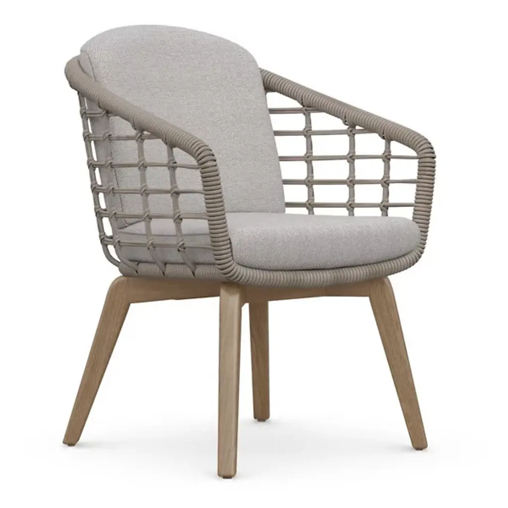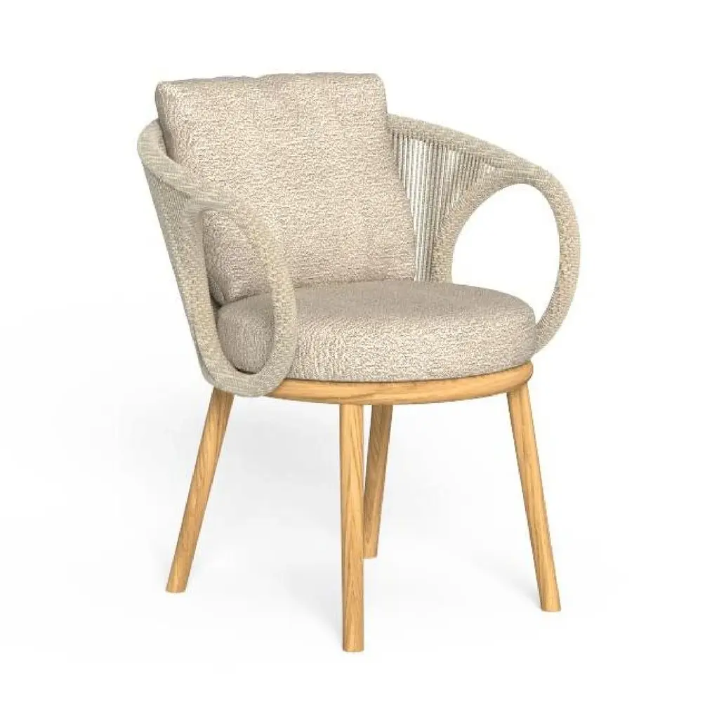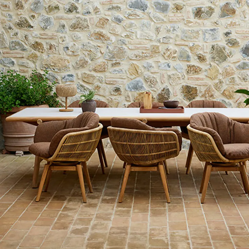 The Stay outdoor dining chair designed by Cane-line Design features a generously curved, nest-like shape that offers a cosy inviting embrace, perfect for relaxation. Its handwoven shell, made from durable Cane-line Weave®, showcases an open wicker pattern, creating a light and airy feel while ensuring UV resistance for long-lasting durability. Resting on a solid teak base with a smooth swivel function, the chair allows effortless movement without compromising stability. The plush cushions, designed with QuickDry & Airflow system , provide exceptional comfort and dry quickly after rain. Combining natural elegance with modern functionality, this chair is ideal for those seeking both style and practicality in their outdoor space.