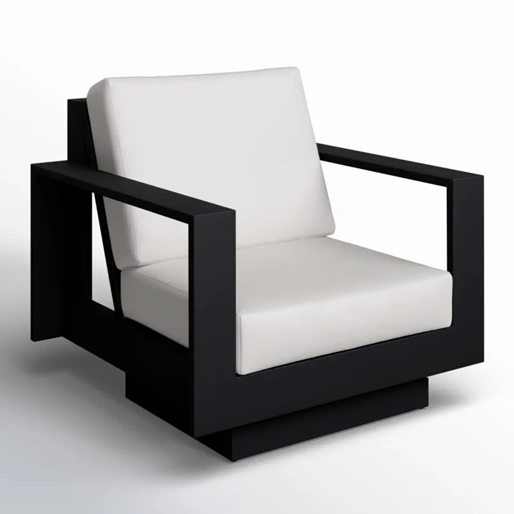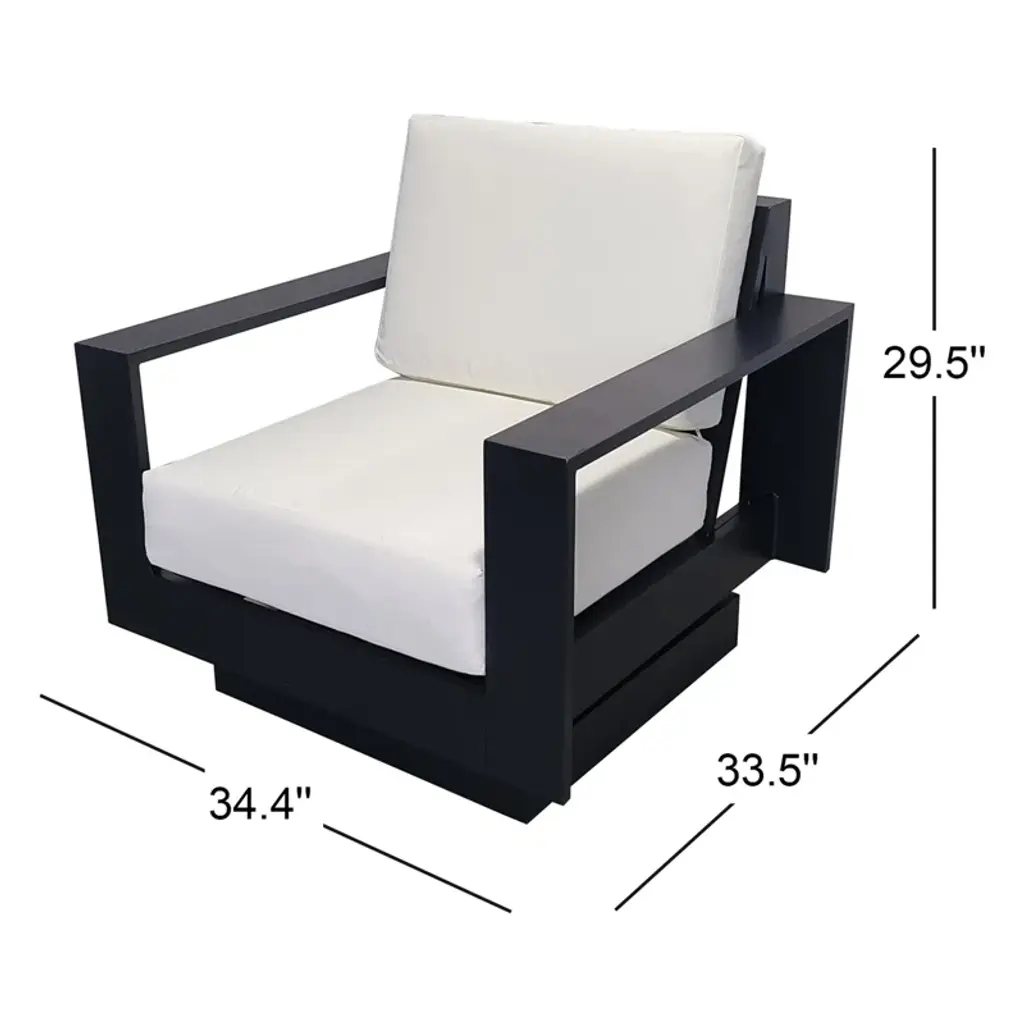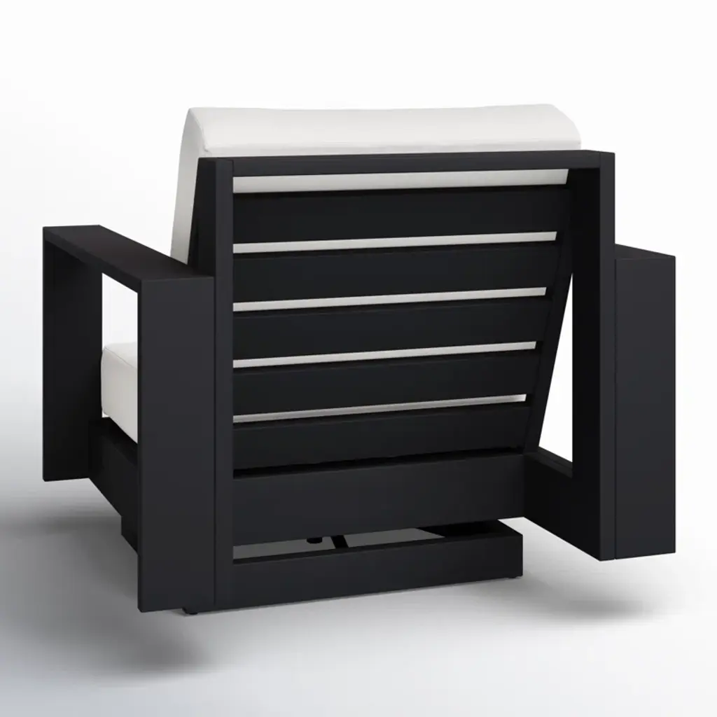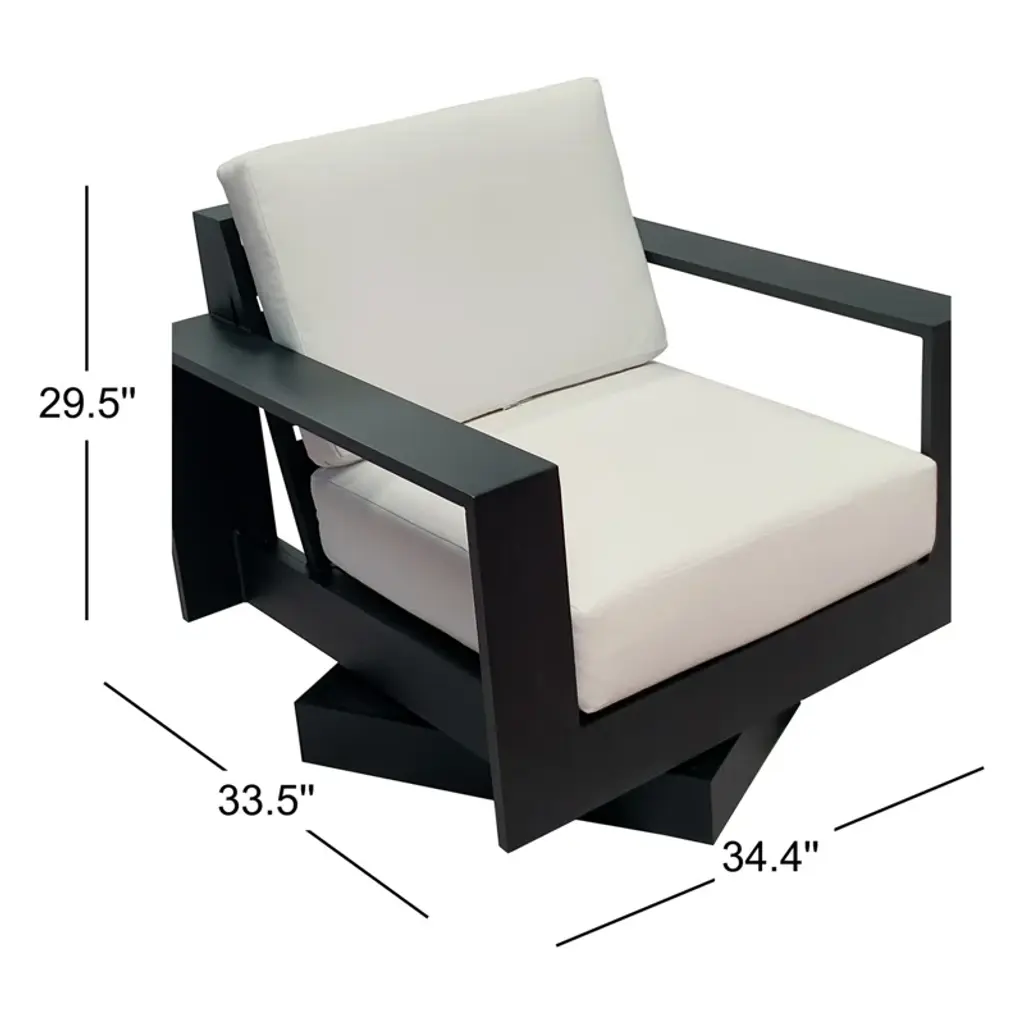 Swivel in style. Our outdoor club chair brings a mod-inspired vibe to your patio, porch, or balcony. Plus, it has a swivel base so you can keep tabs on things without leaving your seat. The sleek black aluminium frame is topped with seat and back cushions wrapped in high-performance, all-weather Sunbrella® upholstery. Rotate them for even wear and remove the covers for easy washing. Part of a collection.