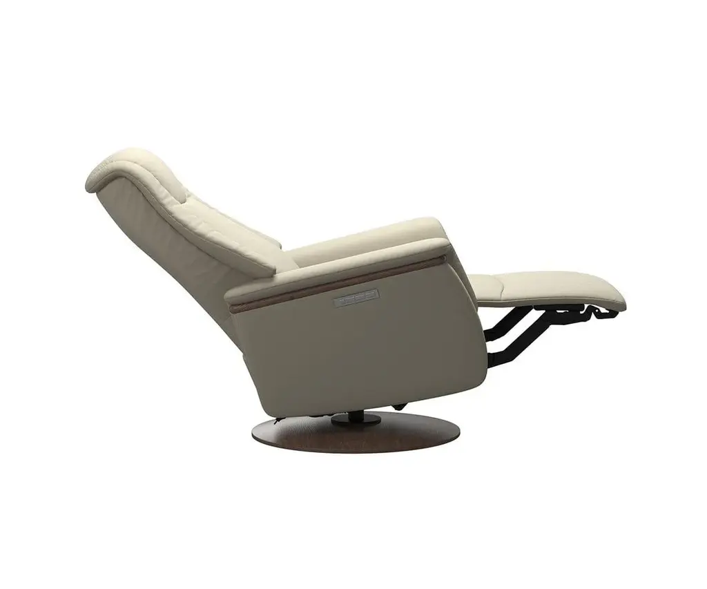 The Max Power Chair by Stressless is your go-to for instant comfort. Supple, curved padding and luxurious top-grain leather covers state-of-the-art technology designed to meet all your relaxation needs. With the simple touch of a button individually adjust the headrest, backrest and footrest of this chair, or simply enjoy reclining. Lumbar support and a rocking solid walnut base with 360 degree swivel mobility ensure that this chair keeps you seated in style while being able to effortlessly adjust your view as needed. Special order options available.