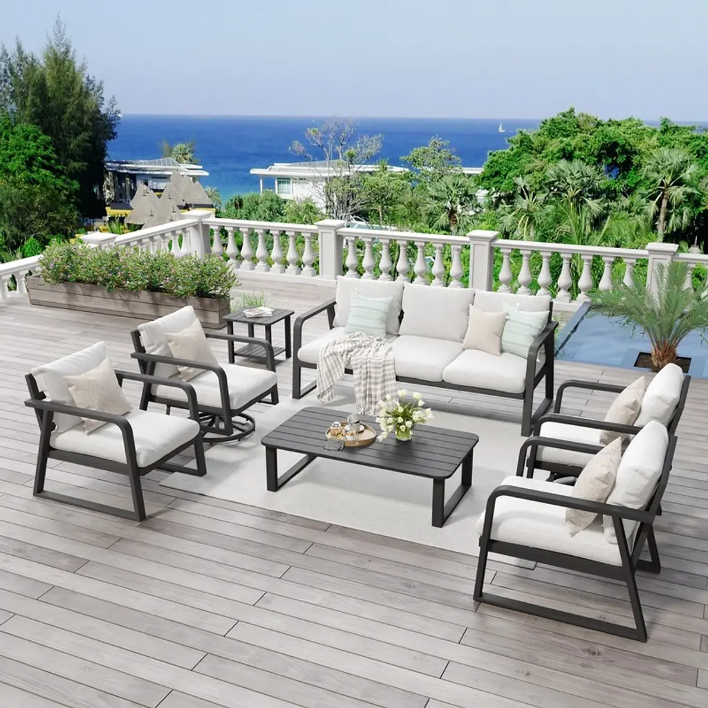 Introducing our 5-Piece Aluminum Patio Conversation Set - a perfect blend of style and durability, designed to elevate your outdoor experience throughout the year. Crafted with fashion-forward and premium materials, this set adds a touch of elegance to your patio decor. It includes a 3-person sofa, 2 swivel chairs, a coffee table and a side table, making it an ideal choice for sunrooms, gardens, balconies, and poolside areas. Made from high-quality matte black aluminum alloy, it boasts advantages such as sun resistance, waterproofness, rust resistance, insect resistance, and corrosion resistance, surpassing traditional wicker outdoor furniture in durability and aesthetic appeal. The 4-inch thick water-resistant seat cushions and soft back cushions provide a relaxed and comfortable seating experience. Easy to assemble and low maintenance, this set ensures you won't have to worry about cracks, splits, or aging. Create a comfortable and luxurious ambiance, enhancing your outdoor space with our premium aluminum patio conversation set.