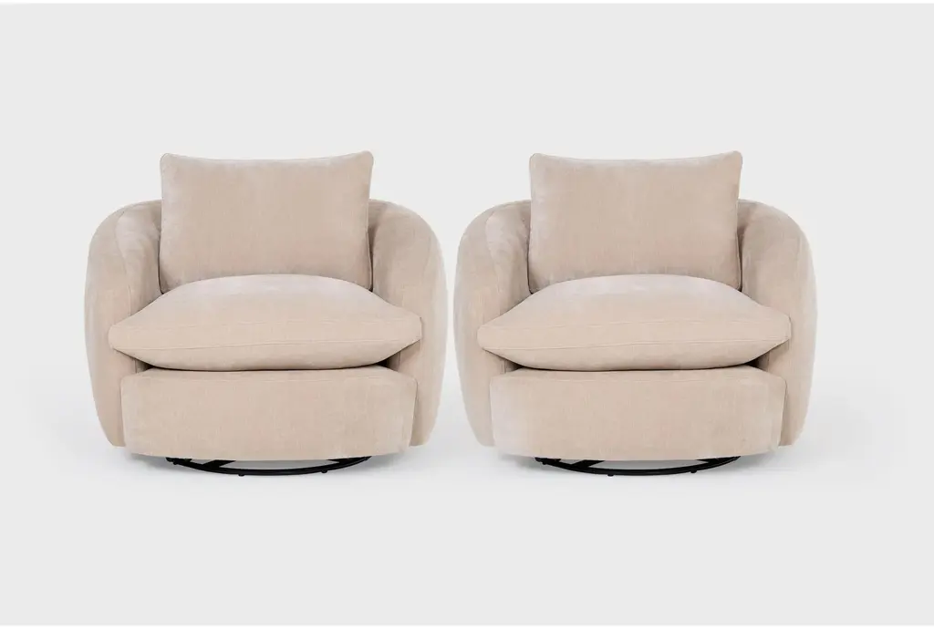 A superb pair of modern round arm swivel armchairs. Beech frames, sprung seat and newly upholstered in a premium, soft, ivory pure alpaca wool fabric, on a wooden base. Swivels 90 degrees in each direction with return mechanism. Handmade in England. Fast shipping worldwide.
