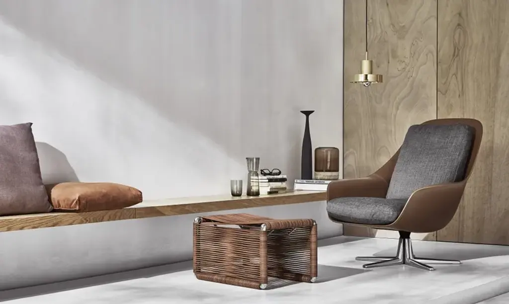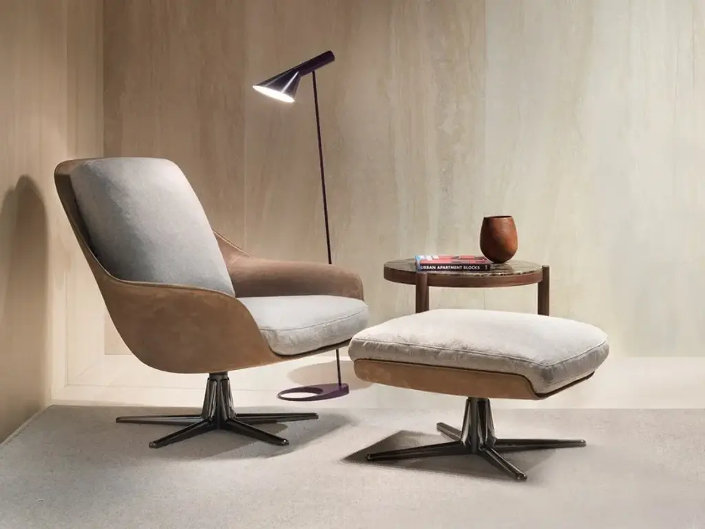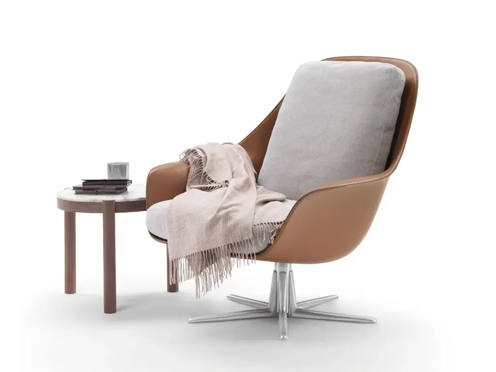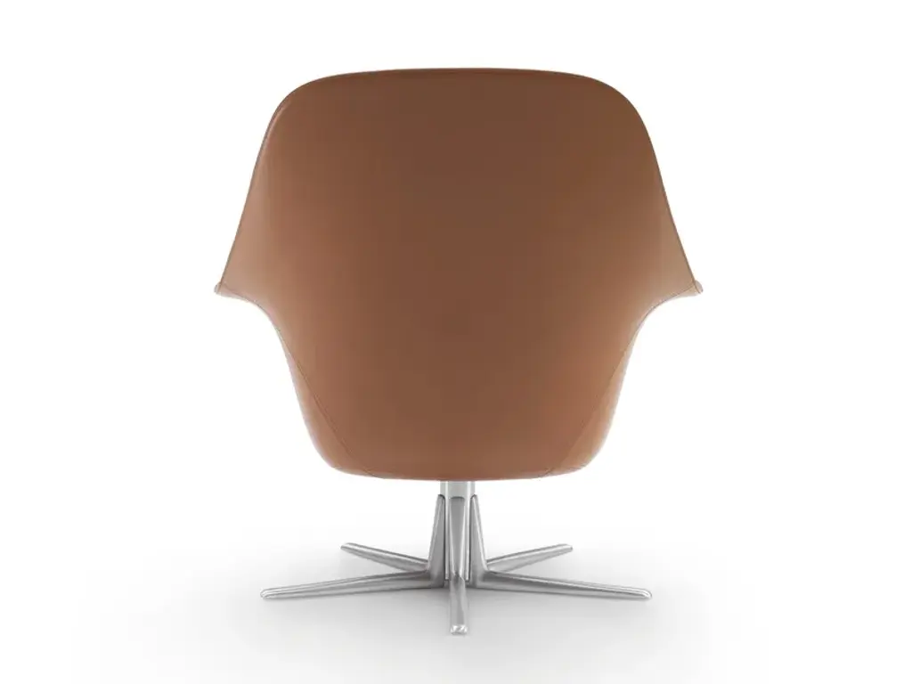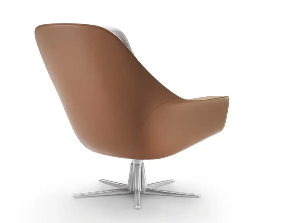 The sophisticated silhouette of the Sveva armchair reveals its unmistakable personality while silently telegraphing its generously welcoming appeal. A shapely shell made of rigid structural polyurethane and then upholstered in saddle hide accommodates the soft, goose down filled seat and seat back cushions. The cast aluminum swivel base comes in versions with four or five spokes, the latter specifically designed to meet the needs of the contract market. Finish options for the support base are: satin, chromed, burnished, black chromed and champagne finished metal. Between the saddle hide shell - available in nine colors - and the cushion upholstery options, that can be created in all the exclusive Flexform collection of fabrics and leathers, countless combinations are possible. The Sveva armchair can be paired with its own namesake ottoman. The design of the base also inspired a series of occasional tables in various sizes and in a number of finishes, including sumptuous wood, exquisite lacquer and luxurious marble. With its sophisticated yet uncomplicated lines, the Sveva armchair is a perfect match with all the sofas in the collection and is confidently at home in both residential and hospitality interiors.TECHNICAL SPECIFICATIONSFrame in rigid polyurethane covered in hide leather: white (5007), russian red (5008), olive (5006(), black (5005), dark brown (5004), dark brown extra (5013), grey (5003), sand (5001) and tobacco (5015). Also available in black suede (6005), dark brown suede (6004), olive suede (6003), sand suede (6001) Seat cushion in down with resilient inner core Backrest cushion in down with resilient inner core Feet in satined, chromed, burnished, black chromed or champagne metal with turning system. Headrest cushion down-filled Upholstery removable fabric or leather covers.MATERIALS Frame: hide leather - suede Foot: metal finishes Upholstery: cashmere - cotton - leather - nabuk - linen - mixed composition - velvet