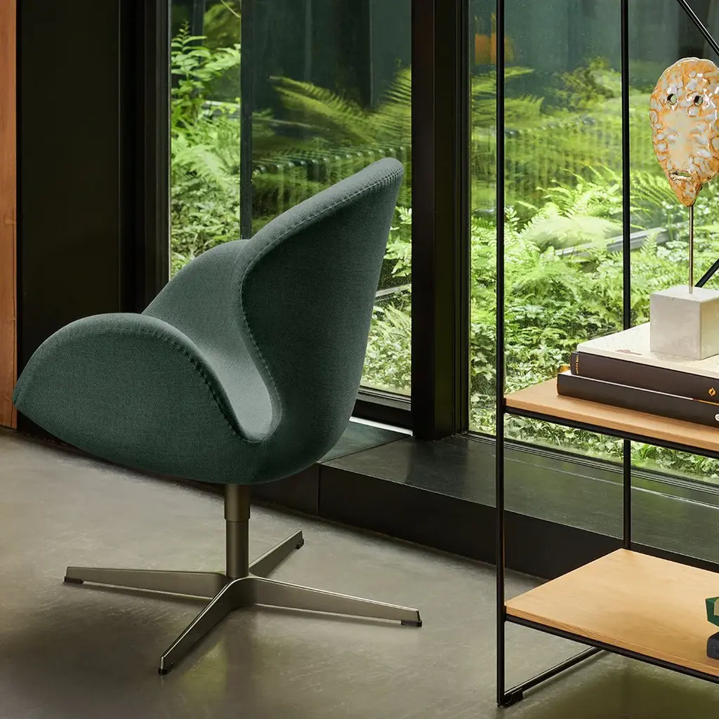 Arne Jacobsen designed The Swan Chair for the lobby and lounge areas at the Royal Hotel in Copenhagen in 1958 and it has been a design icon ever since. The Swan was a technologically innovative chair: No straight lines - only curves. A moulded shell of synthetic material on an aluminium star swivel base, with a layer of cold foam covering the shell upholstered in fabric or leather. Jacobsen built the original in own garage in Klampenborg, and the Swan Chair has been in production at Fritz Hansen ever since. The Swan is ideal for lounge and waiting areas as well as the home. Available in all Fritz Hansen fabrics and leathers. Call for information on other fabrics or to order a custom Swan Chair.