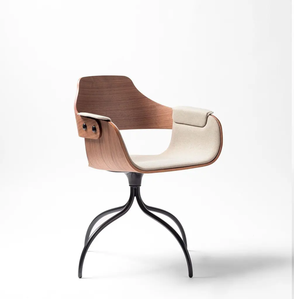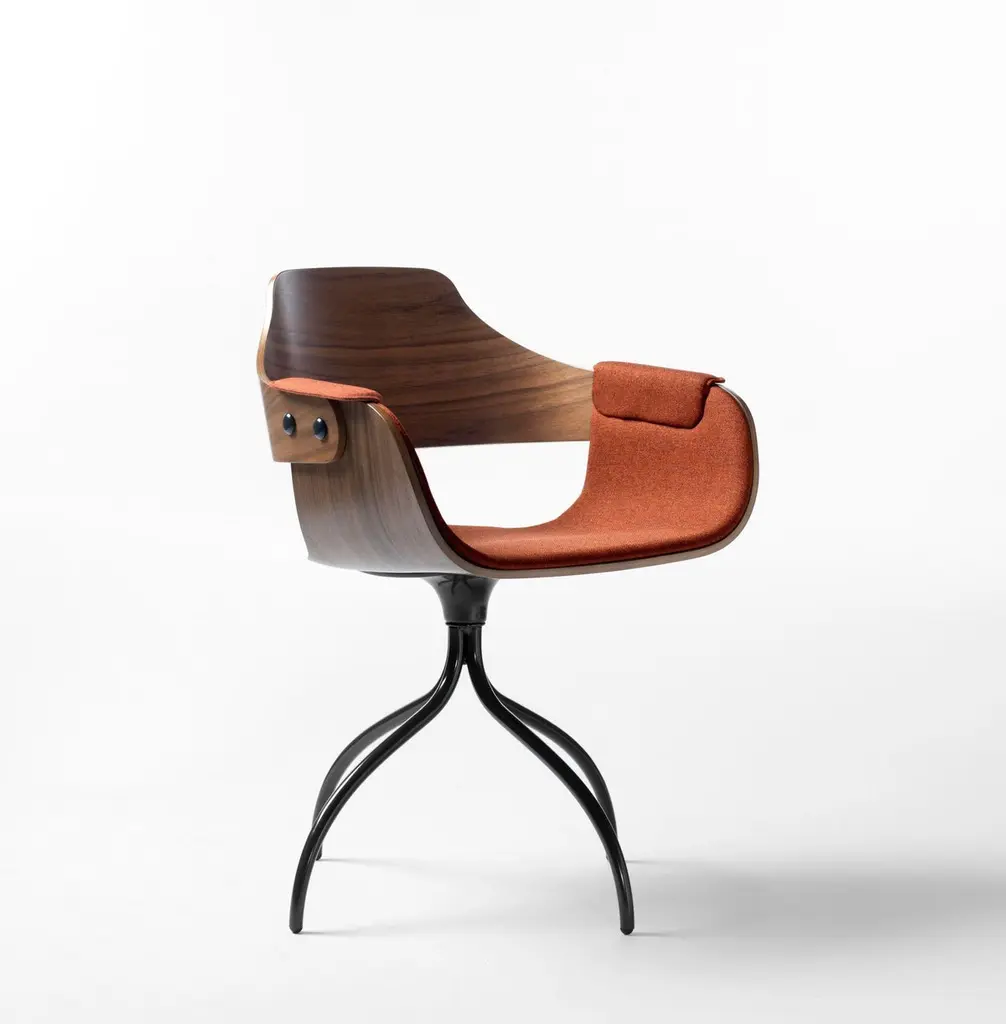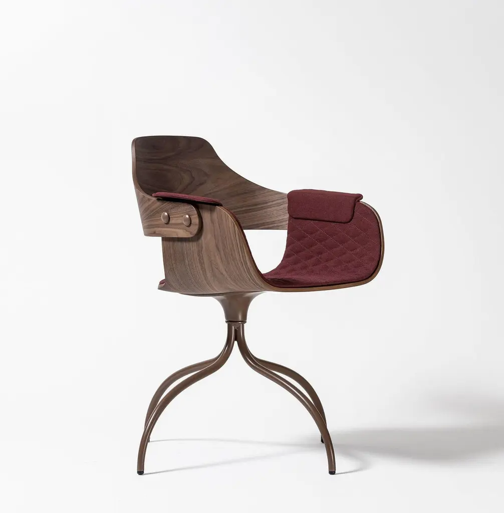 Swivel base showtime brown chair by Jaime Hayon Dimensions: D 55 x W 55 x H 79 cm Materials: Powder-coated steel or aluminum structure. Legs, seat, and backrest in plywood with exteriors in natural ash, walnut, or ash stained black. Metallic decorative buttons. Seat cushion, interior seat cushion, and backrest upholstered in different fabrics or leathers provided by BD.Available upholstered in different fabrics and in versions Showtime Nude. Four distinct leg structures, optional armrests with a wide variety of finishes - wooden or lacquered in diverse colors and upholstered in different materials and leathers by BD, which avails all possible combinations and contrasts. In 1972, a group of young architects and designers from Barcelona created BD with the aim of producing and marketing furniture and other objects for our projects, with complete creative freedom and with a criterion that has turned out to be quite different from the norm at companies in the sector, regarding both the shape and function.