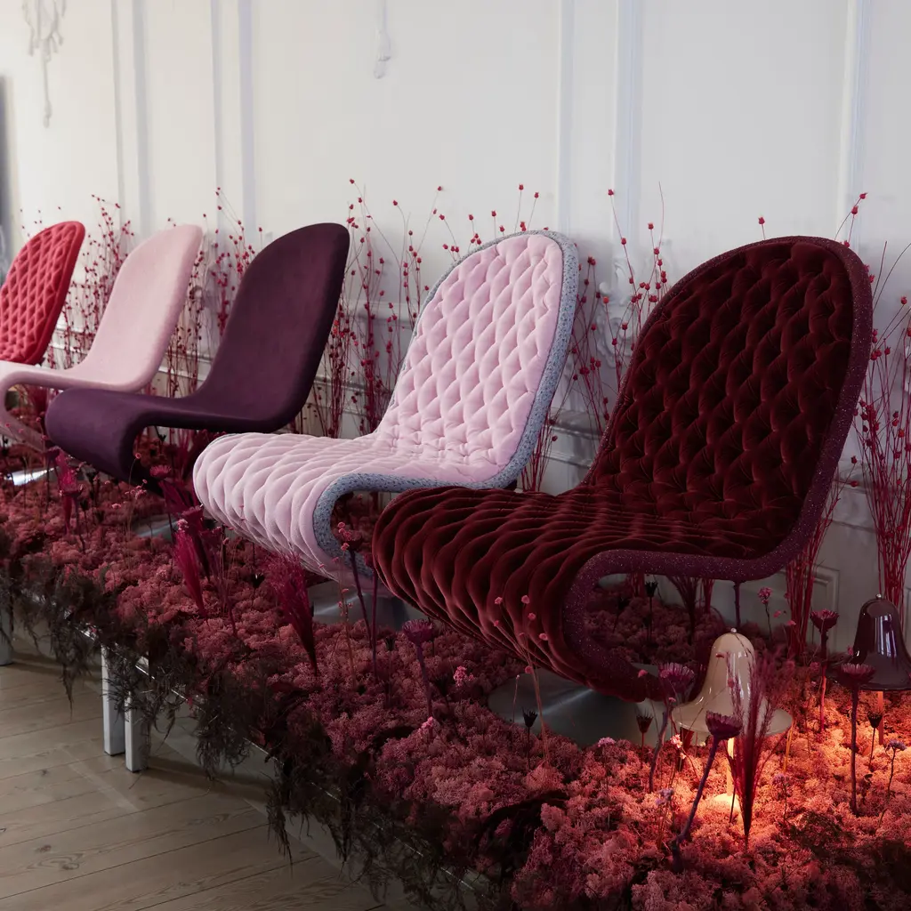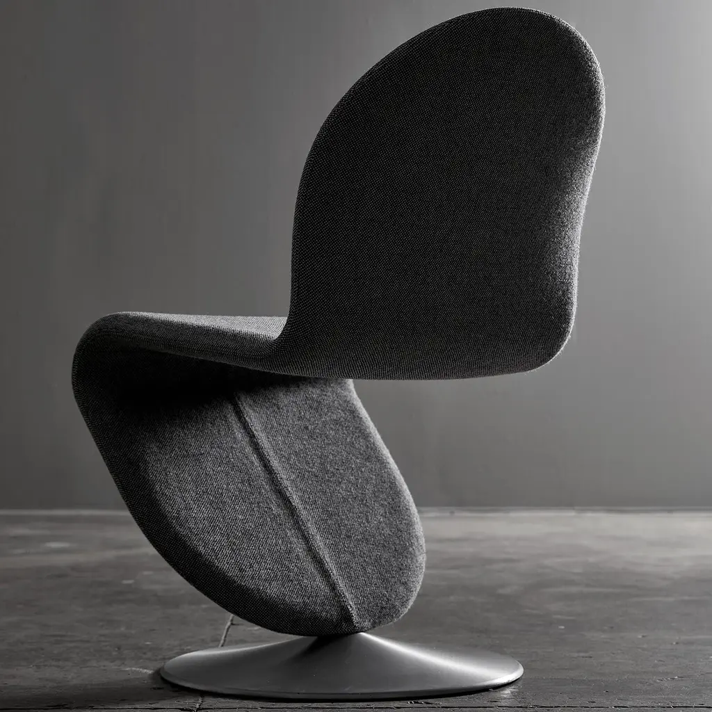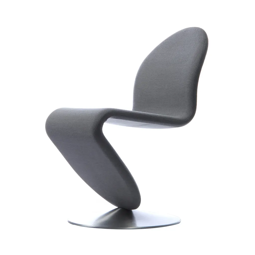 Unveiled in 1973, Verner Panton€™s S-shaped seating still captivates. From his System 1-2-3 range, the dining chair is available with either the standard brushed-aluminum disc base or a butterfly foot. Panton€™s vision of €œsomething organic and never with four legs,€ the swivel chair has a steel frame with premium Voss foam padding and a choice of leather or textile upholstery.