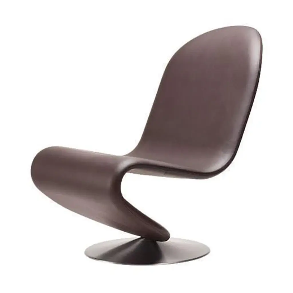 Fully upholstered S-shaped swivel low lounge chair on a brushed aluminium base.