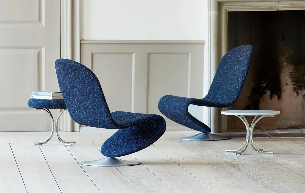 Fully upholstered S-shaped swivel low lounge deluxe chair on a brushed aluminium base.