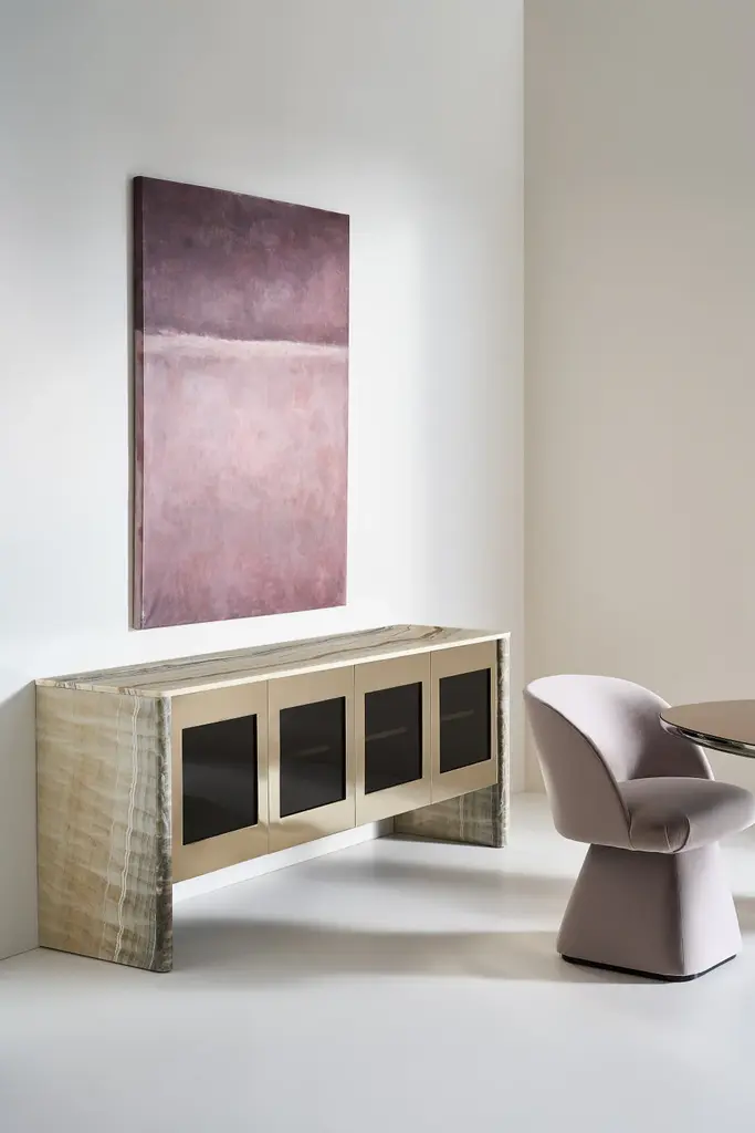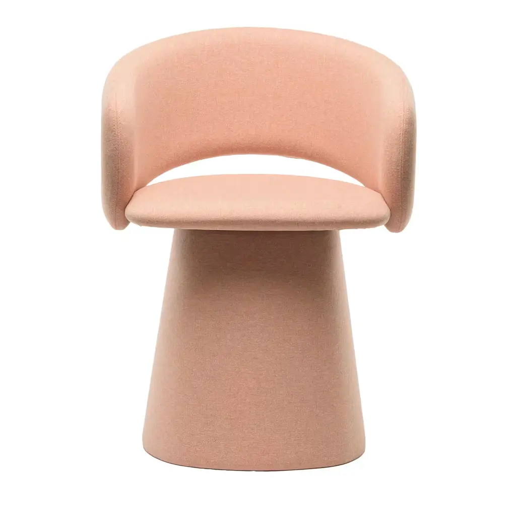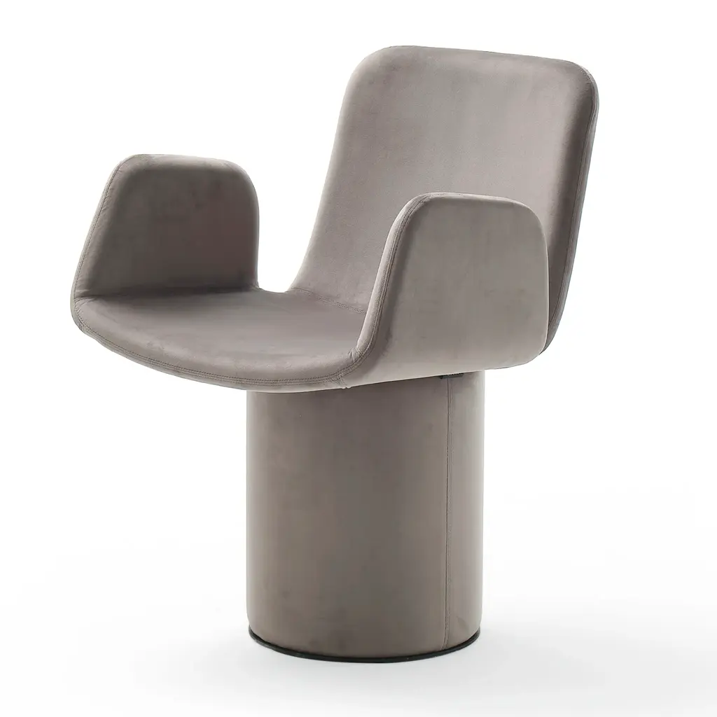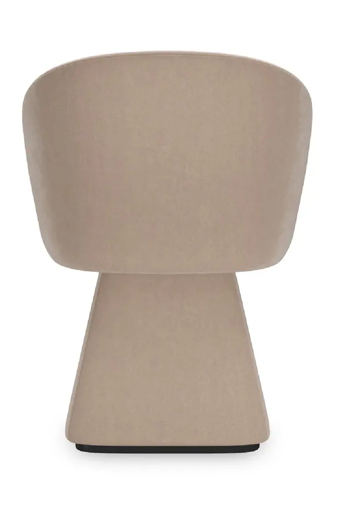 Dinner conversations will linger because your guests are so comfortable around your table. The Vuelta Swivel chairs are fully upholstered in light Taupe velvet with deep cushions and a softly curved back. The chair sits on a conical base that rests on anAlmost Black plinth.