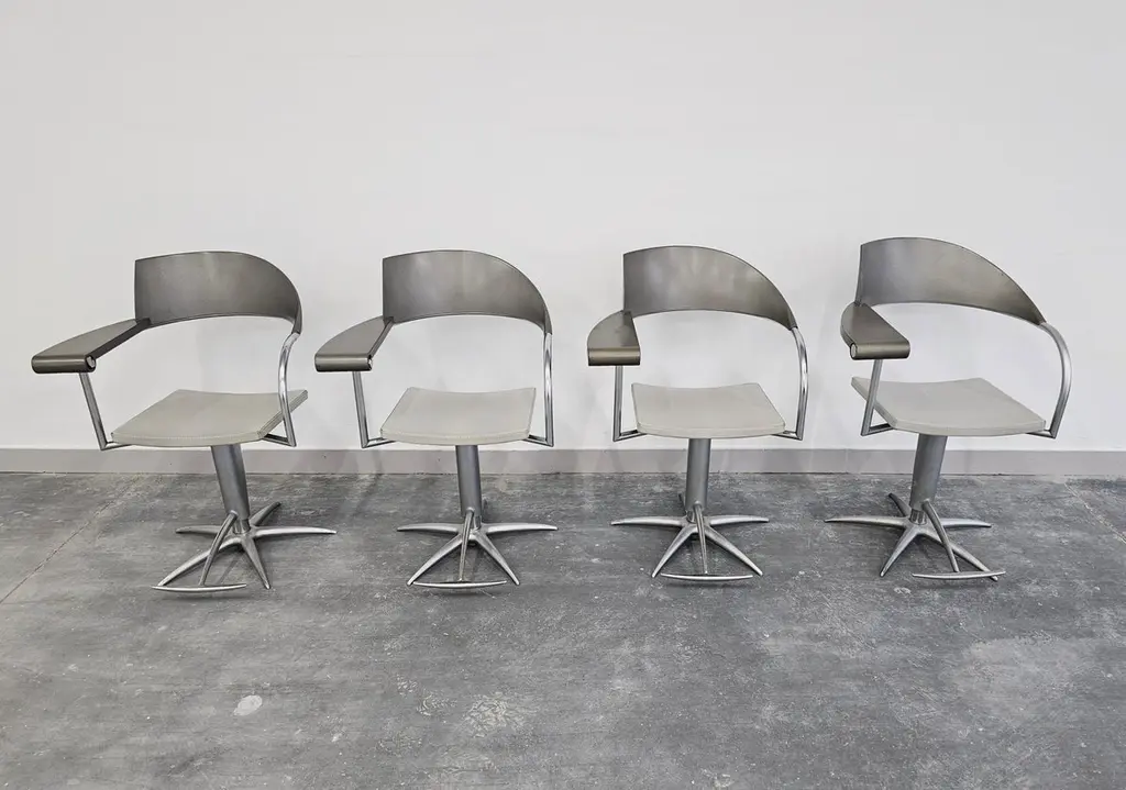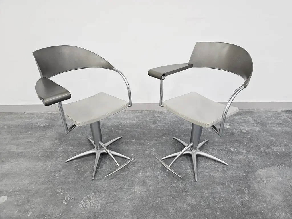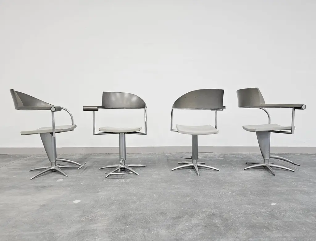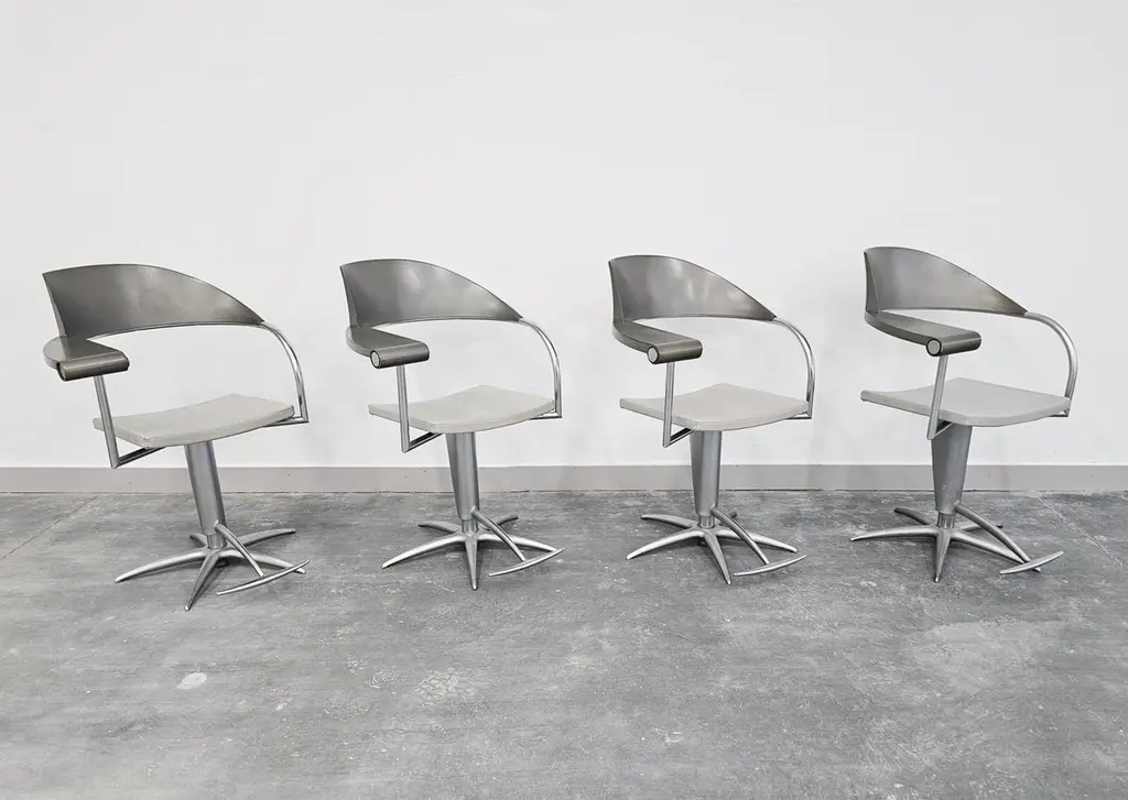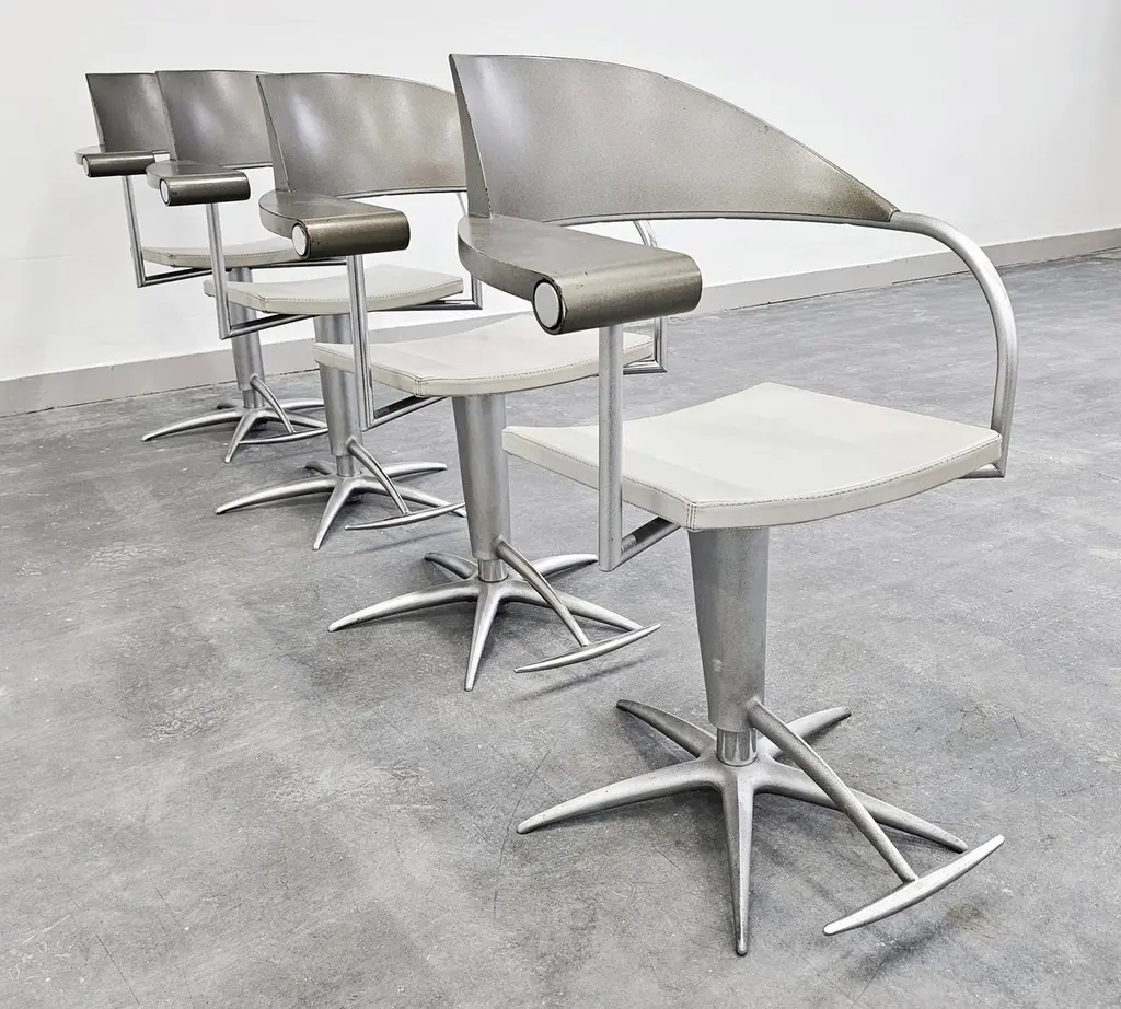 In this listing you will find 4 exceptionally rare swivel barber chairs, called Techno chairs, designed by Philippe Starck for L'Oreal.These chairs represent the peek of postmodern design with astonishing lines and exquisite craftsmanship. Each chair has a hidden ashtray in its armrest that slides in and out.good vintage condition with small signs of time and use, such as scratches and tiny chips, as shown in last two pictures.When purchased the chair will be carefully wrapped up and packed in a way to avoid any damages in transport. As soon as shipped you will receive the tracking number for your package. If you have any additional questions regarding this piece please feel free to contact me. Happy shopping!