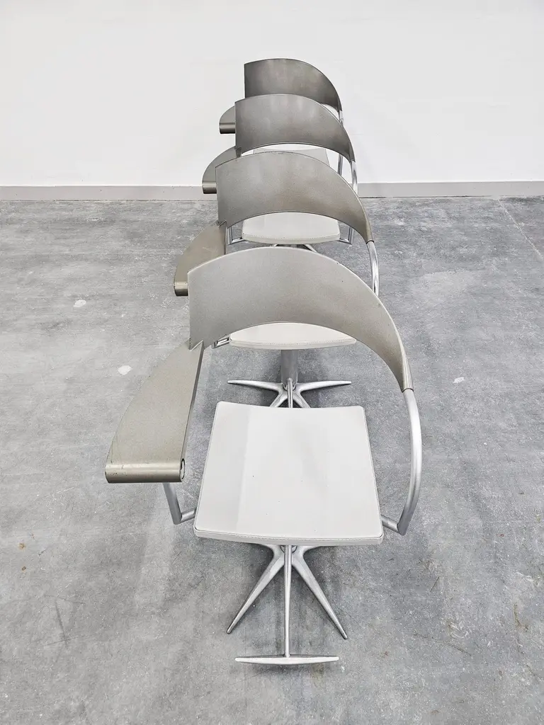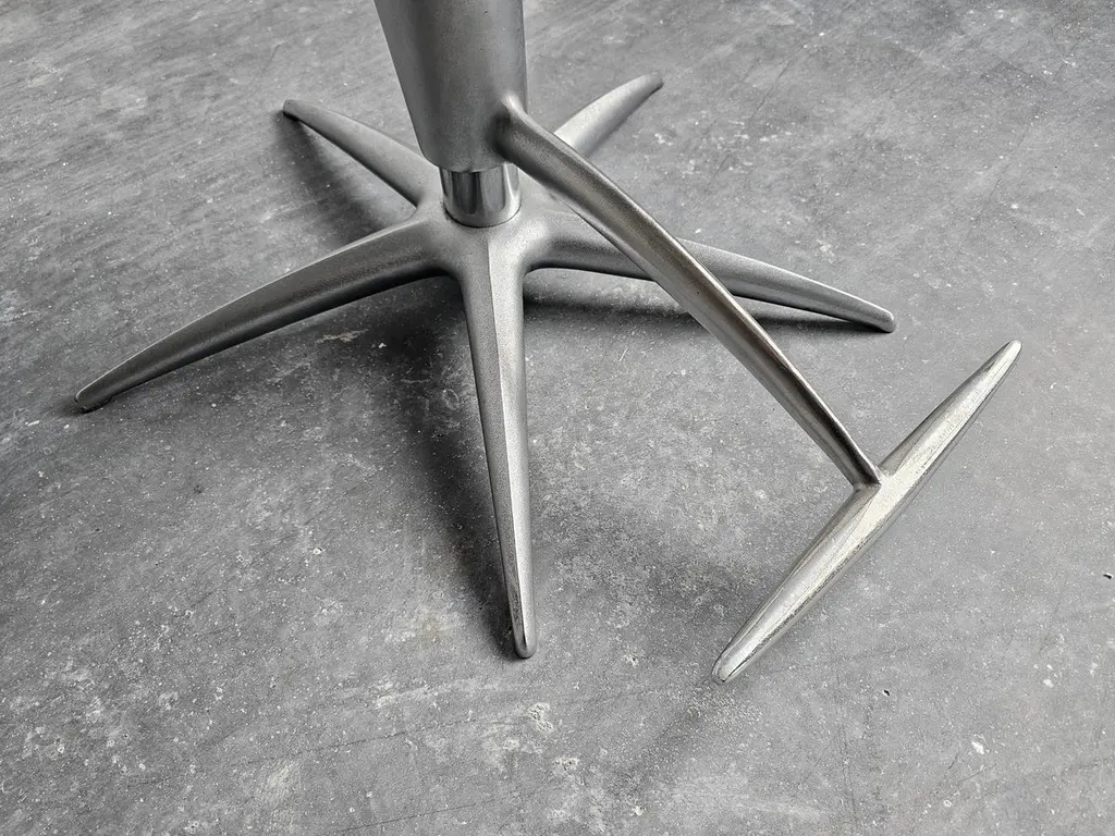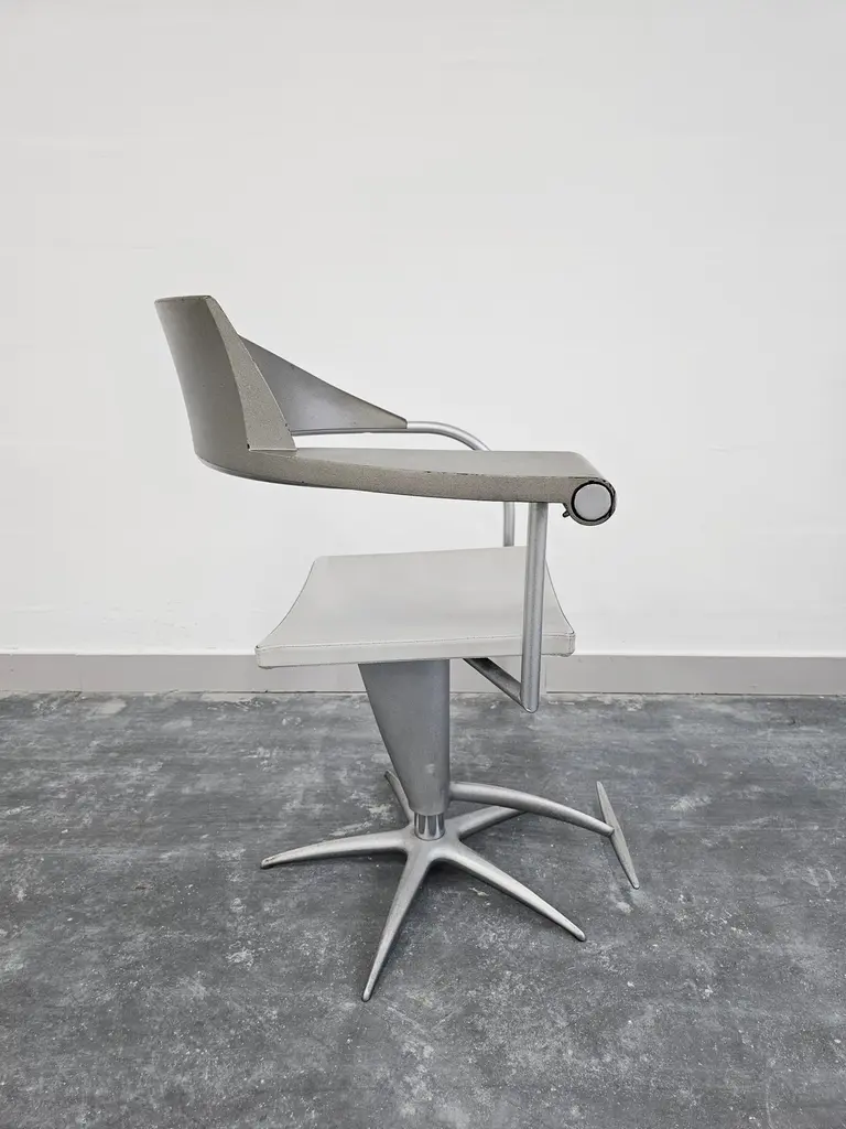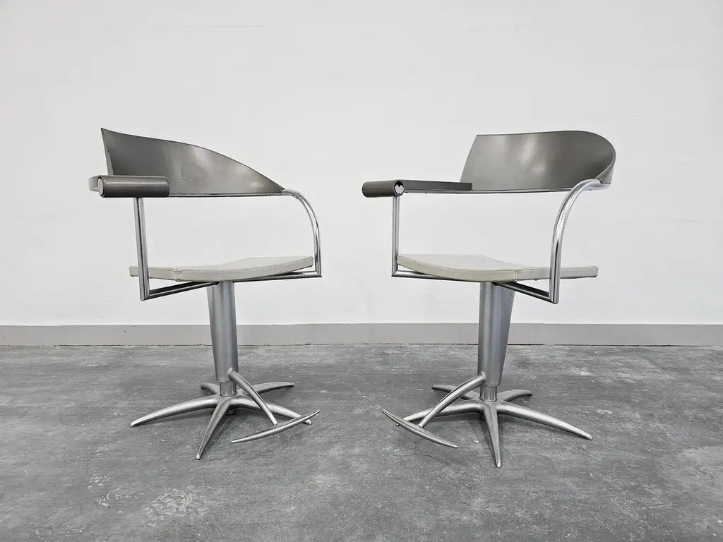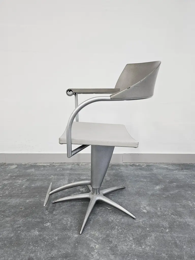 In this listing you will find 4 exceptionally rare swivel barber chairs, called Techno chairs, designed by Philippe Starck for L'Oreal.These chairs represent the peek of postmodern design with astonishing lines and exquisite craftsmanship. Each chair has a hidden ashtray in its armrest that slides in and out.good vintage condition with small signs of time and use, such as scratches and tiny chips, as shown in last two pictures.When purchased the chair will be carefully wrapped up and packed in a way to avoid any damages in transport. As soon as shipped you will receive the tracking number for your package. If you have any additional questions regarding this piece please feel free to contact me. Happy shopping!