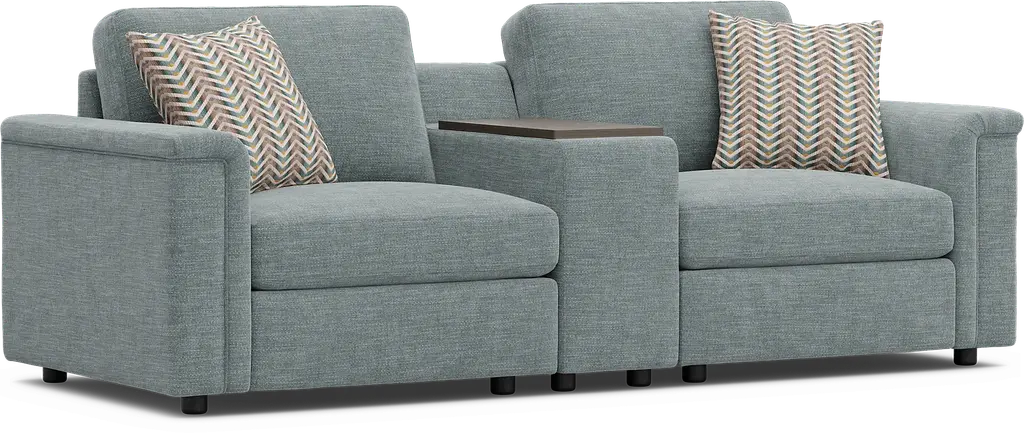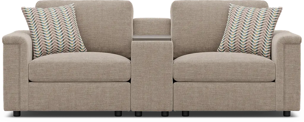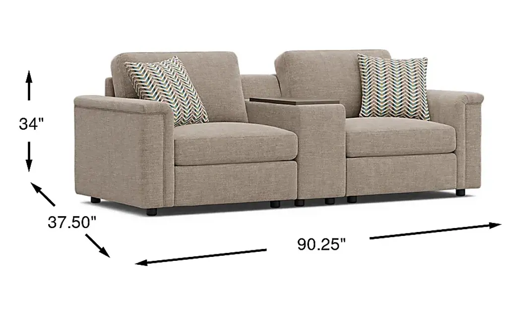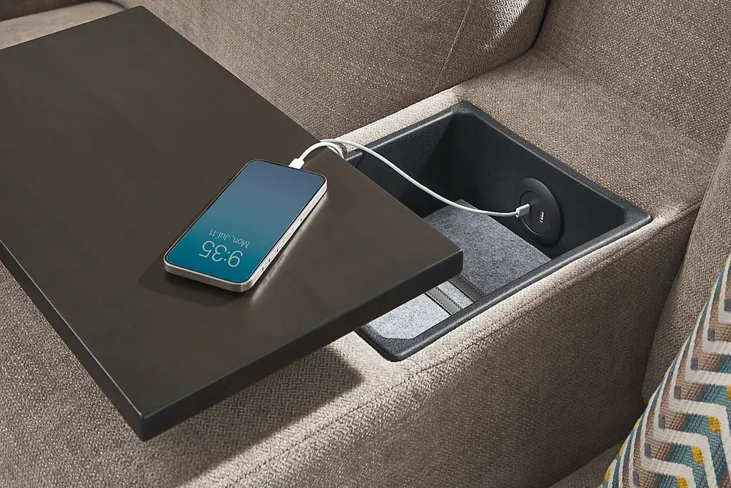 The world quiets... life's rhythms slow... serenity washes over you as you gently relax into the Tempo Modular collection, its effortless luxury flowing from the unity of form and function. Transitional style defines this sectional, its comfortably understated seats upholstered in beige chenille and highlighted with unique inverted waterfall track arms. The included consoles feature swivel tables, hidden storage and USB-A and USB-C charging ports for ultimate convenience. And, with easy-to-use connectors, this modular seating solution can be rearranged to fit your changing needs and tastes. Includes LAF chair, RAF chair and console. Upholstery: 100% Polyester.
