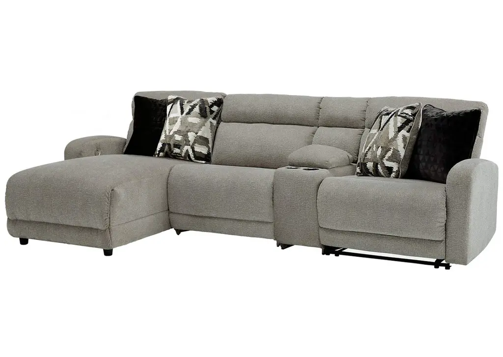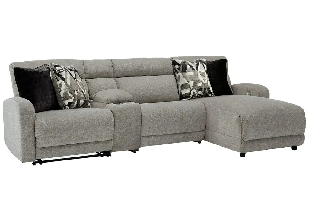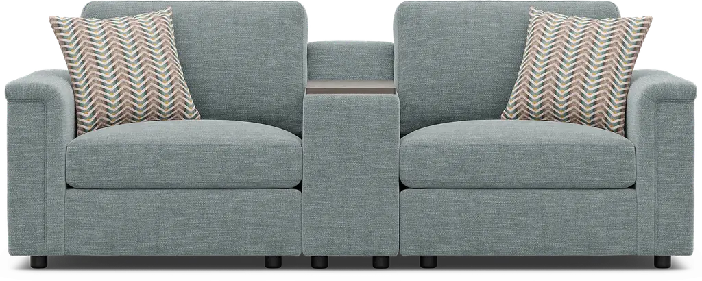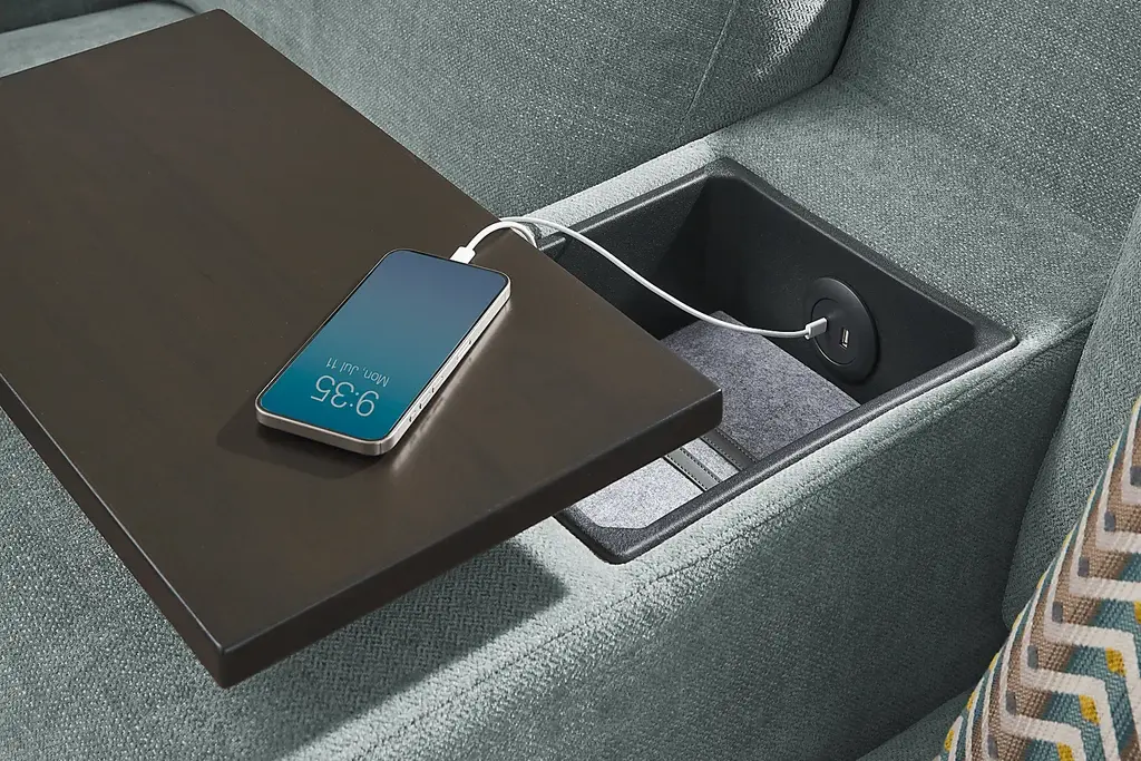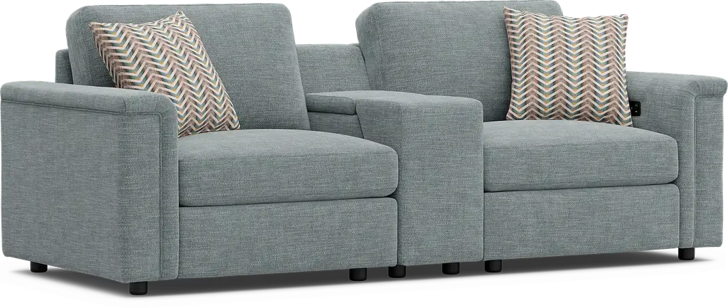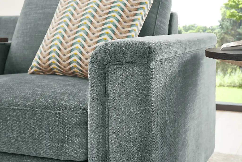 The world quiets... life's rhythms slow... serenity washes over you as you gently relax into the Tempo Modular collection, its effortless luxury flowing from the unity of form and function. Transitional style defines this sectional, its comfortably understated seats upholstered in blue chenille and highlighted with unique inverted waterfall track arms. The included consoles feature swivel tables, hidden storage and USB-A and USB-C charging ports for ultimate convenience. And, with easy-to-use connectors, this modular seating solution can be rearranged to fit your changing needs and tastes. Includes LAF chair, RAF chair and console. Upholstery: 100% Polyester.