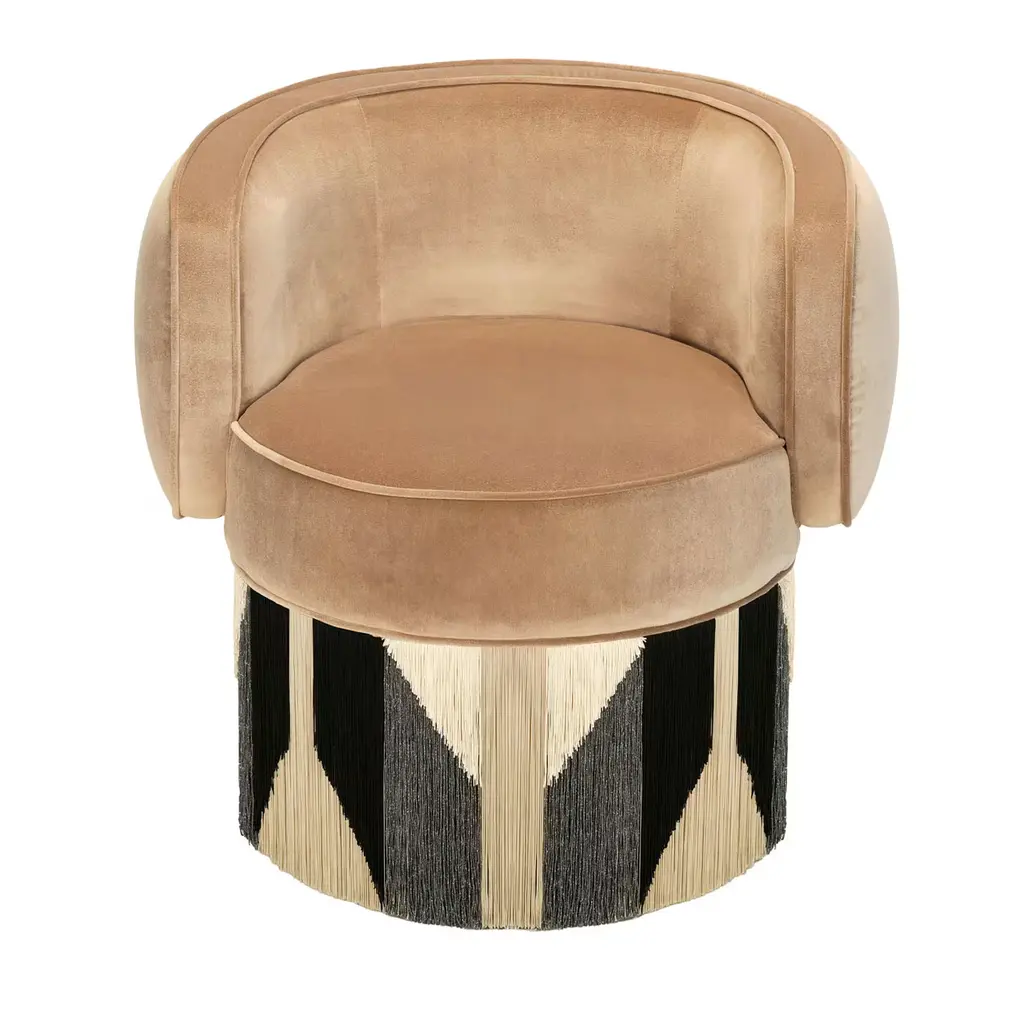 Inspired by the distinctive shapes of chess pieces, the Chess Swivel Chair is crafted as the ideal chair for game nights. Its sturdy yet comfortable design, echoing the proportions of chess pieces, ensures you're ready for those intense, edge-of-your-seat moments during any board game.This item is made to order in the UK, so please allow 12-16 weeks for production, upholstered here in our Odessa Savanna, with a swivel base in Walnut. If you're looking for something unique, we also provide the option to use Customers Own Material so it is tailored just for you. Dimensions = Height 81cm x Width 54cm x Depth 49cm – Seat Height 45cm