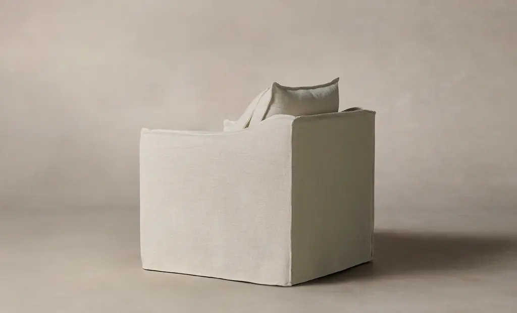 The Dune Swivel Chair is a vision of effortlessness and ease. It boasts a deep seat, plush cushioning, and relaxed slipcover with hand-sewn flange seams for an elegant finish. Handcrafted in North Carolina.