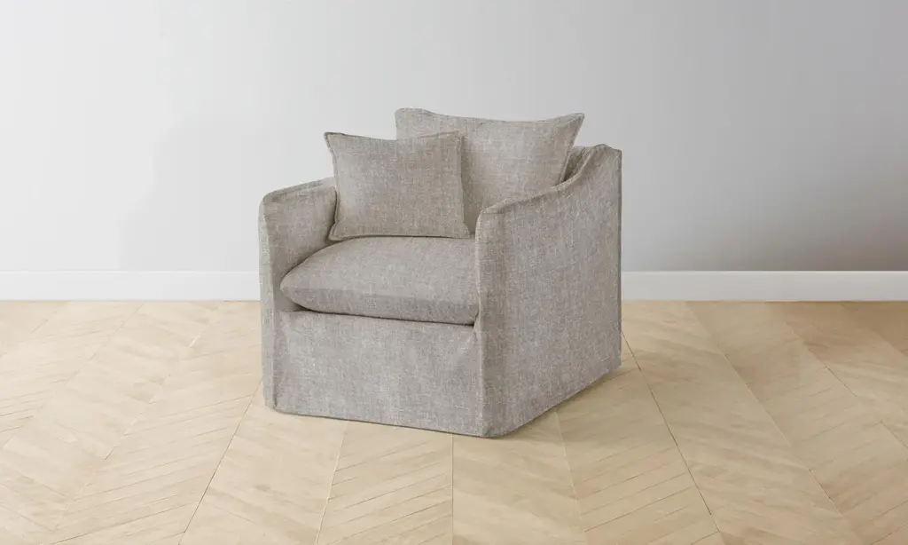 The Dune Swivel Chair is a vision of effortlessness and ease. It boasts a deep seat, plush cushioning, and relaxed slipcover with hand-sewn flange seams for an elegant finish. Handcrafted in North Carolina.