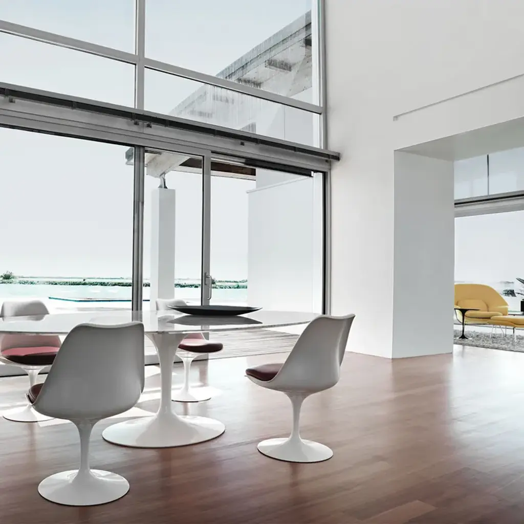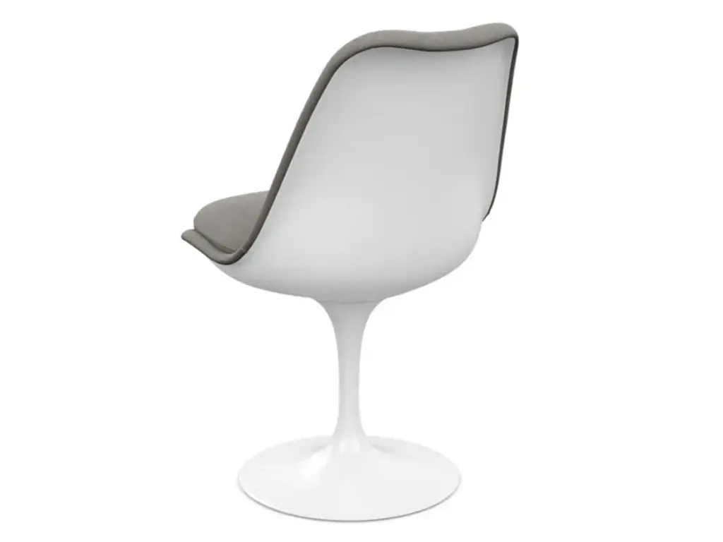 Armless Dining and Guest Chairs with fixed or swivel base.Fully upholstered in fabric.The Saarinen Tulip seating collection consists of an armchair and an armless chair, with swivel or fixed base.The chairs are available with either an upholstered seat cushion, or fully upholstered inner shell with seat cushion. The swivel stool with an upholstered cushion completes the collection. The KnollStudio logo and the signature of Eero Saarinen are located on the underside of the base.CONSTRUCTIONBase consists of cast aluminium with Rilsan coated finish for the white and black versions. The Platinum base has a polyurethane coat with transparent finish.The shell is moulded fibreglass reinforced plastic bonded finish.FINISHESThe shell and base are available in black, white or platinum colours.Fully upholstered inner shell with seat cushion available in a wide range of fabrics.Stool and chairs with seat cushion only are available in a wide range of fabrics and Spinneybeck leather. This product is available with foam that meets requirements for BS5852.AWARDSThe Museum of Modern Art, New York, 1969.Federal Award for Industrial Design, Germany, 1969.Design Career Stuttgart Award, Germany, 1962.