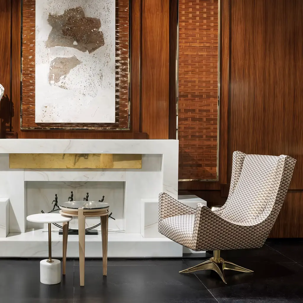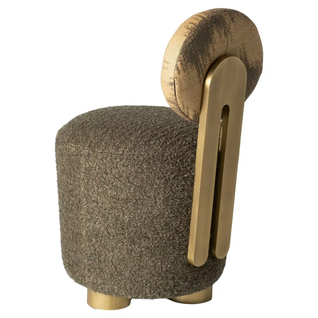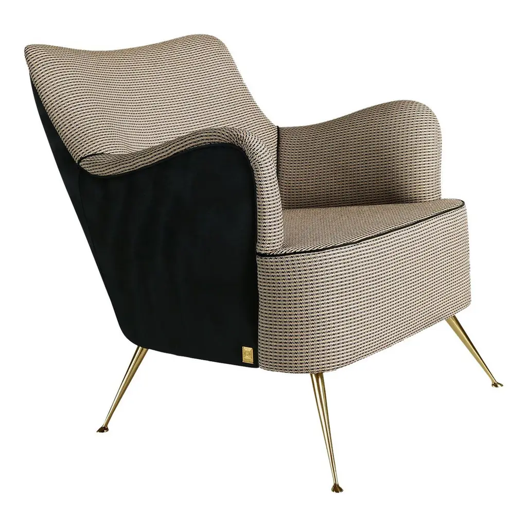 A stupendous, iconic design that will not go unnoticed in a refined interior, this armchair is brimming with modern charm most evident in the choice of Jacquard fabric upholstery. Its sumptuous and welcoming silhouette rests on a swivel brass base. Please ask the Concierge for further details and possible customization options.