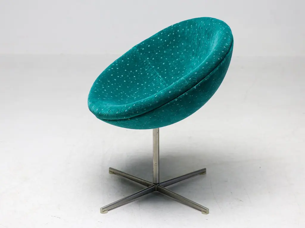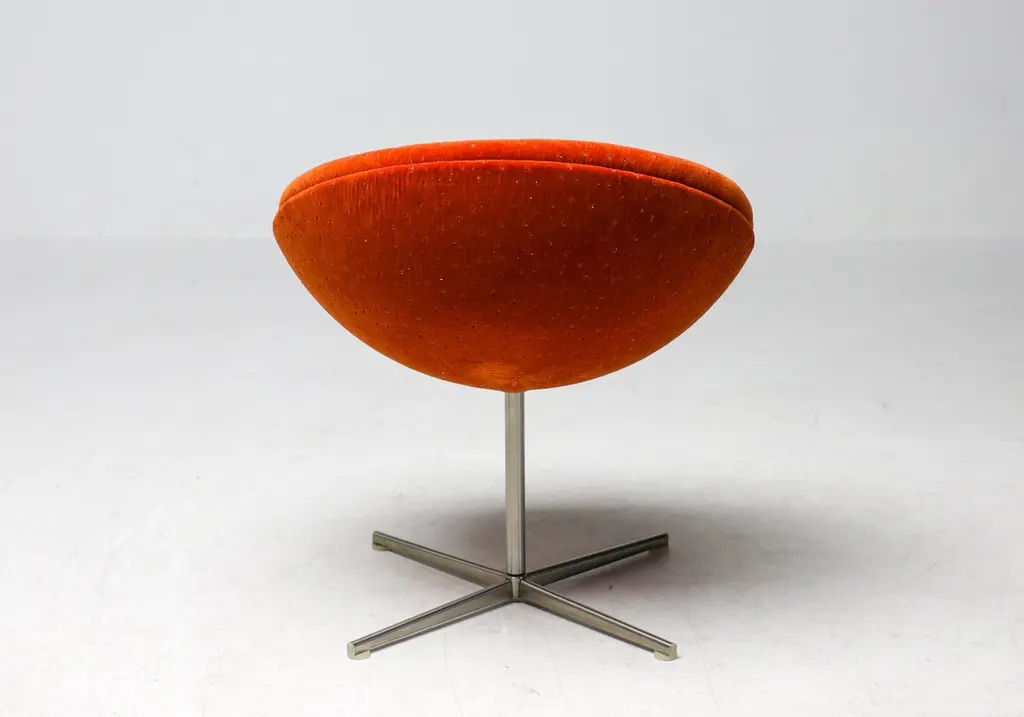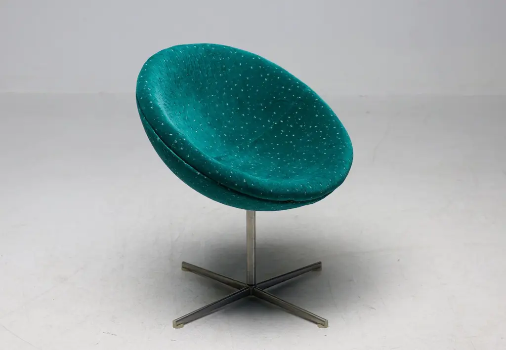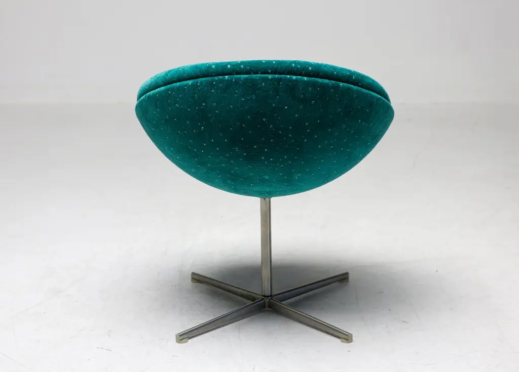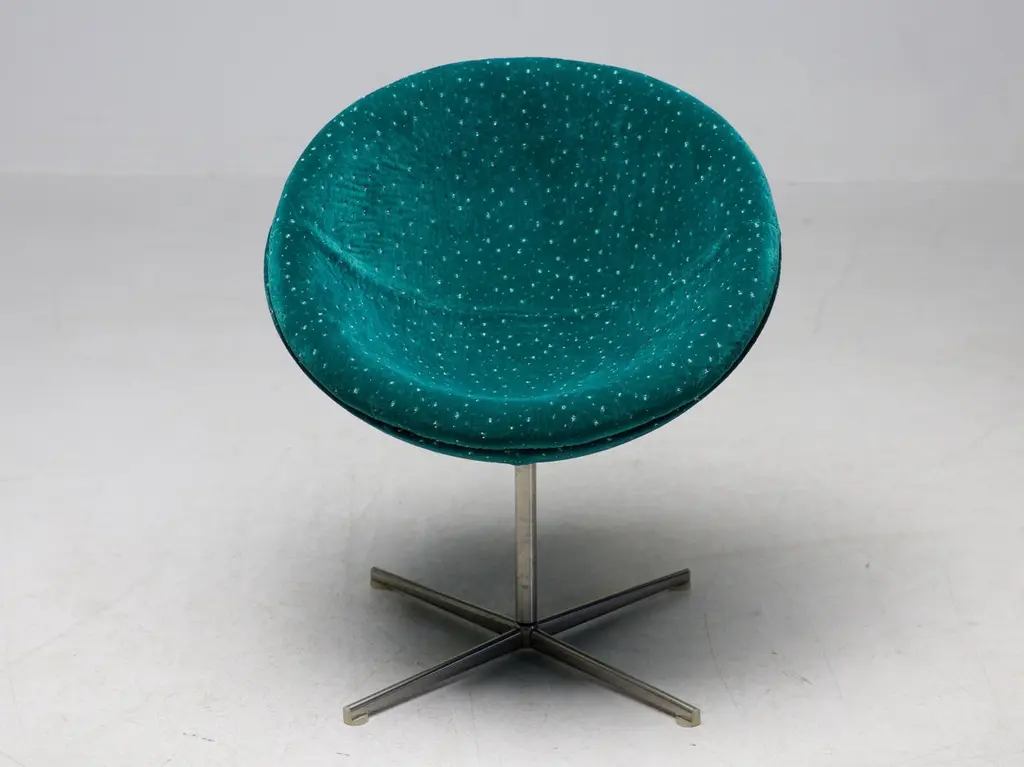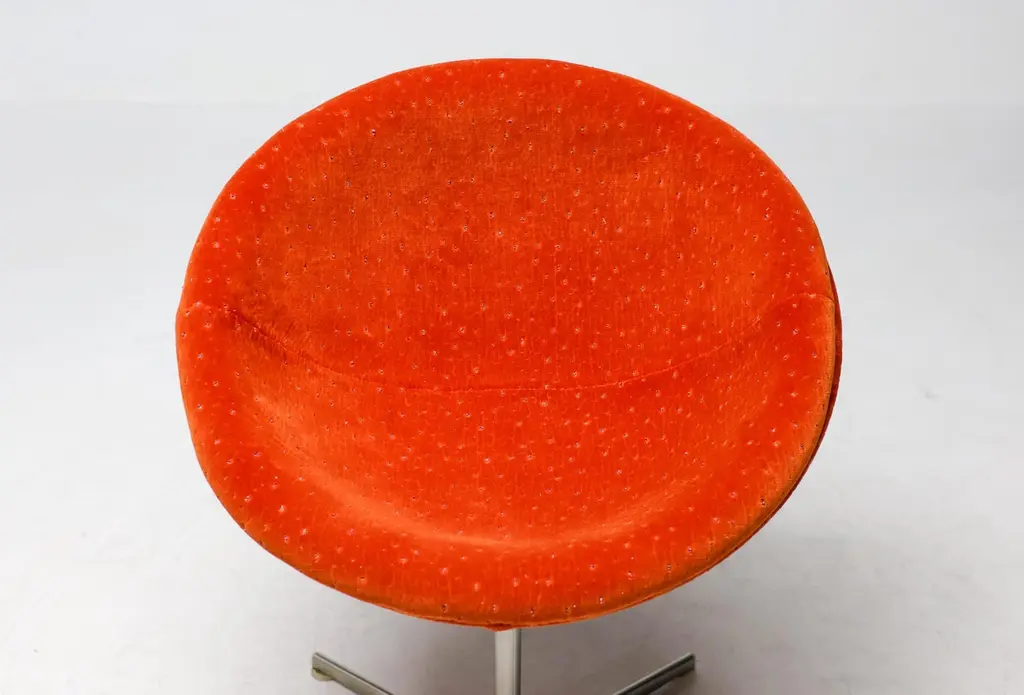 Verner Panton C1 armchairs reupholstered in exquisite velvet fabric; Tramontana Jade and Tramontana Ember.We have another set of 6 chairs that are available for reupholstery in the same fabric.These chairs are no longer in production by Vitra.Marked with the original Vitra label.Priced individually.Verner Panton's career as a designer first peaked at the end of the 1950s. With a series of furniture featuring basic geometrical shapes he pre-empted Pop Art ideas and yet with the base frames clearly adopted the elegance of Scandinavian Modernism. With the C1 armchair Verner Panton chose a section of a sphere. On swivel bearings and slightly tilted, the upholstered seat shell is comfortable - both for relaxed sitting leaning back and for upright sitting. The C1 can be integrated into private apartments, hotels or reception areas, cuts a fine figure in larger groups.