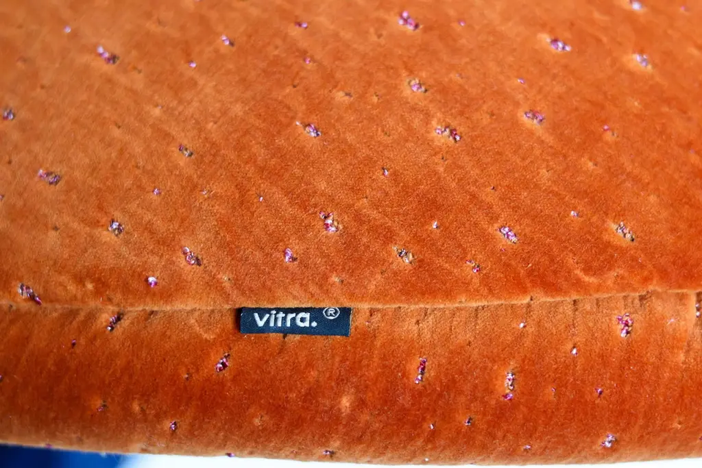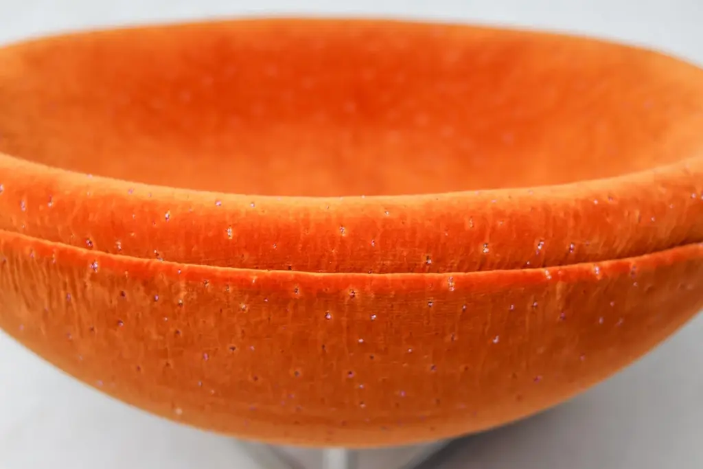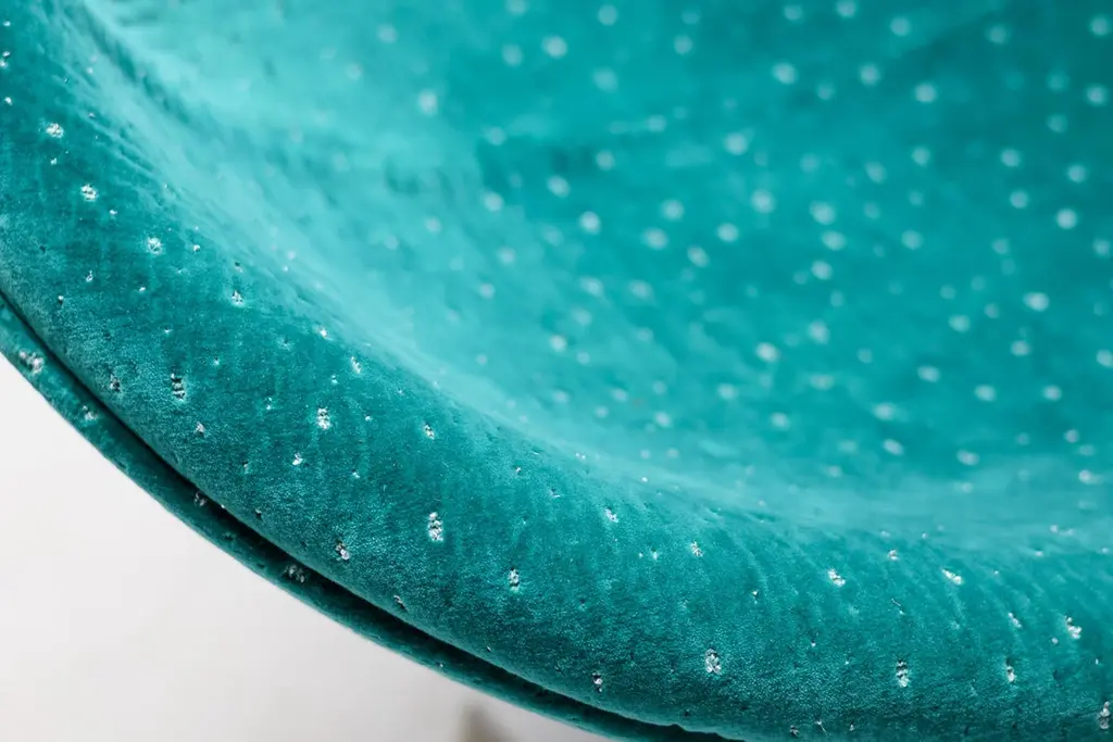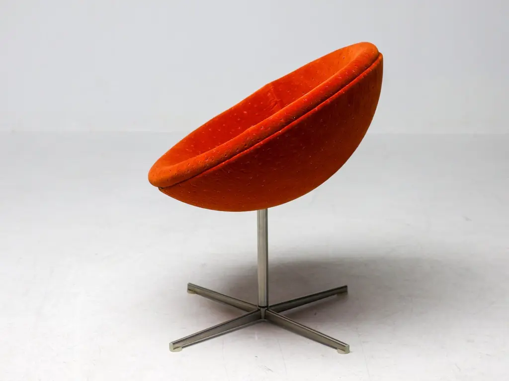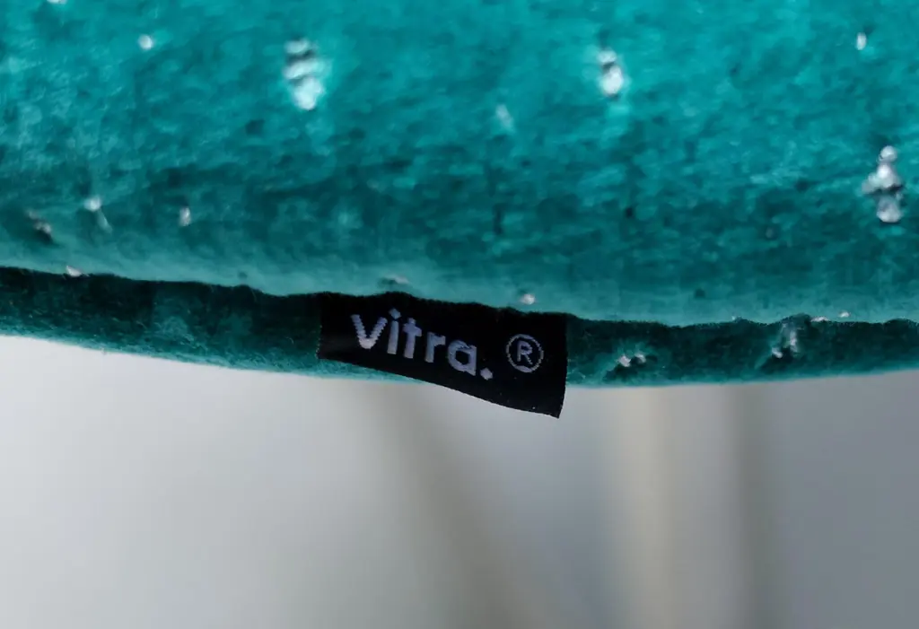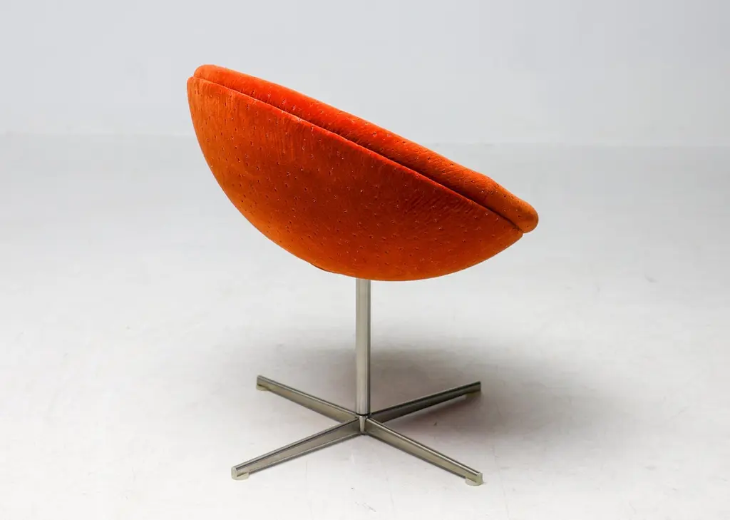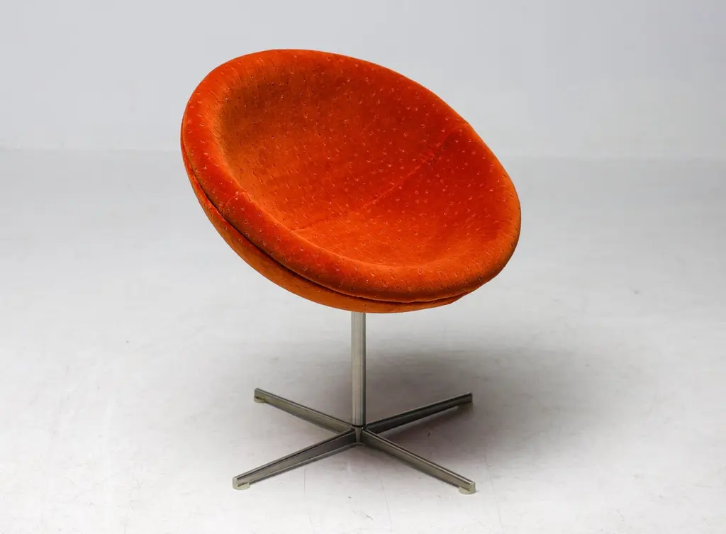 Verner Panton C1 armchairs reupholstered in exquisite velvet fabric; Tramontana Jade and Tramontana Ember.We have another set of 6 chairs that are available for reupholstery in the same fabric.These chairs are no longer in production by Vitra.Marked with the original Vitra label.Priced individually.Verner Panton's career as a designer first peaked at the end of the 1950s. With a series of furniture featuring basic geometrical shapes he pre-empted Pop Art ideas and yet with the base frames clearly adopted the elegance of Scandinavian Modernism. With the C1 armchair Verner Panton chose a section of a sphere. On swivel bearings and slightly tilted, the upholstered seat shell is comfortable - both for relaxed sitting leaning back and for upright sitting. The C1 can be integrated into private apartments, hotels or reception areas, cuts a fine figure in larger groups.