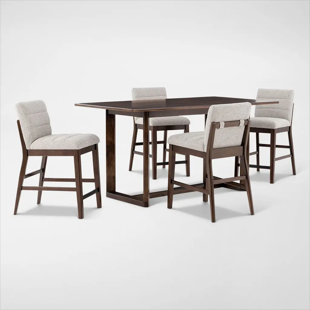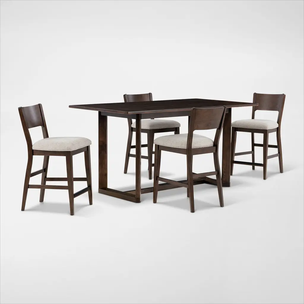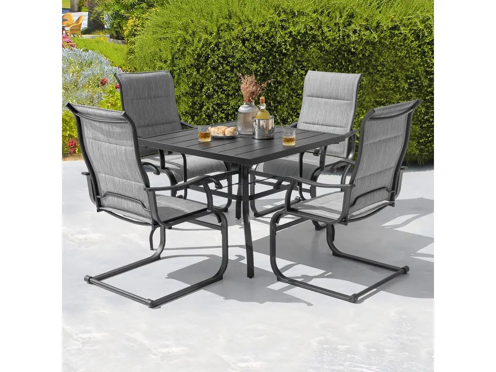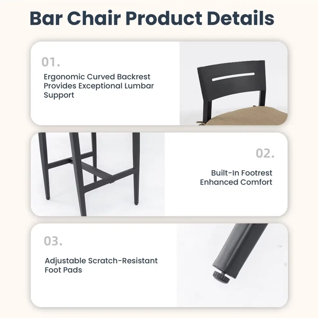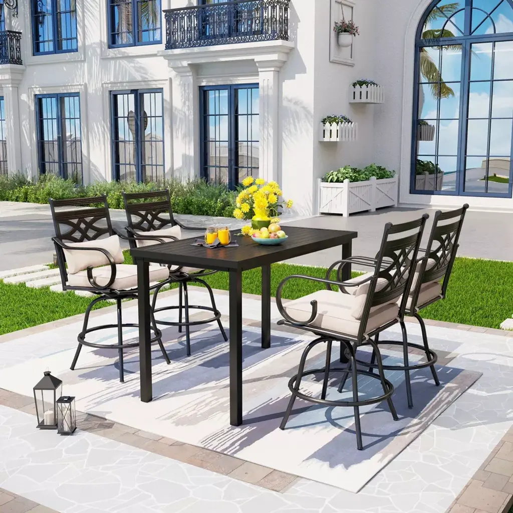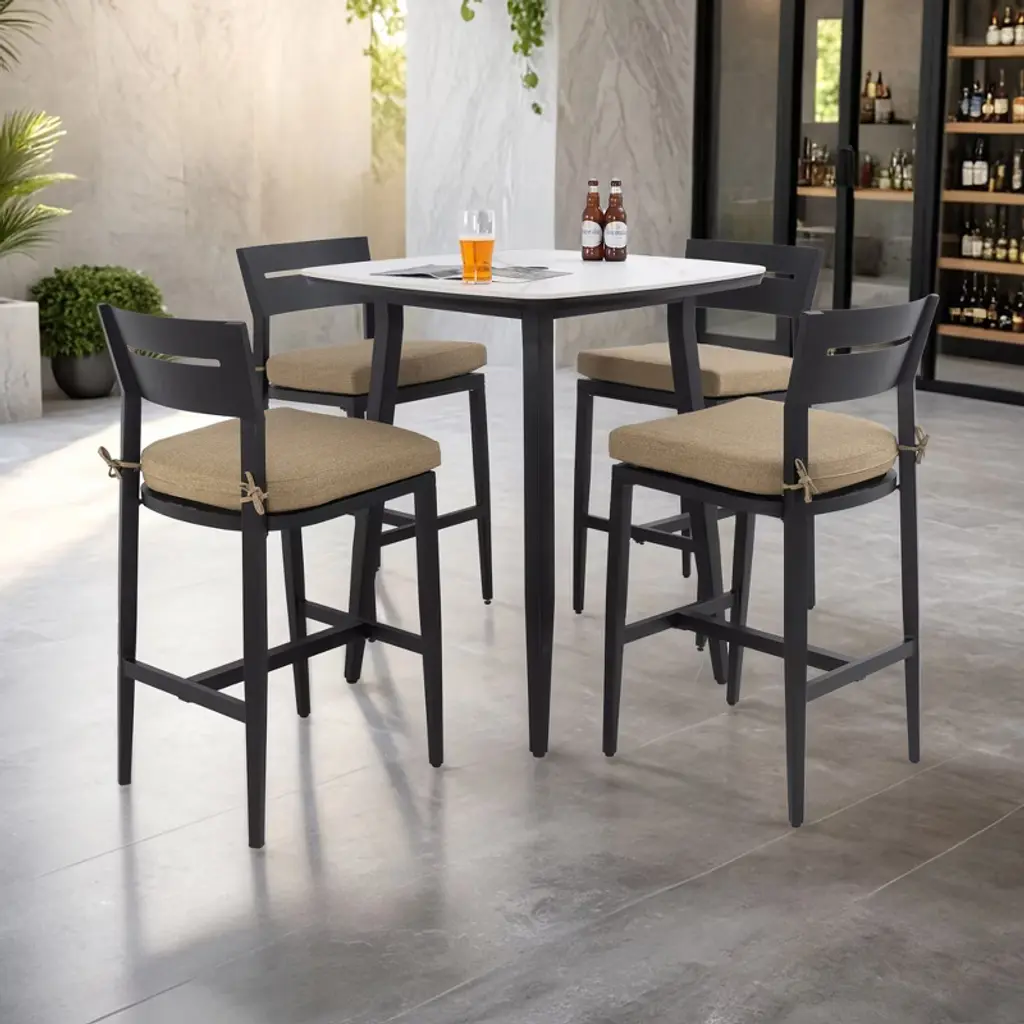 Upgrade your outdoor space with this modern 5-piece bar set, featuring a 35.4'' square sintered stone bar table and four swivel bar chairs. The rust-free aluminum frame with an Ember Black finish ensures durability, while the Greek White marble-inspired tabletop adds a sophisticated touch. The bar chairs feature a smooth 360¡ã swivel with a bearing swivel plate, an ergonomic curved backrest, and seamlessly connected armrests for enhanced comfort. Tapered legs provide stability, while adjustable foot pads protect floors. Sunbrella Jocky Red cushions offer superior weather resistance, fade protection, and easy maintenance. Perfect for patios, balconies, and poolside settings, this stylish set elevates any outdoor space.