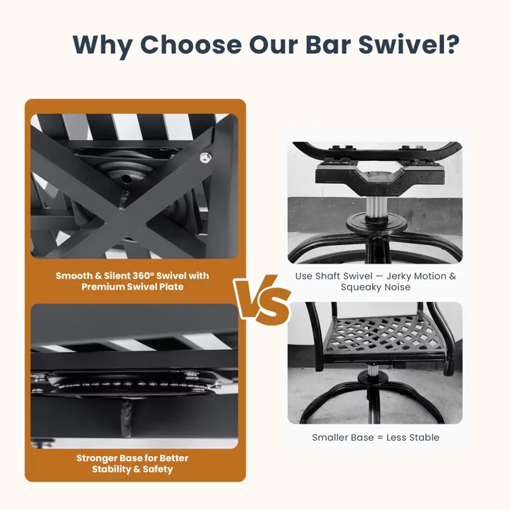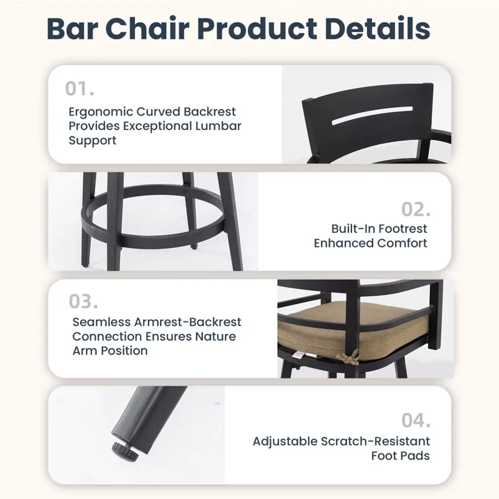 Upgrade your outdoor space with this modern 5-piece bar set, featuring a 35.4'' square sintered stone bar table and four swivel bar chairs. The rust-free aluminum frame with an Ember Black finish ensures durability, while the Greek White marble-inspired tabletop adds a sophisticated touch. The bar chairs feature a smooth 360¡ã swivel with a bearing swivel plate, an ergonomic curved backrest, and seamlessly connected armrests for enhanced comfort. Tapered legs provide stability, while adjustable foot pads protect floors. Sunbrella Jocky Red cushions offer superior weather resistance, fade protection, and easy maintenance. Perfect for patios, balconies, and poolside settings, this stylish set elevates any outdoor space.