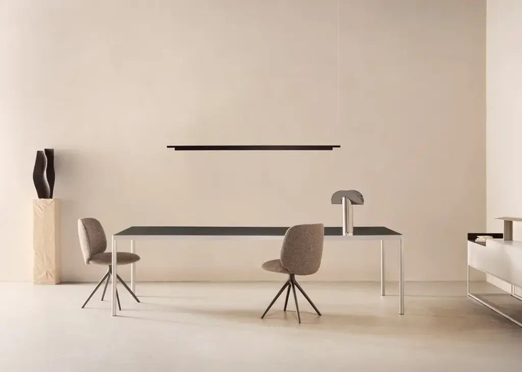 Universal Chair is the name of the new family of seats designed by Jean-Marie Massaud forMDF Italia, which stands out for its impeccably elegant lines and extraordinary ergonomics. In the chair - with wooden or upholstered backrest - and armchair - also with wooden backrest or fully upholstered - the three-dimensional back is the focal point of the seat; it consists of two curved elements pressed from a mechanical mould, then coupled and assembled, with a procedure that echoes the refined savoir-faire of the luthier.The design takes its name, above all, from the disc of the seat, the beating heart of the piece, designed to accommodate different types of bases and backrests, so lending itself over time to the development of an infinite variety of possible configurations.The project has three cornerstone values:Sustainability, the concept focuses on respect for the environment: each component of the seat can be disassembled to facilitate proper recycling.Comfort, ergonomic research into the design has led to the development of a three-dimensional backrest made from two curved coupled elements, providing unique comfort.Elegance, an elegant and timeless design that enhances any type of context in which the seat is inserted, whether domestic or contract.Universal Collection is the name of the new family of seats designed by Jean-Marie Massaud for MDF Italia, which stands out for its impeccably elegant lines and extraordinary ergonomics.In the chair or armchair version - with wooden or fully upholstered backrest – the three-dimensional back is the focal point of the seat; it consists of two curved elements pressed from a mechanical mould, then coupled and assembled, with a procedure that echoes the refined savoir-faire of the luthier.The design takes its name, above all, from the disc of the seat, the beating heart of the piece, designed to accommodate different types of bases and backrests, so lending itself over time to the development of an infinite variety of possible configurations.The project has three cornerstone values:Sustainability, the concept focuses on the respect of the environment: each component of the seat can be disassembled to facilitate proper recycling.Comfort, ergonomic research into the design has led to the development of a three-dimensional backrest made of two curved coupled elements, providing unique comfort.Elegance, an elegant and timeless design that enhances any type of context in which the seat is inserted, whether domestic or contract.Wooden backrestThe concept was developed from a study on the curving of the wood which led to the definition of an innovative, now patented production system. The 3D effect is obtained from two curved elements, joined and assembled, available in the two finishes brown oak and bleached oak.The wooden backrest version in bleached oak or brown oak is available with or without bumpers in matching colours .The bumpers are warmly recommended in the brown oak finish. Padded backrestLoad-bearing shell in tubular metal padded with polyurethane foam. The upholstery covers the backrest completely and is not removable.SeatSeat comprising foam injection moulded polypropylene shell with polyurethane foam rubber. The upholstery covers the seat completely and is not removable.BasesBases with universal disc in die-cast aluminium with micro- embossed finish in white, graphite grey and shadow grey. The disc can be used with two different bases:4-point-star base in die-cast aluminium with micro-embossed finish in white, graphite grey and shadow grey. 360° swivel.Fixed version on request.4-legged oak base with structure in clear lacquered natural solid oak, available in the two finishes brown oak and bleached oak. Fixed version.