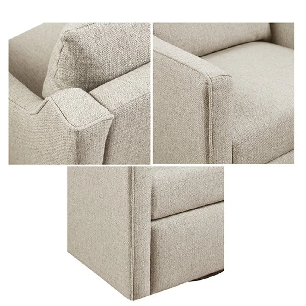 Add sophistication to your space with this fully upholstered swivel armchair, designed with a classic structured look and elegant piping along the sloped arms. Wrapped in durable, easy-to-clean plain weave fabric, it seamlessly combines style and practicality. Perfect for the living room, bedroom, or home office, it adapts beautifully to various settings. The padded, removable seat cushion and reversible back pillow ensure enhanced comfort, while the 360-degree swivel design offers effortless mobility. High-density foam provides firm initial support, softening over time for optimal relaxation and durability.