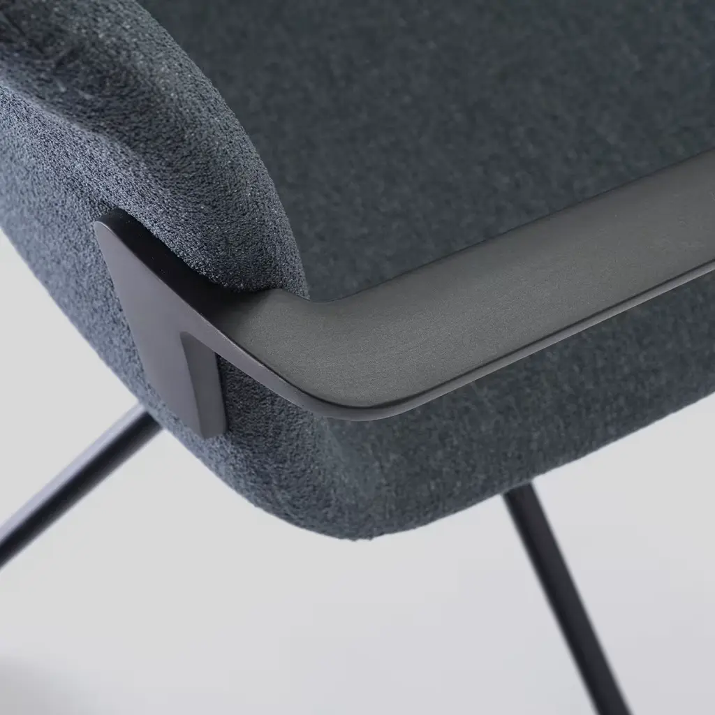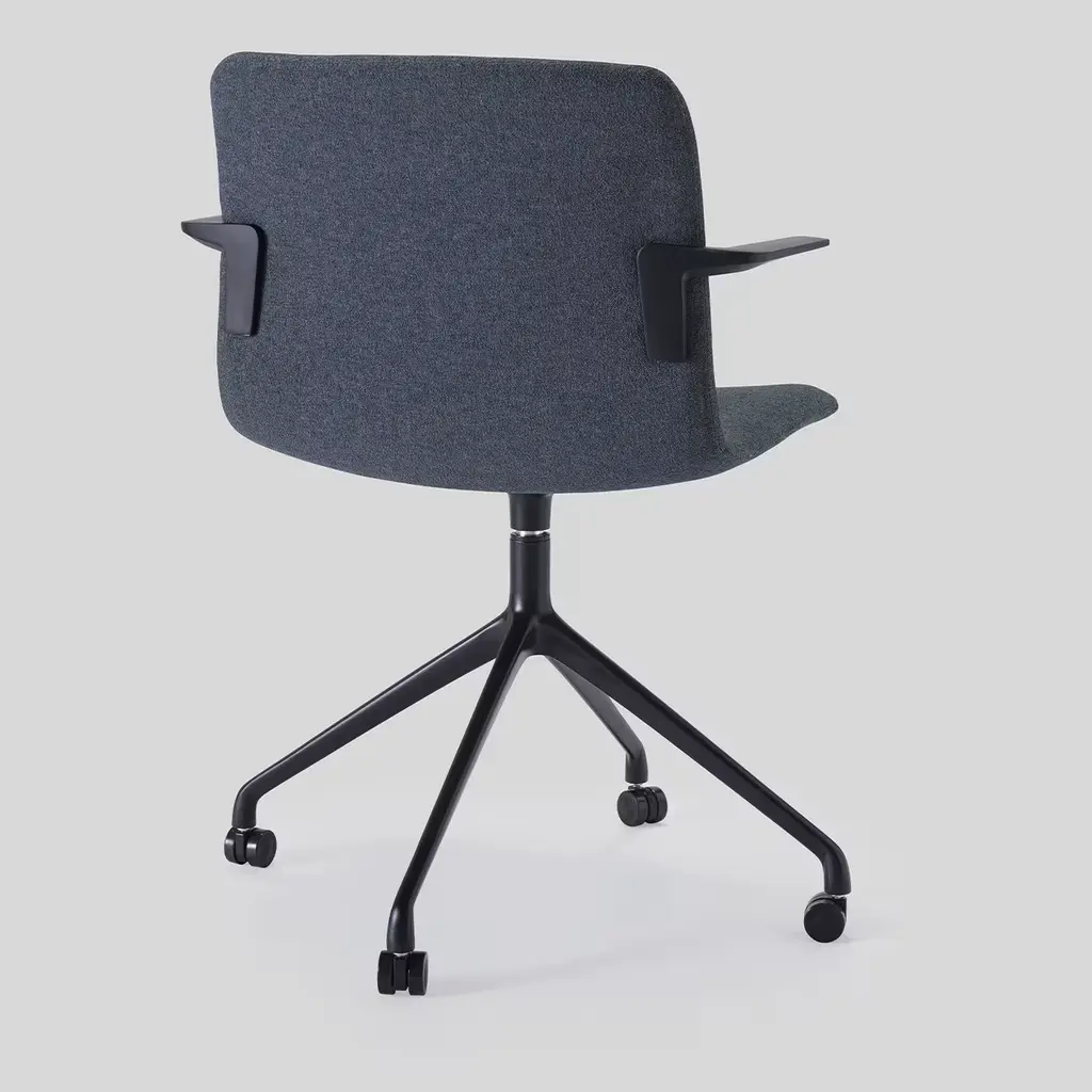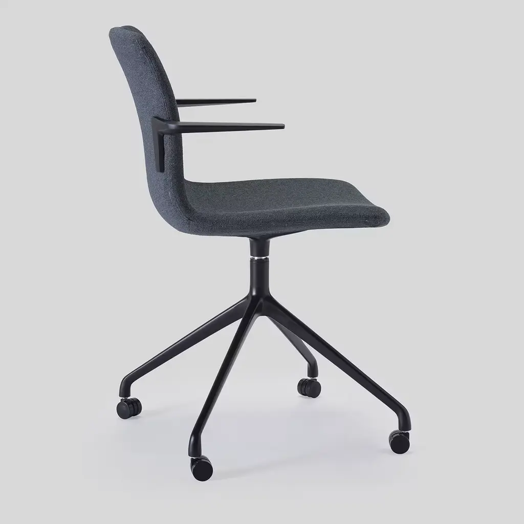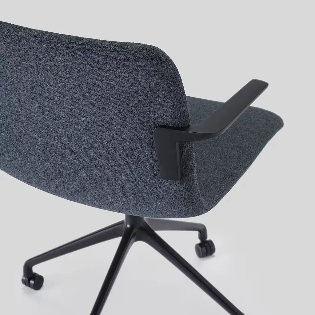 A stunning combination of minimalist aesthetic and ergonomic functionality, this swivel chair will exquisitely complement any home study or office decor. Showcasing an elegant and clean aesthetic, it rests on a matte black-finished metal swivel base with four-spike legs with wheels and features a curved plywood structure upholstered with a dark gray fabric. Customizable in fabric, leather, or eco-leather upholstery, please ask the Concierge for details.