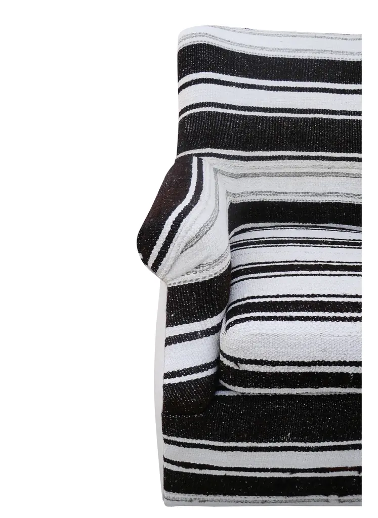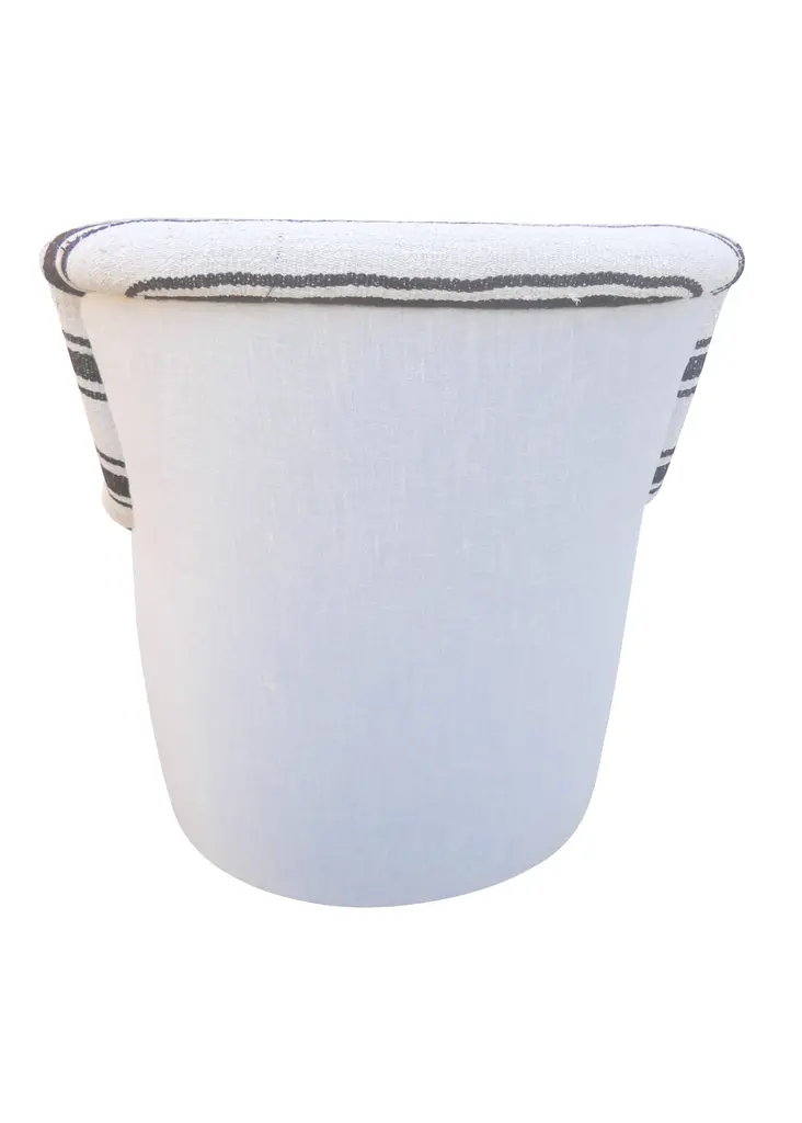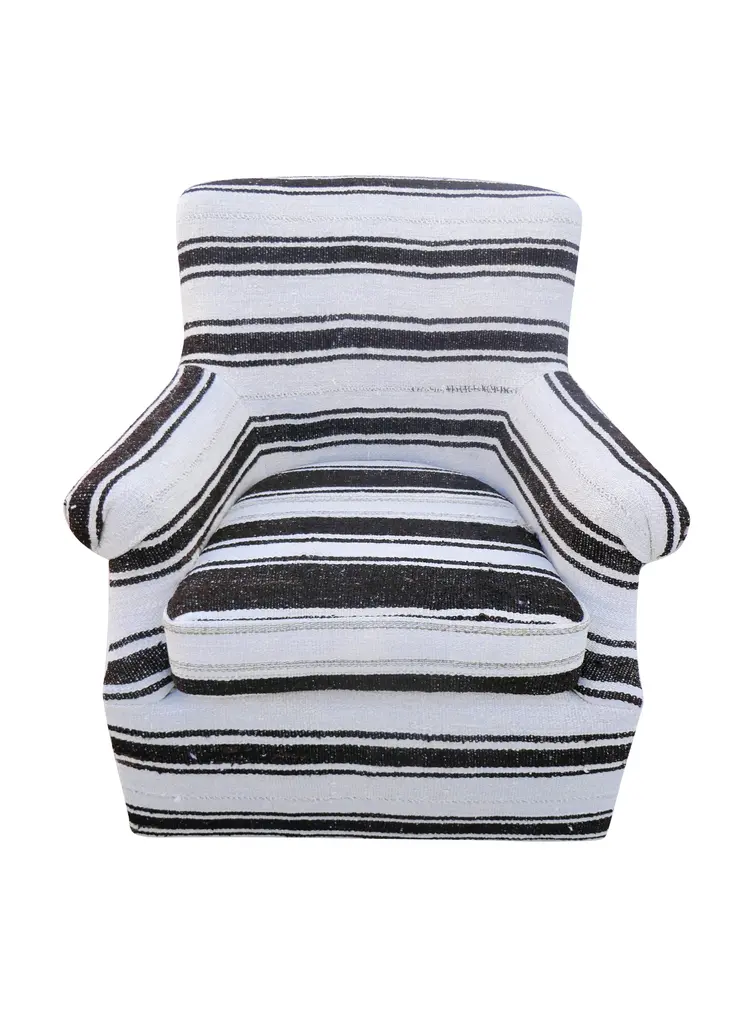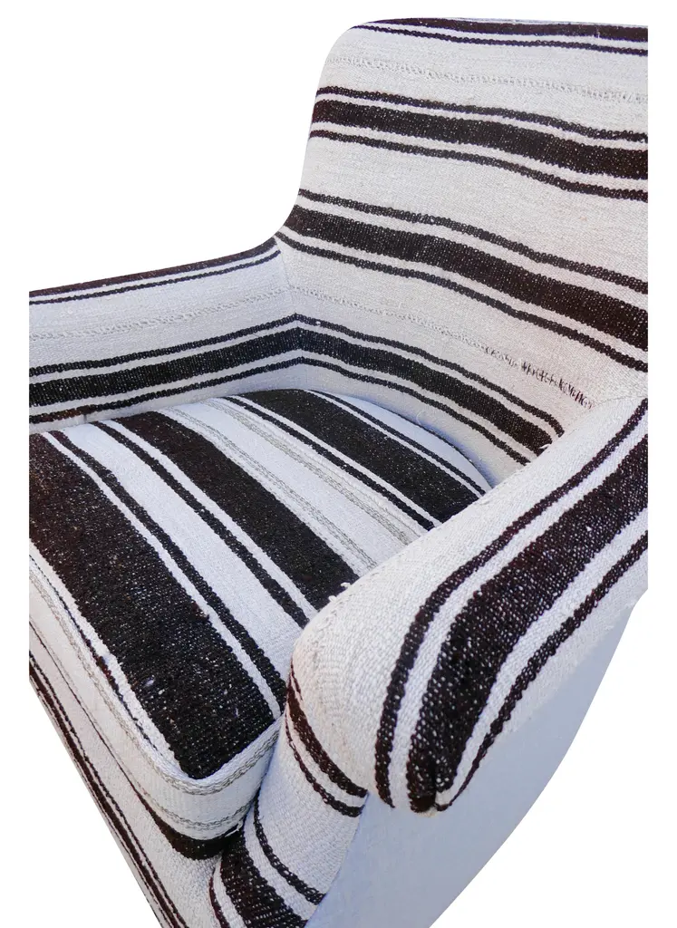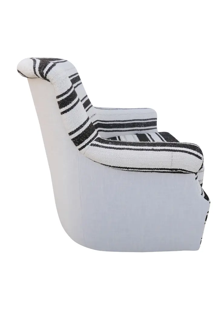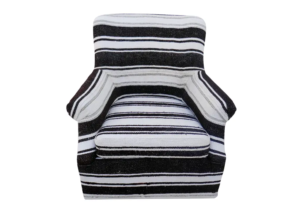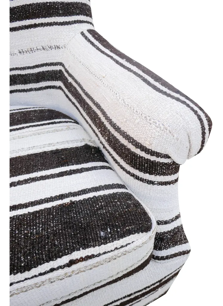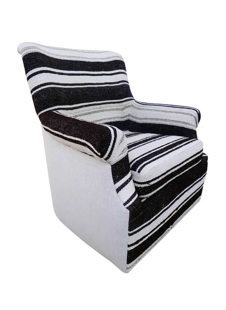 Outstanding custom swivel club chair, impeccably upholstered in authentic vintage (60 year old) Berber tribal handwoven wool kilim textile. Beautiful texture created from organic wool and goat-hair in natural and espresso tones. Wrapped in our exclusive Fragments Identity x S. Harris complex woven Gitano Ivory textile, reversible loose seat cushion. The inner frame is of the highest quality made to last. Designed and created by Fragments Identity in sunny California!