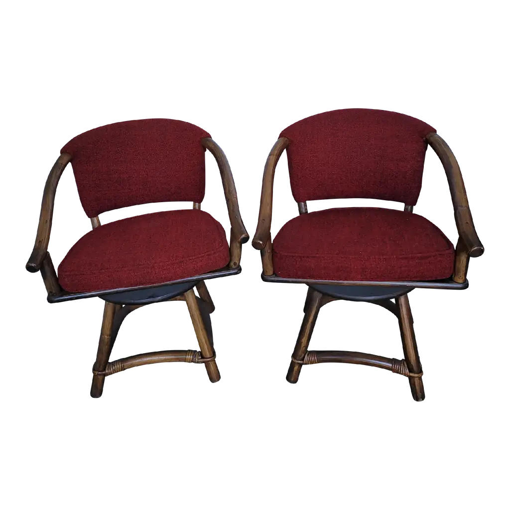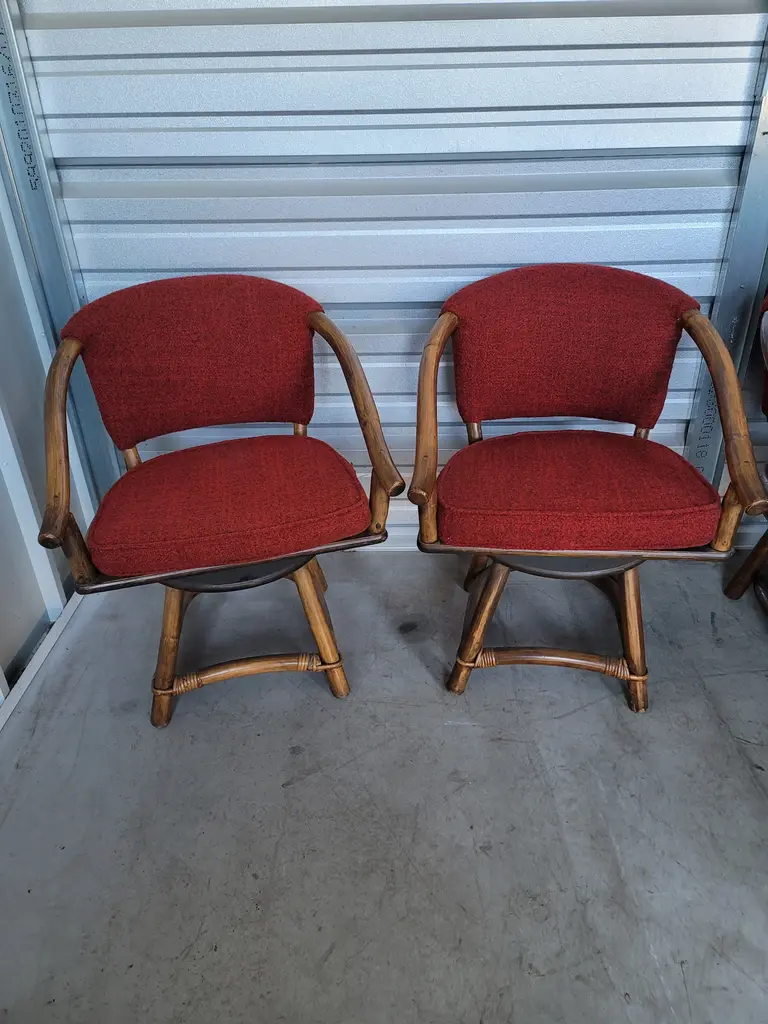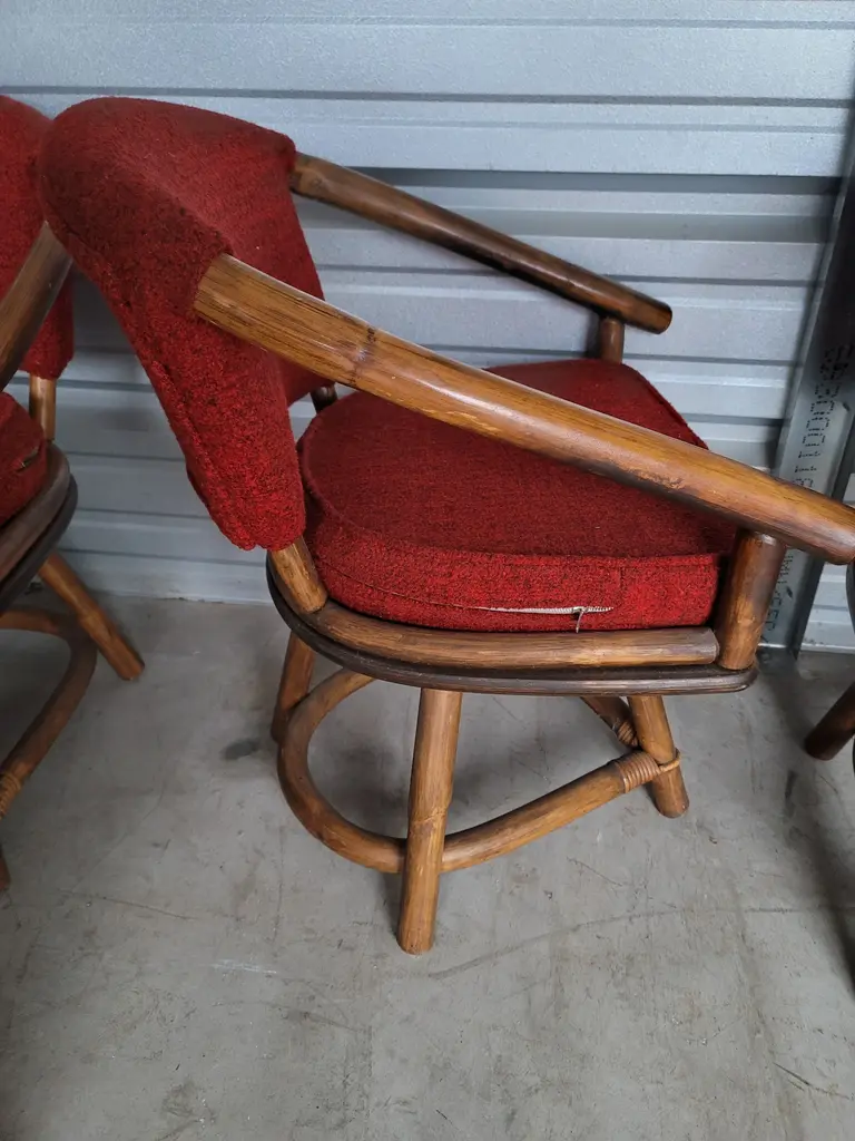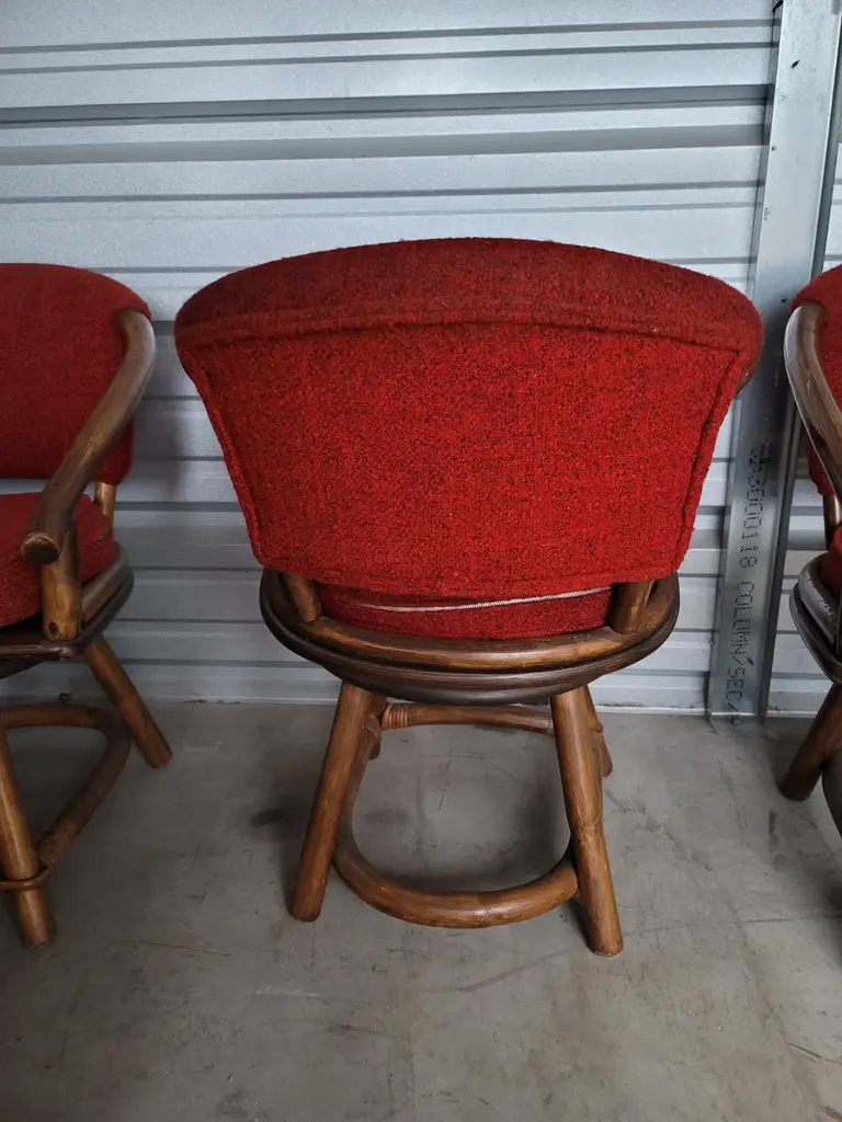 Vintage Eclectic Rattan Swivel Dining Chair Set Red Boucle Fabric By Ficks Reed