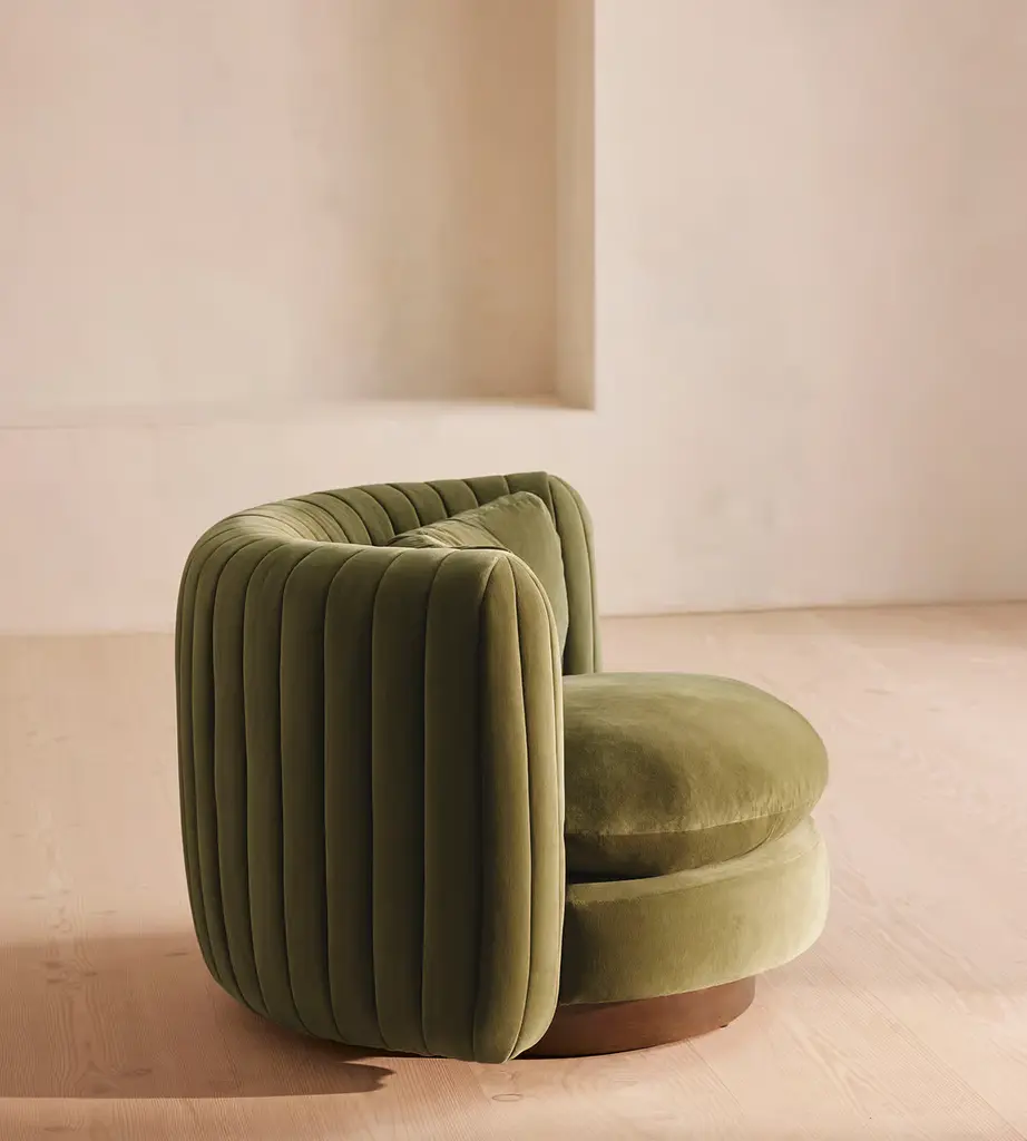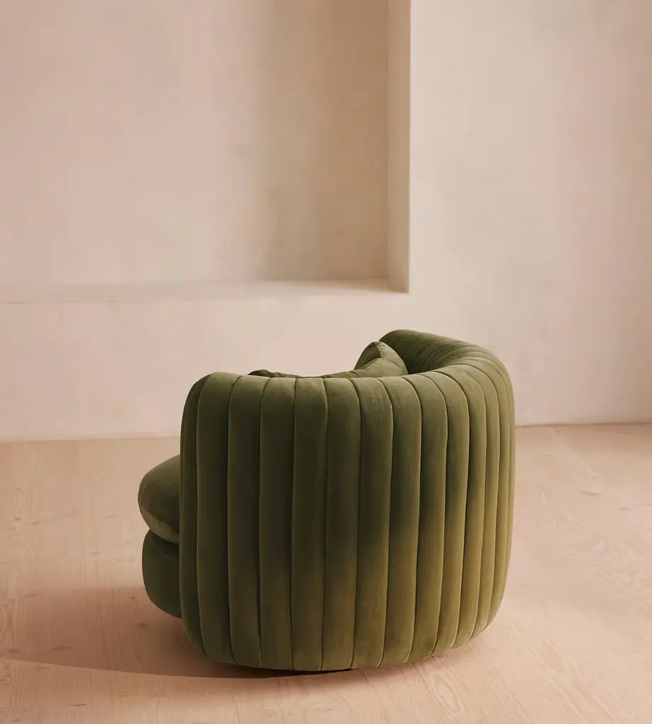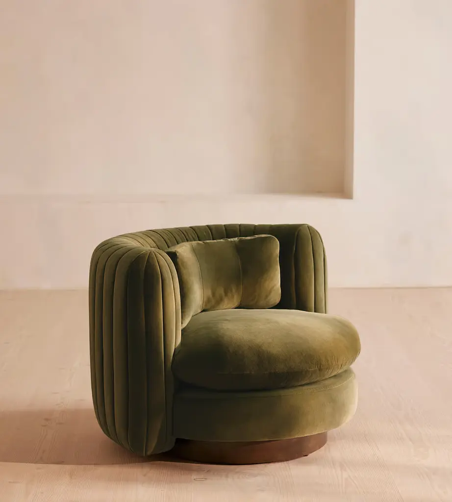 Our own take on the classic tub armchair with a wider, curved profile, a swivel base and rich velvet upholstery. An extension of our Vivienne furniture range, this accent armchair takes its inspiration from the interiors of White City House. Pleated stitch detailing to the back of the chair and a birch swivel base adds extra tactility and comfort.