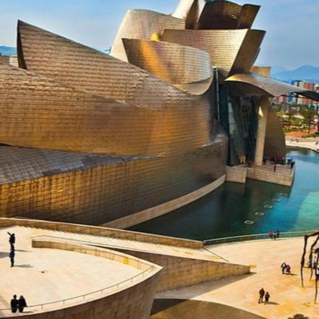 A Post Modern pair of Vladimir Kagan Bilbao swivel chairs freshly reupholstered in soft ivory bouclé circa 1995. Enamored with Bilbao, Spain, the Bilbao chair is a manifestation of Vladimir Kagan's impressions from his time spent on holiday. He was especially inspired by the Guggenheim Museum there (see photo) and mimicked those inspiring and powerful angles and curves into the Bilbao chair. Asymmetrical in every way. Angular sloped backs anchor the chair and swivel atop an upholstered circular disk base. Sexy curved wide seats calm the angles and help nestle you into that modern power position. High Art vibe. Ivory bouclé has a soft lovely texture and works in both warm and cool climates. Its texture lends well to ventilation. Want to see more beautiful things? Scroll down below and click "View All From Seller" or favorite our shop to get your 1stDibs on our new inventory. Photographed along with an Adrian Pearsall Mid-Century Modern walnut side table, also currently available in our shop.Documented in Period Publications & in Vladimir Kagan: A Lifetime of Avant-Garde Design Book ( see last photo).