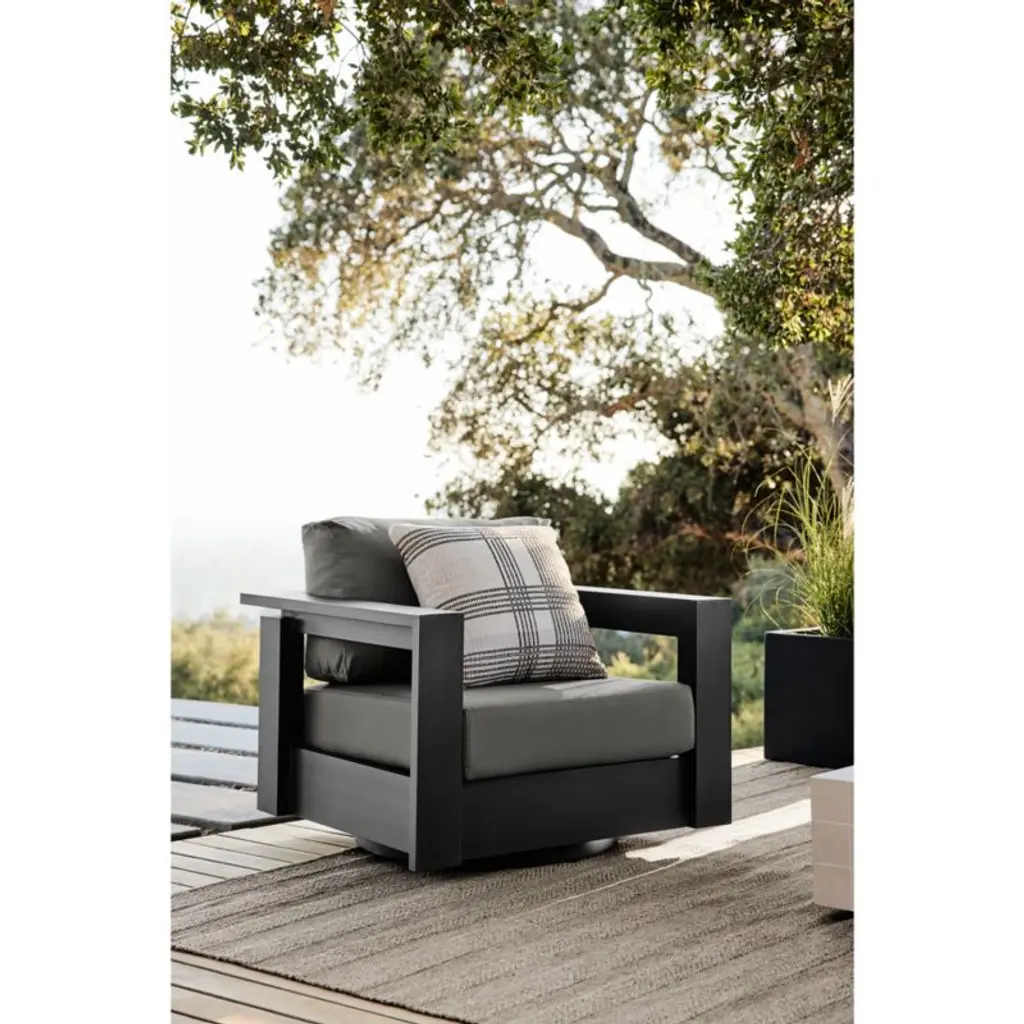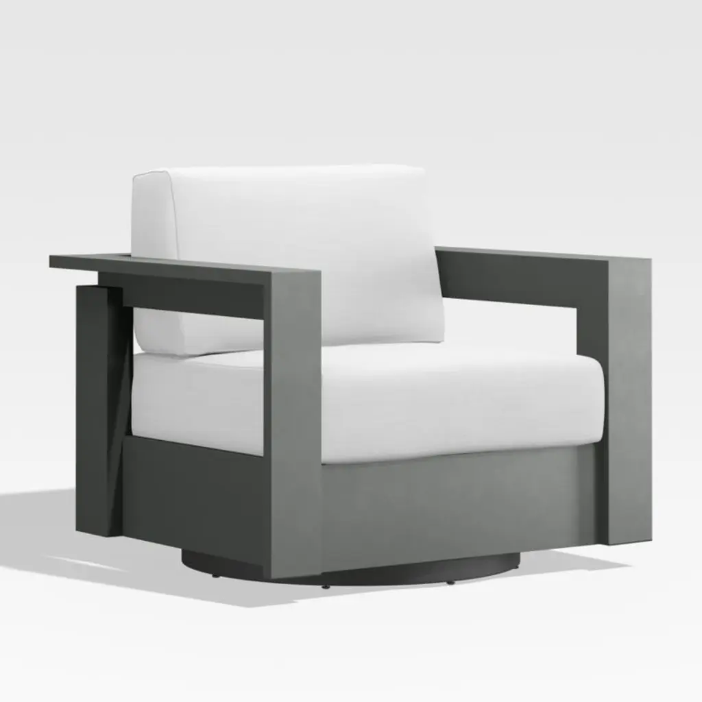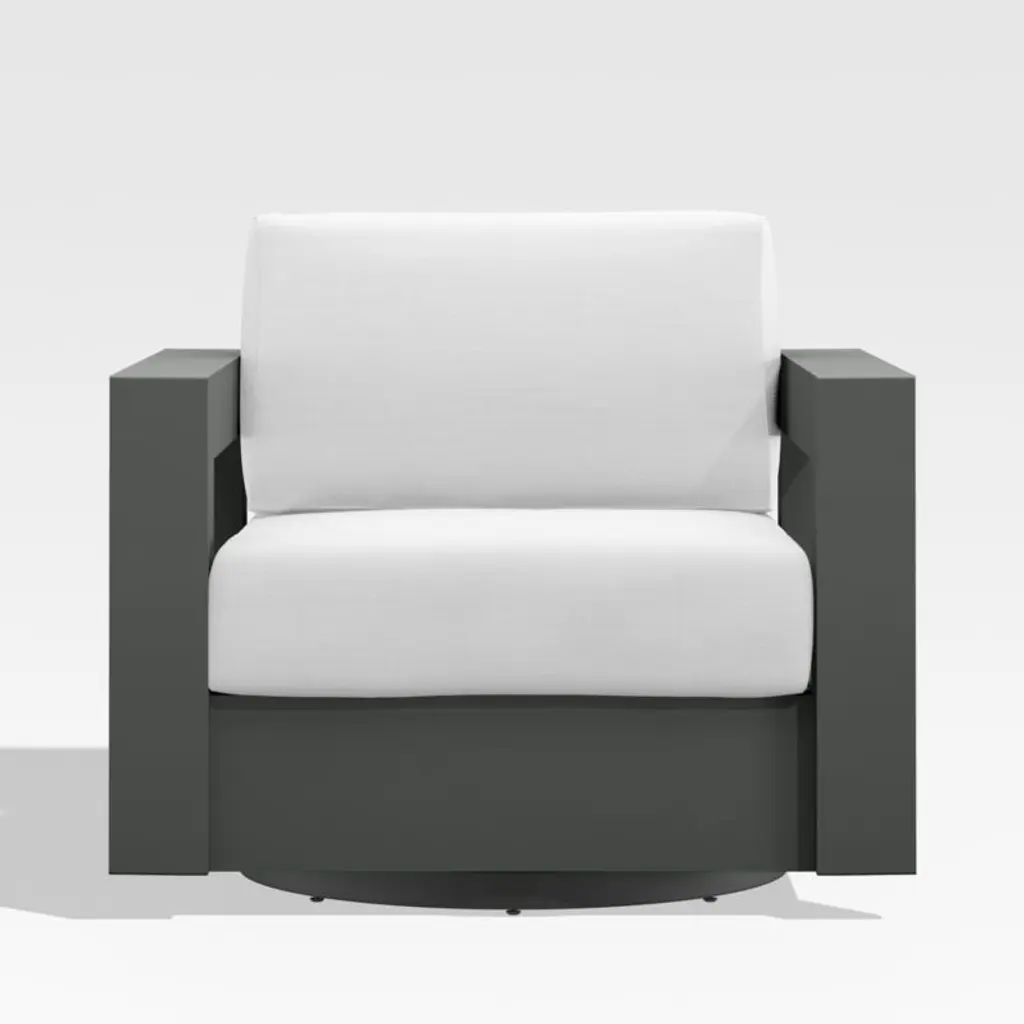 Well-made, great-looking and super comfortable. Our Walker outdoor collection is a customer favorite that checks all the boxes. Built to stand up to the elements, the swivel chair is made of rustproof aluminum treated with a durable and stylish matte powdercoat finish. Cushions in your color choice of stain-resistant Sunbrella fabric let you sink back and relax in deep-seated comfort. A modern classic, Walker is designed with architectural lines, wide armrests and recessed detailing.