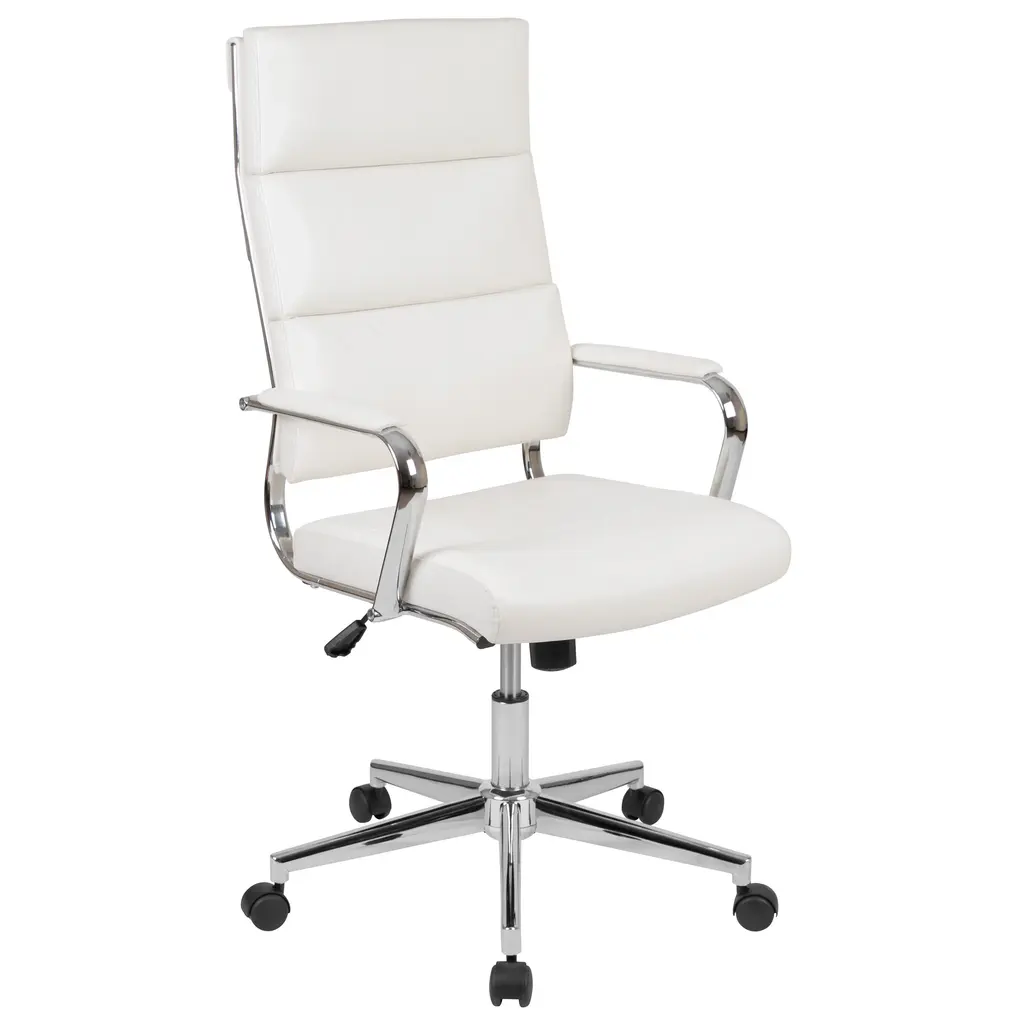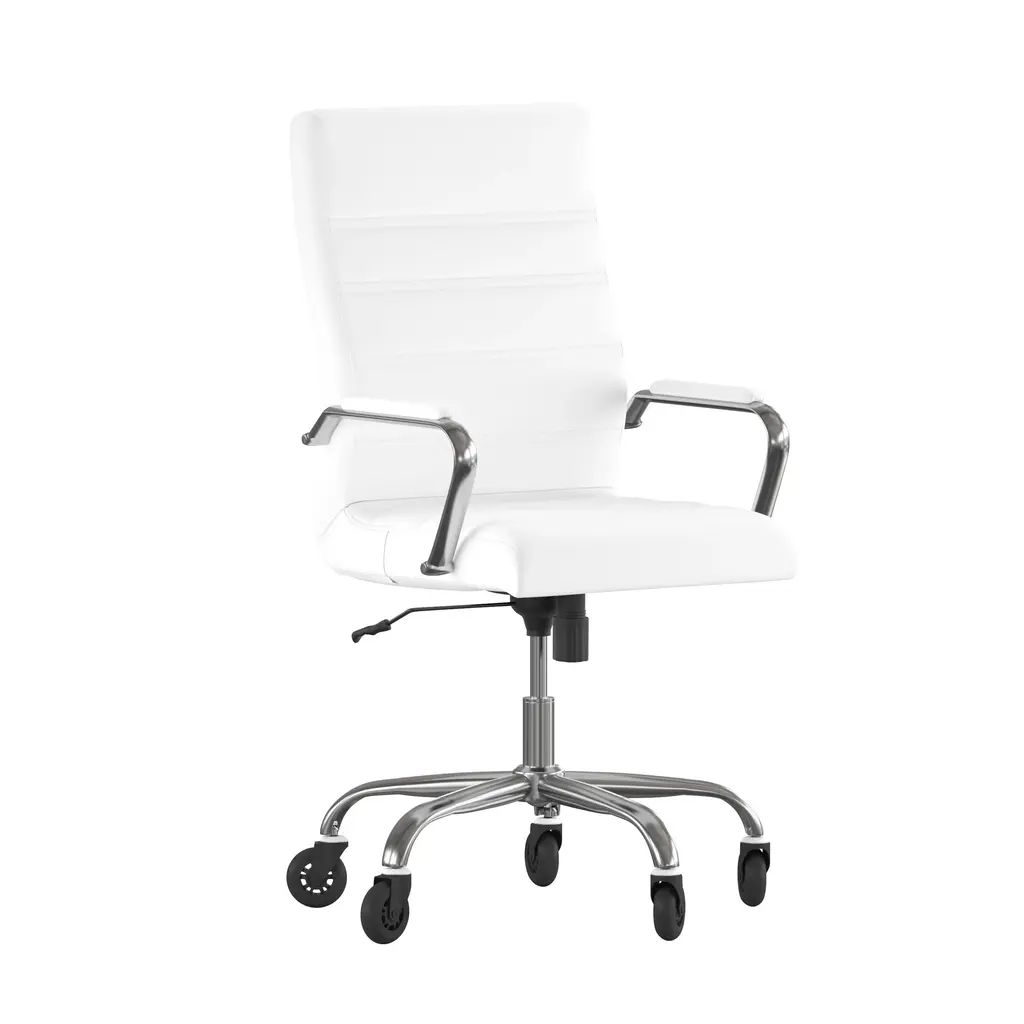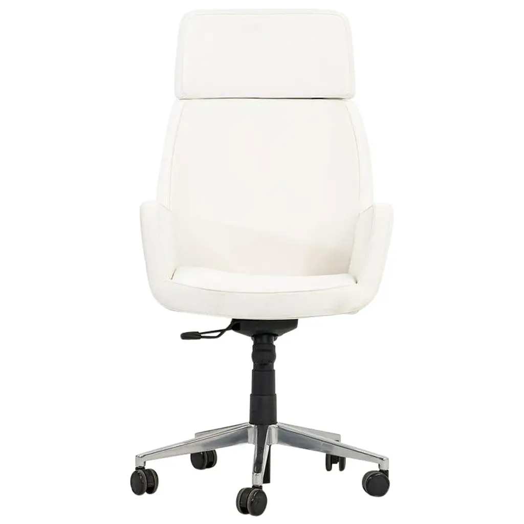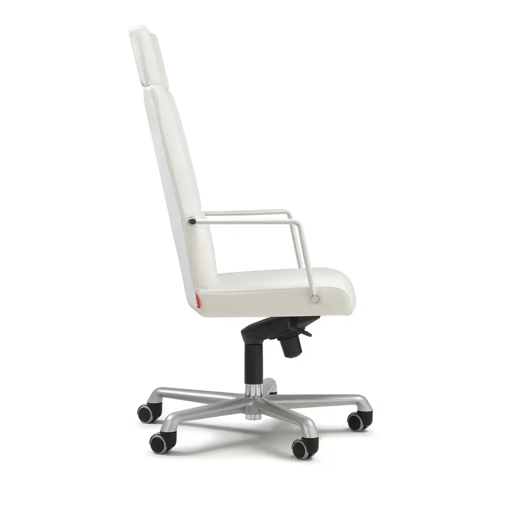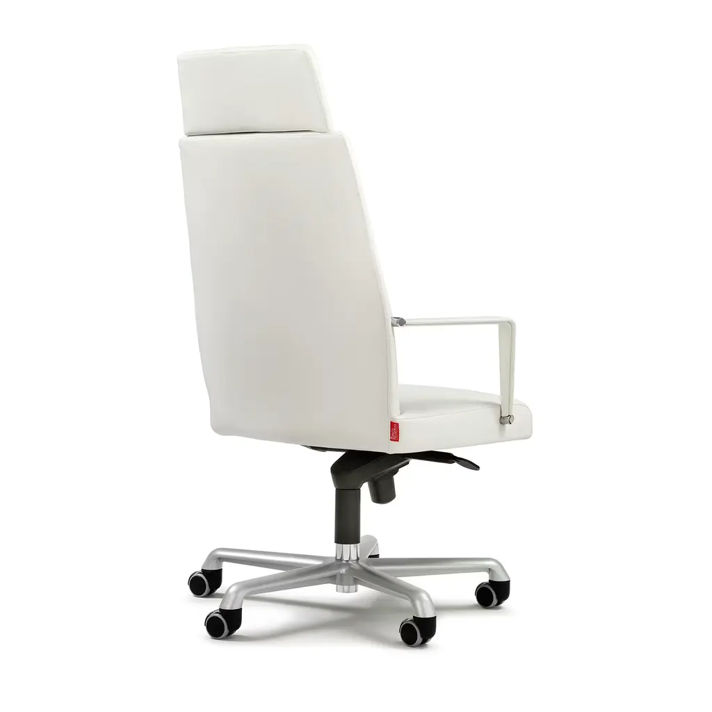 Swivel chair with headrest and arms. Inner steel frame, expanded polyurethane padding, covered with soft leather. Five-star base with gas seat height adjustment and tilt control mechanism (basic Synchro). All the components are available in other colors. Please contact the concierge for more information.