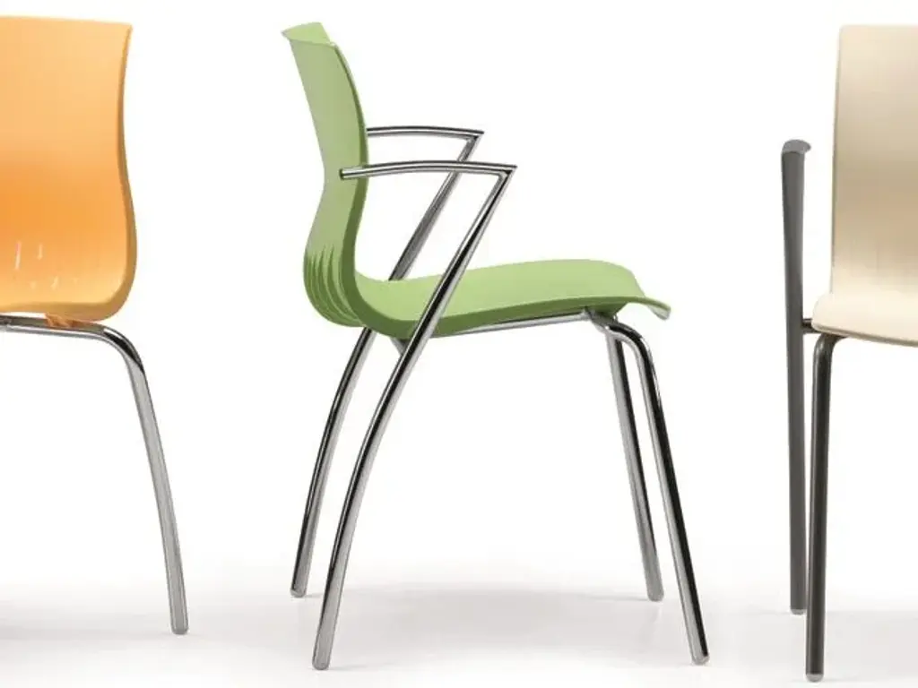 Webby 334 - Stackable plastic chair with armrests.Webby - Stacking Chairs, nylon F.R. monocoque available in various colors.Sled or 4 legs metal base with or without arms.For version Webplus body covered in F.R. interlaced flexible mesh.Available version with anti-panic writing tablet.Available Stool version and/or 4 legs with castors one.Available swivel version with gas lift and/or with tilt mechanism Compact-Line.Ideal for: conference rooms, meeting tables, schools, cafes, bars, office.Optional: Front panel padded and upholstered seat or seat and back, connecting ganging, left tablet, big size tablet for PC, transport dolly, floor metal bracket alignment.