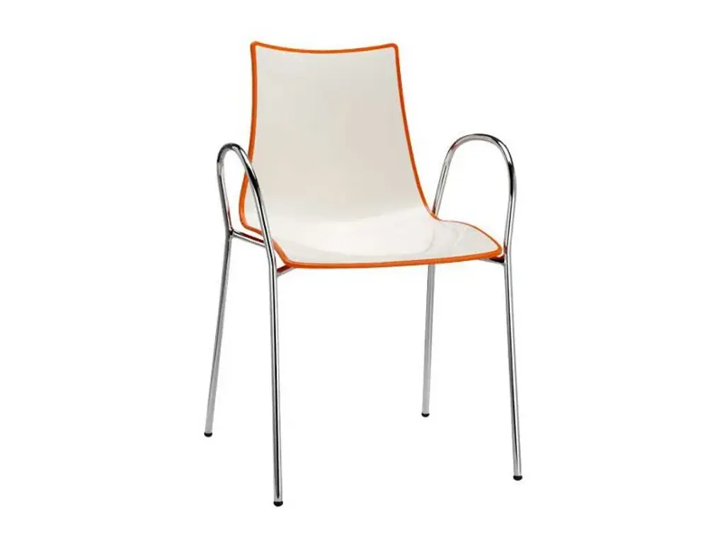 Webby 339 - Stackable plastic chair with armrests.Webby - Stacking Chairs, nylon F.R. monocoque available in various colors.Sled or 4 legs metal base with or without arms.For version Webplus body covered in F.R. interlaced flexible mesh.Available version with anti-panic writing tablet.Available Stool version and/or 4 legs with castors one.Available swivel version with gas lift and/or with tilt mechanism Compact-Line.Ideal for: conference rooms, meeting tables, schools, cafes, bars, office.Optional: Front panel padded and upholstered seat or seat and back, connecting ganging, left tablet, big size tablet for PC, transport dolly, floor metal bracket alignment.