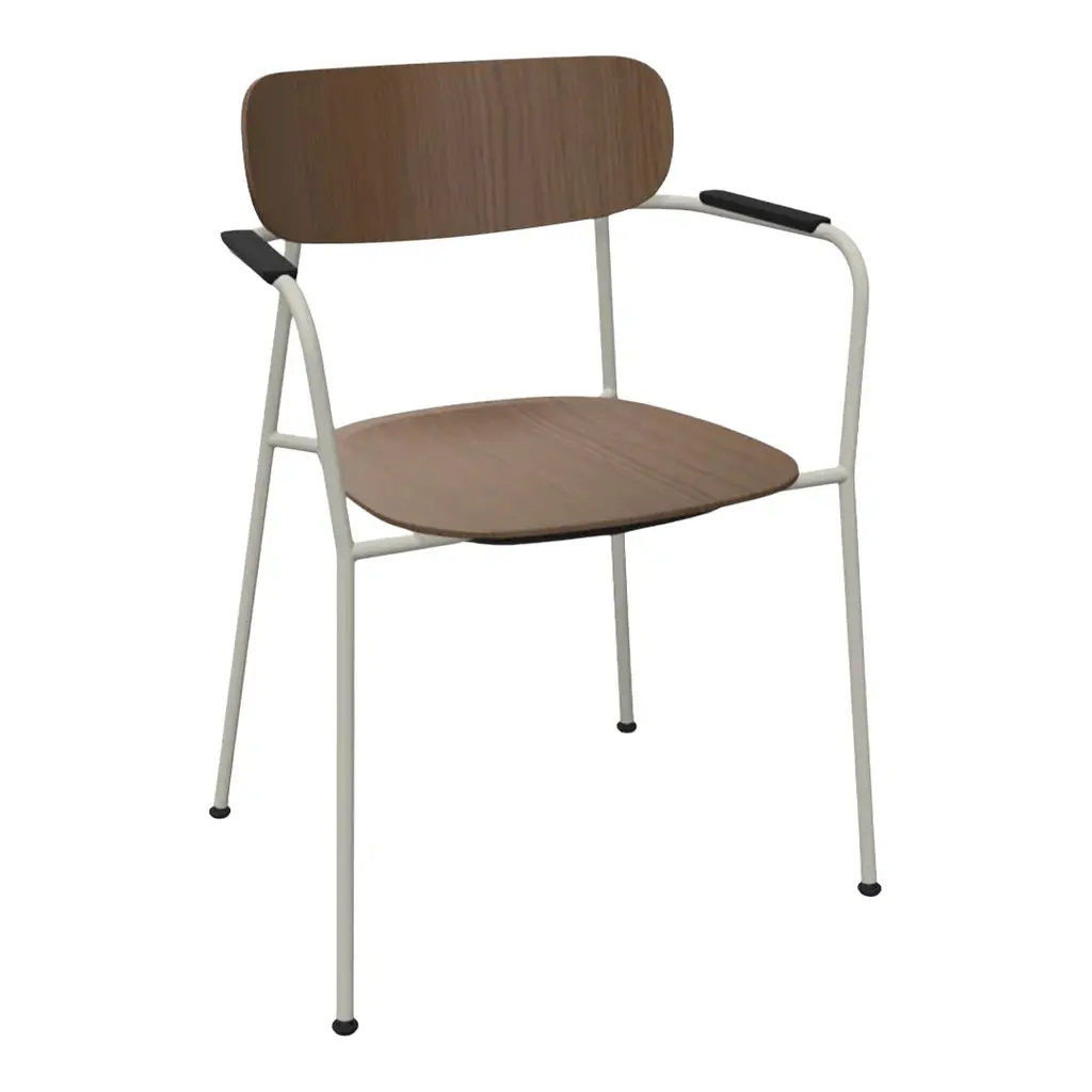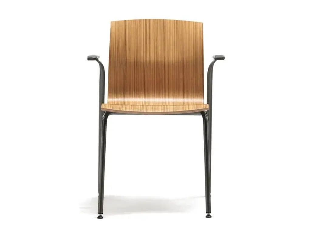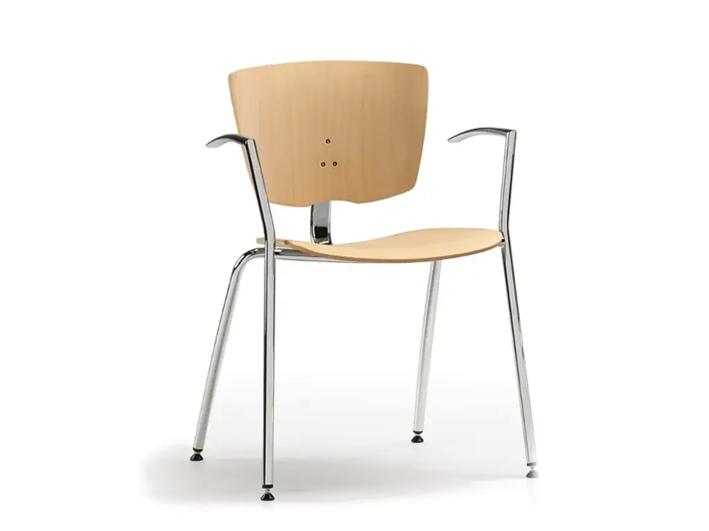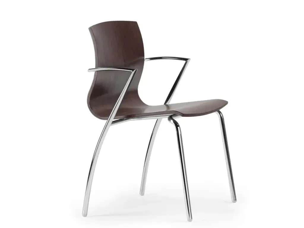 Webwood 359 - Multi-layer wood chair with armrests.Webwood - Beech plywood stacking chairs monocoque.Sled or 4 legs metal base with or without arms.For Webtop version shell is covered in saddle leather.Available version with anti-panic writing tablet.Available stool version and/or 4 legs with castors.Available swivel version with gas lift and/or with tilt mechanism Compact-Line.Ideal for: conference rooms, meeting tables, interior design, kitchen furniture, schools, cafes, bars, office.Optional: Front panel padded and upholstered seat or seat and back, fully upholstered shell, wenge' or zebrano plywood finish, connecting ganging, left tablet, big size tablet for PC, transport dolly, floor metal bracket alignment.
